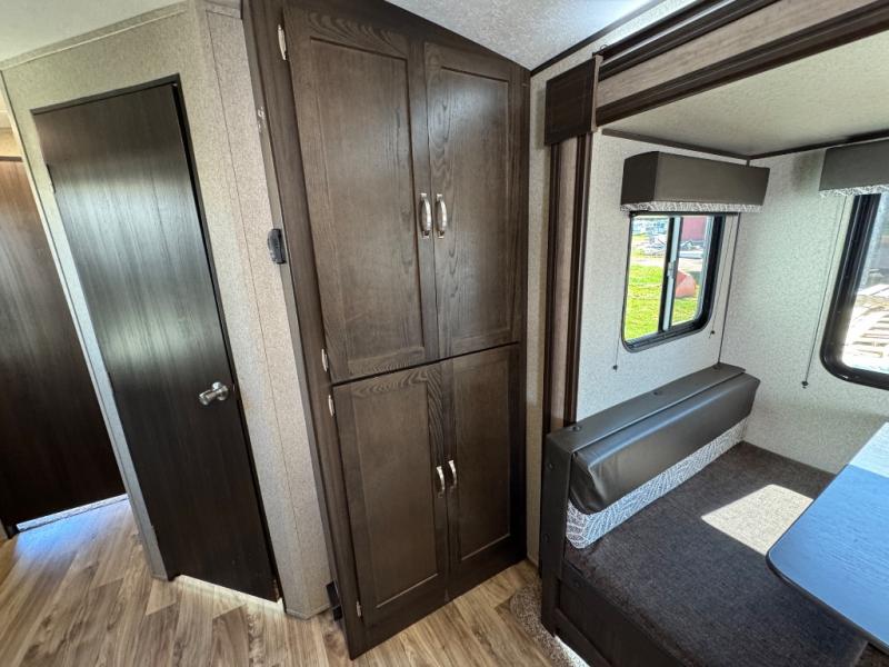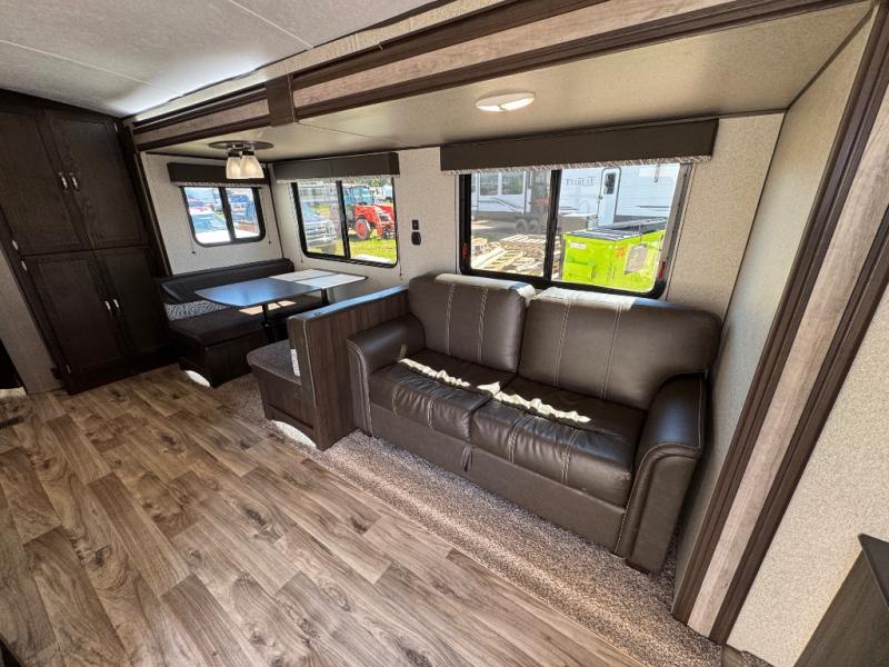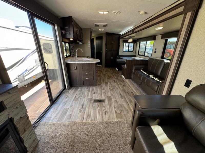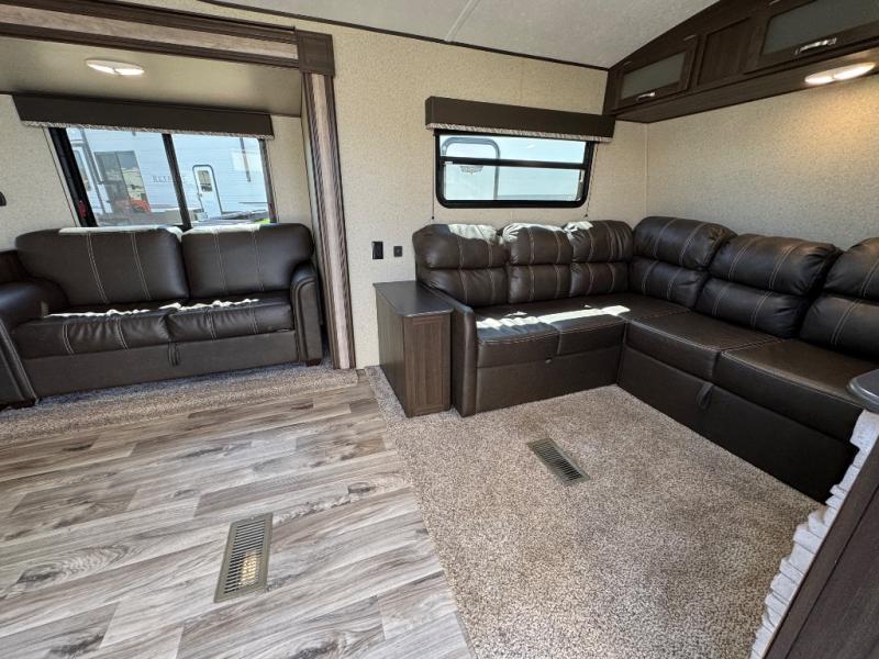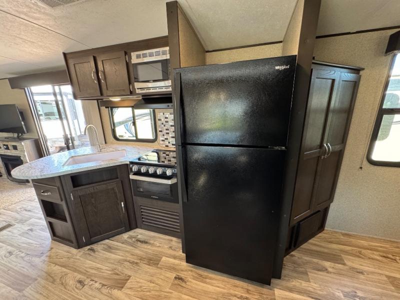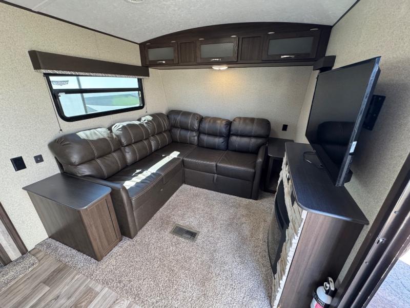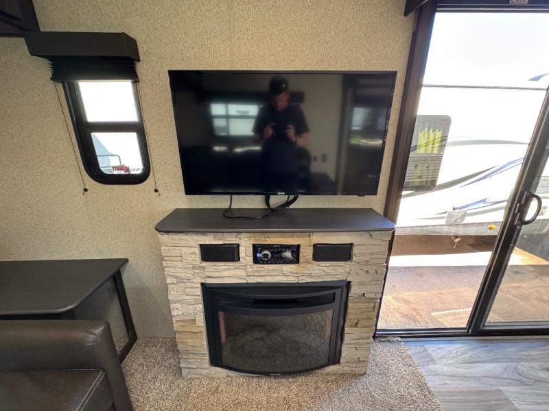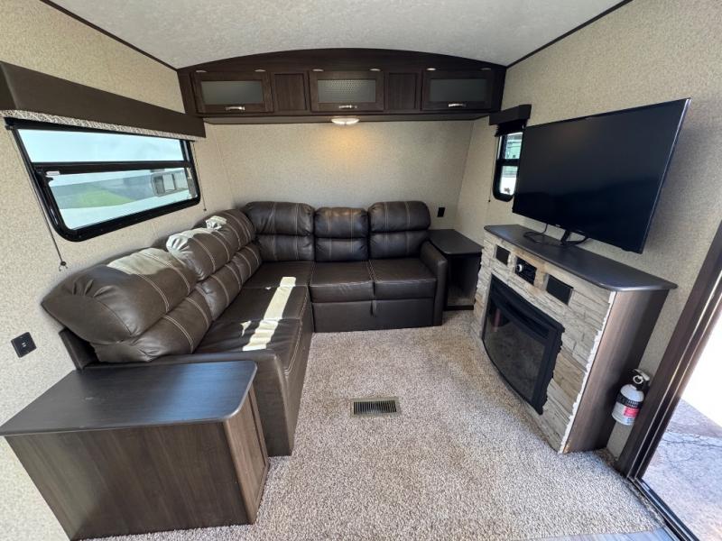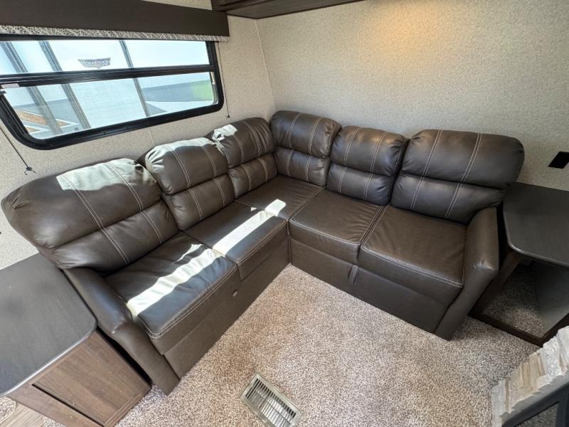 This spacious Keystone Springdale destination trailer allows you and your family or friends to escape to your favorite place be it the lake or the ranch. The front living area offers an L-shaped mega tri-fold sofa, an entertainment center, an LED TV and a fireplace making this area both cozy and comfortable. This is the perfect space to hang out and enjoy a conversation or a movie with family and friends. You will find more seating space in the slide out on the booth dinette and tri-fold sofa, both provide extra sleeping space as well. The kitchen offers all that you need to prepare and cook for your hungry crew for a weekend or longer. There is a large kitchen sink making cleaning up easy, a three-burner range for cooking your meals, and two pantries for dry good storage. And at night, you will have your own queen bed slide in the rear bedroom which offers storage and the second exterior entry for convenience.