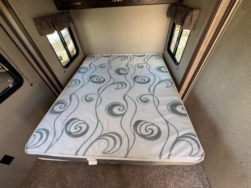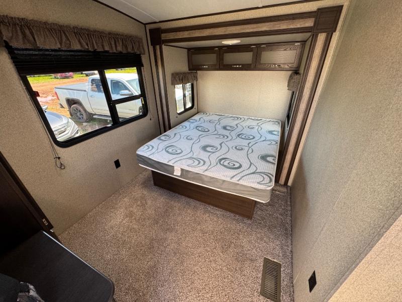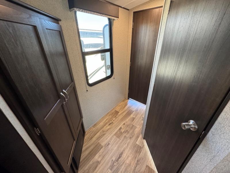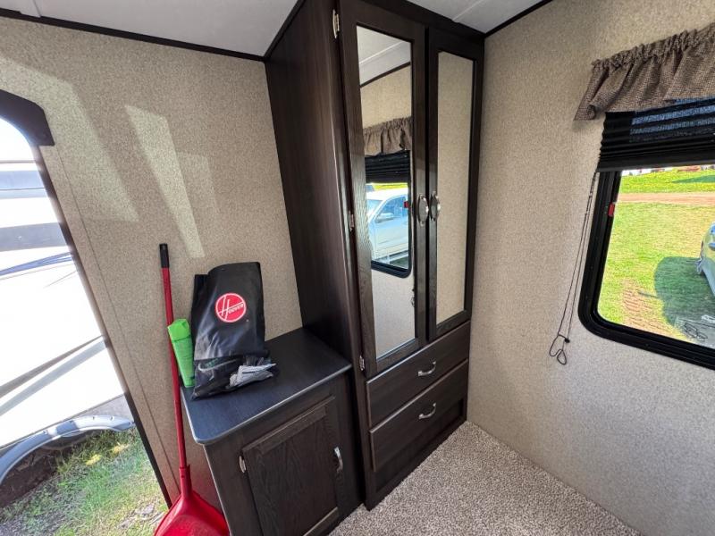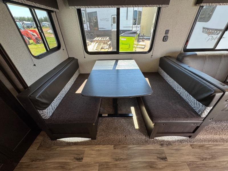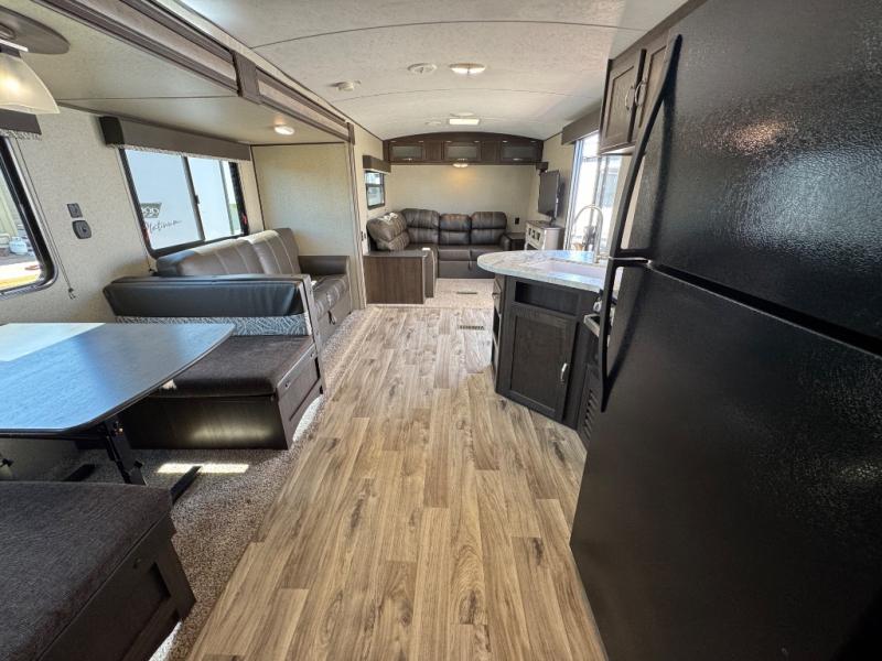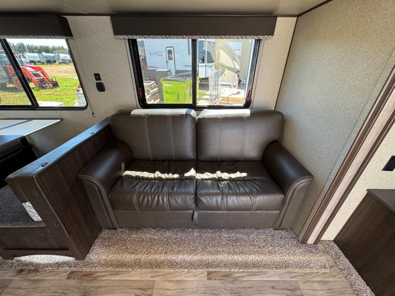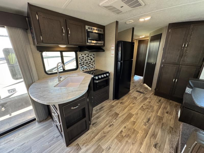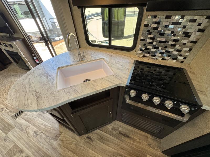 This spacious Keystone Springdale destination trailer allows you and your family or friends to escape to your favorite place be it the lake or the ranch. The front living area offers an L-shaped mega tri-fold sofa, an entertainment center, an LED TV and a fireplace making this area both cozy and comfortable. This is the perfect space to hang out and enjoy a conversation or a movie with family and friends. You will find more seating space in the slide out on the booth dinette and tri-fold sofa, both provide extra sleeping space as well. The kitchen offers all that you need to prepare and cook for your hungry crew for a weekend or longer. There is a large kitchen sink making cleaning up easy, a three-burner range for cooking your meals, and two pantries for dry good storage. And at night, you will have your own queen bed slide in the rear bedroom which offers storage and the second exterior entry for convenience.