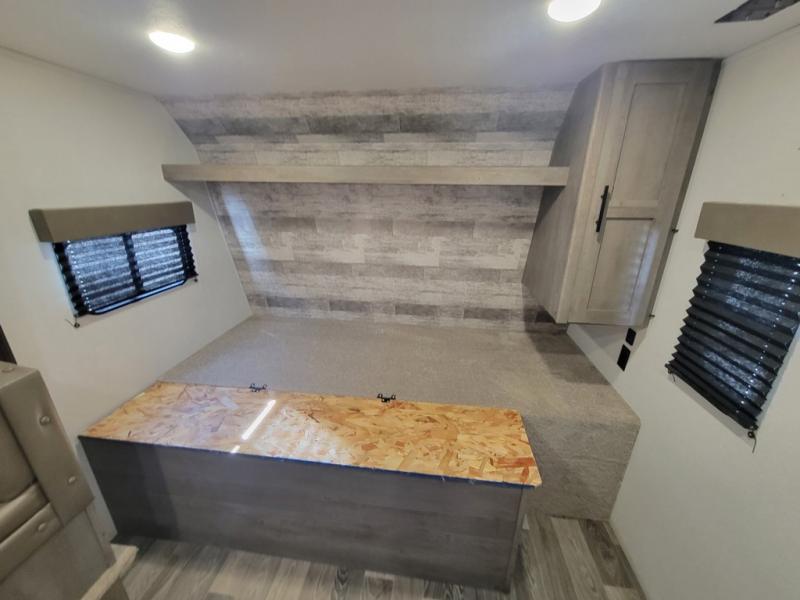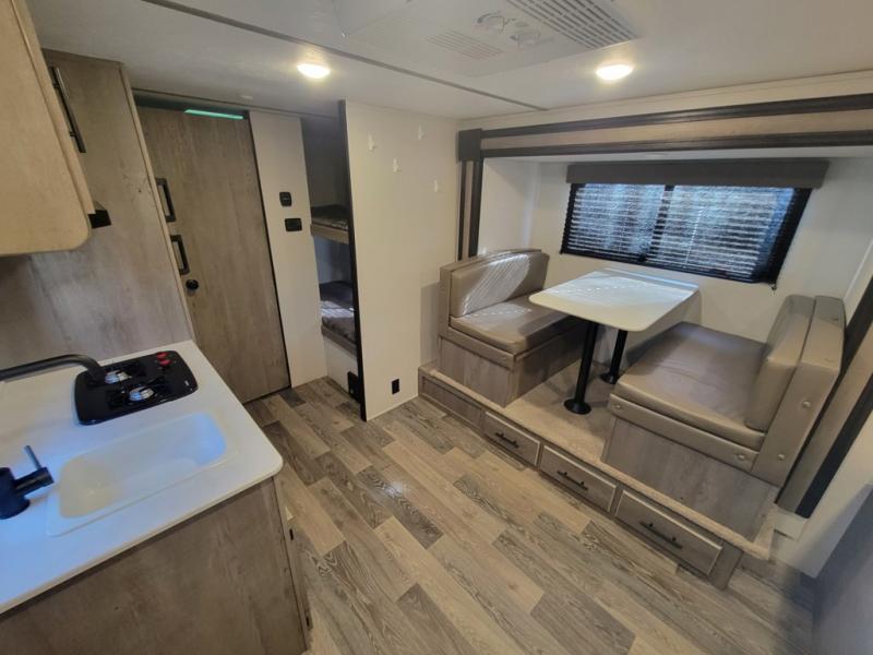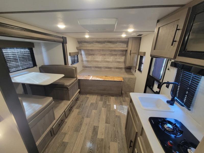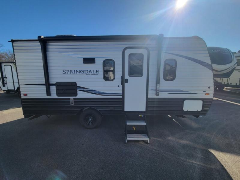 If you're ready for camping near or far, you will want an easy to tow, lightweight Keystone Springdale Mini travel trailer. These models include a power awning with LED lights, a pass-through storage compartment for all your gear, and LCI SolidStep entry steps for your convenience. The interior is made bright and open with a Whitewashed brick accent wall, larger windows, and lighter vinyl flooring throughout. You will find many convenient storage solutions, such as wall-mounted cargo nets next to each USB port for your tablet, camera, or phone, two shelves above the bed for your books, and easy access storage under the sofa or bunks where applicable. These travel trailers also include safety measures for your peace of mind, including GFI receptacles, smoke and carbon monoxide detectors, a fire extinguisher, plus more!