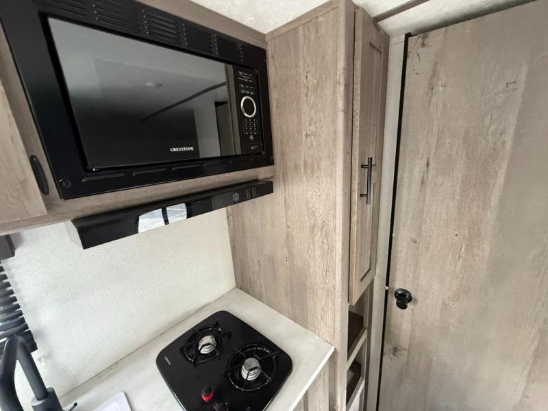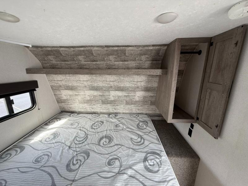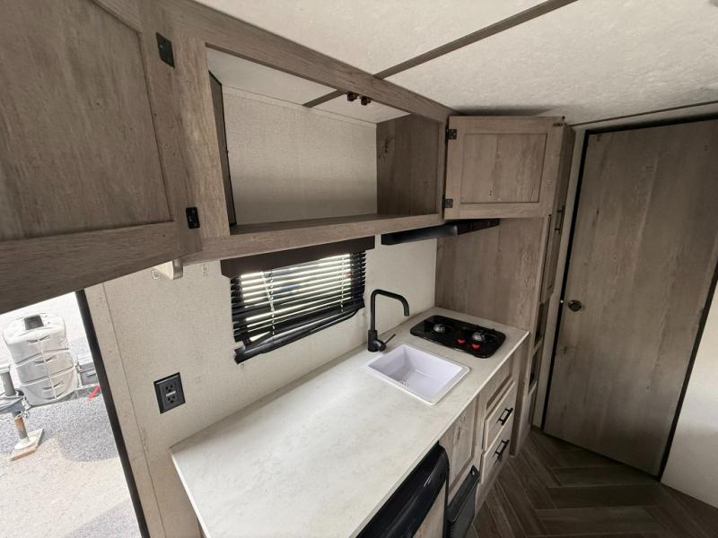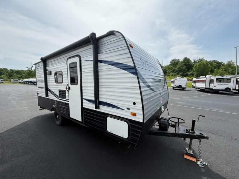 If you're ready for camping near or far, you will want an easy to tow, lightweight Keystone Springdale Mini travel trailer. These models include a power awning with LED lights, a pass-through storage compartment for all your gear, and LCI SolidStep entry steps for your convenience. The interior is made bright and open with a Whitewashed brick accent wall, larger windows, and lighter vinyl flooring throughout. You will find many convenient storage solutions, such as wall-mounted cargo nets next to each USB port for your tablet, camera, or phone, two shelves above the bed for your books, and easy access storage under the sofa or bunks where applicable. These travel trailers also include safety measures for your peace of mind, including GFI receptacles, smoke and carbon monoxide detectors, a fire extinguisher, plus more!