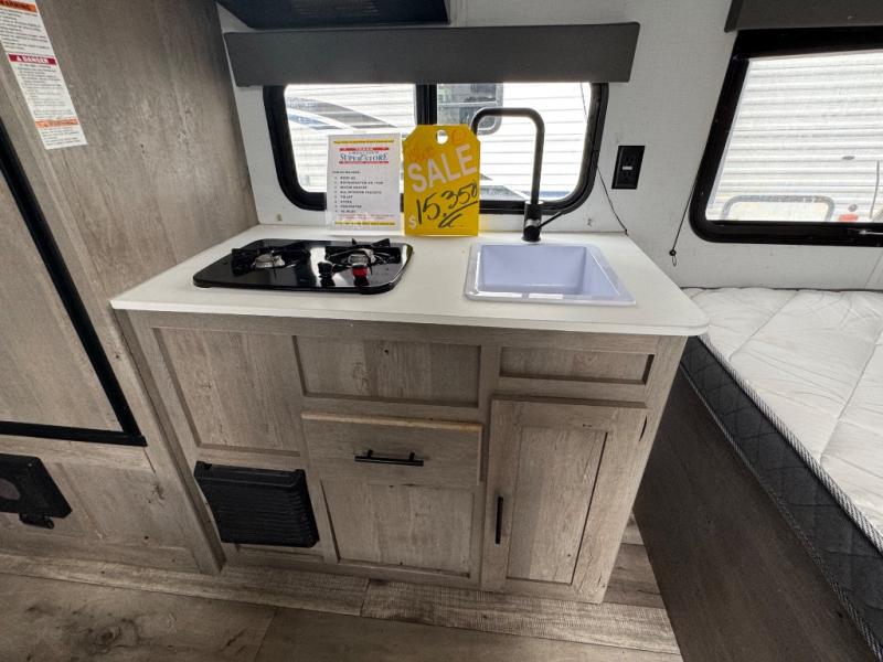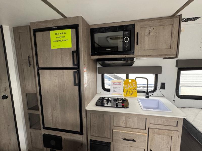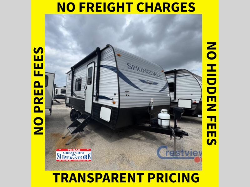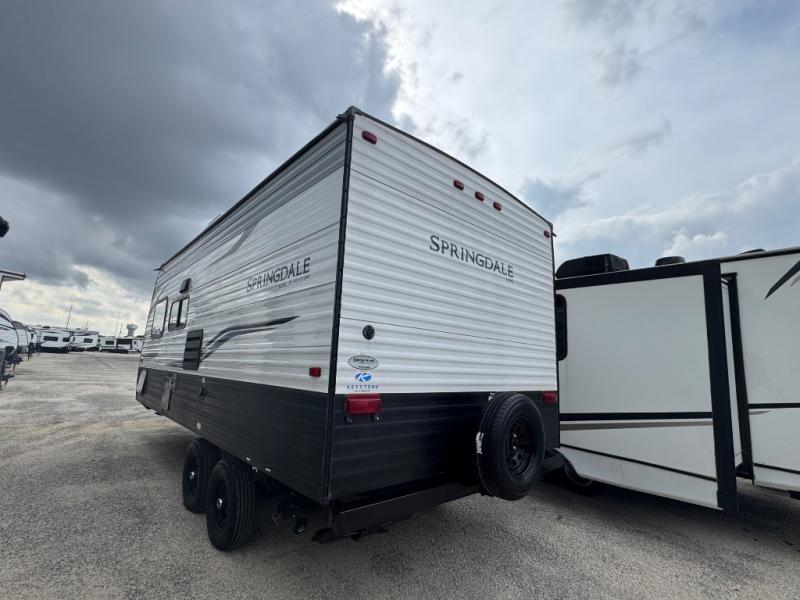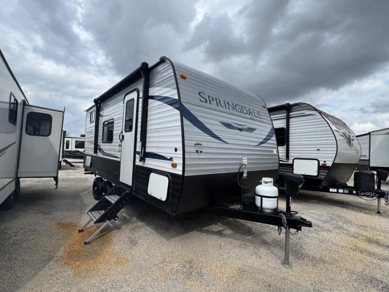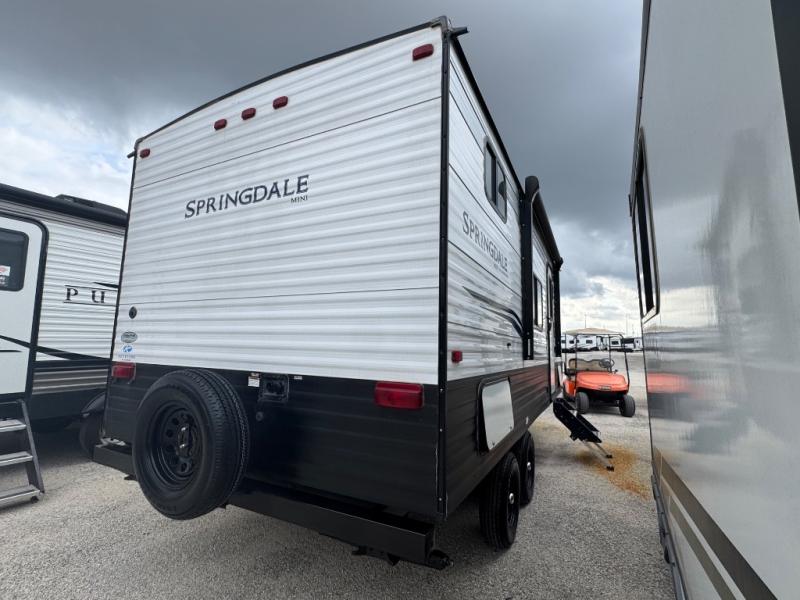 If you're ready for camping near or far, you will want an easy to tow, lightweight Keystone Springdale Mini travel trailer. These models include a power awning with LED lights, a pass-through storage compartment for all your gear, and LCI SolidStep entry steps for your convenience. The interior is made bright and open with a Whitewashed brick accent wall, larger windows, and lighter vinyl flooring throughout. You will find many convenient storage solutions, such as wall-mounted cargo nets next to each USB port for your tablet, camera, or phone, two shelves above the bed for your books, and easy access storage under the sofa or bunks where applicable. These travel trailers also include safety measures for your peace of mind, including GFI receptacles, smoke and carbon monoxide detectors, a fire extinguisher, plus more!