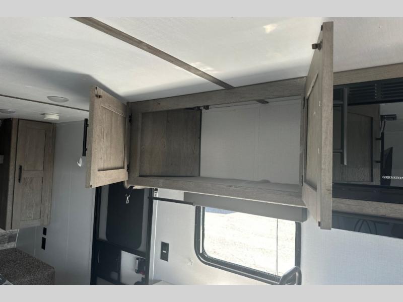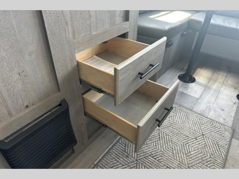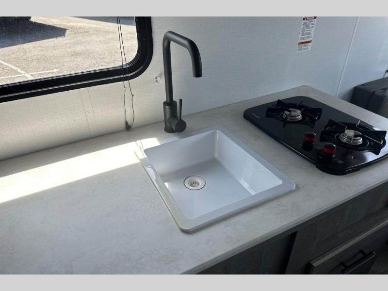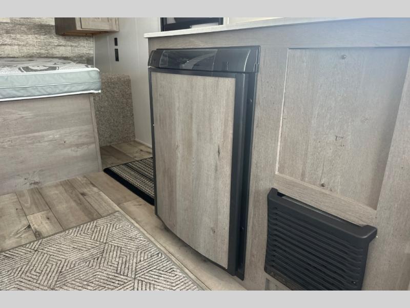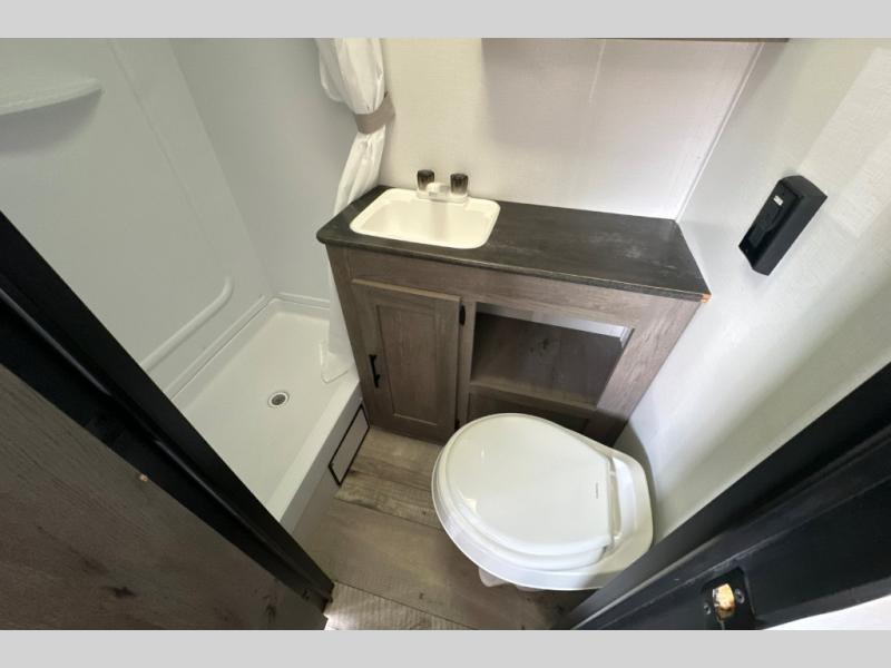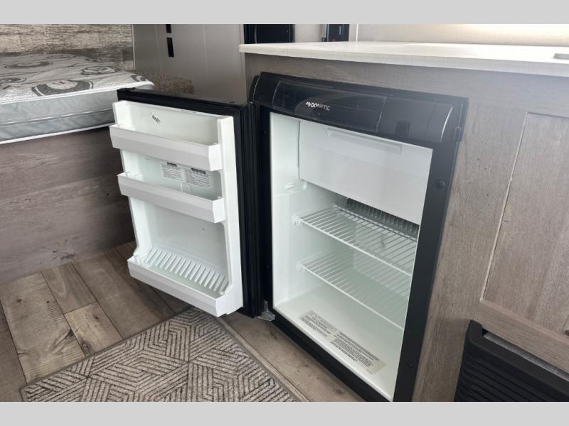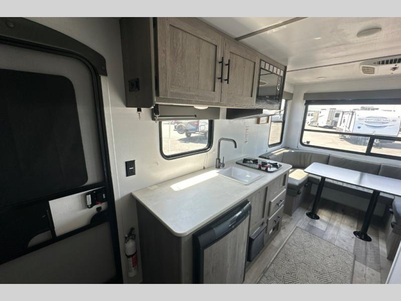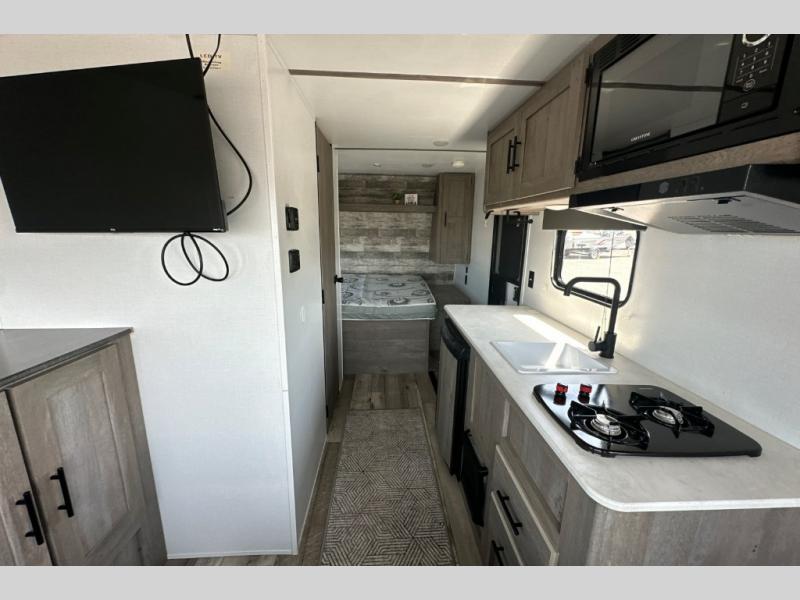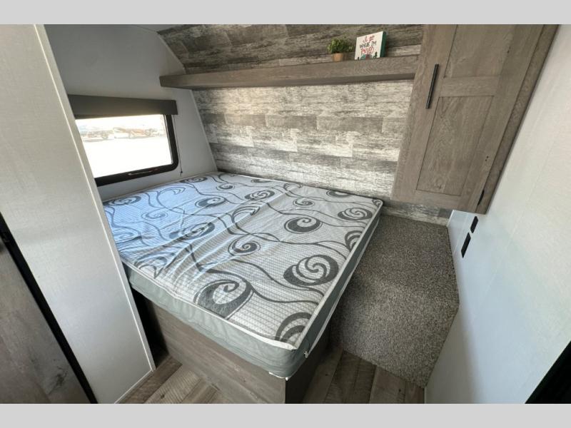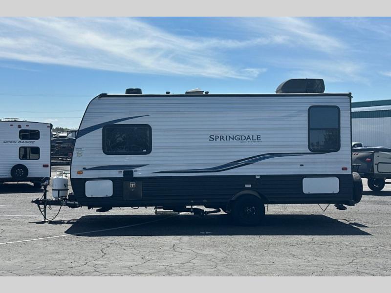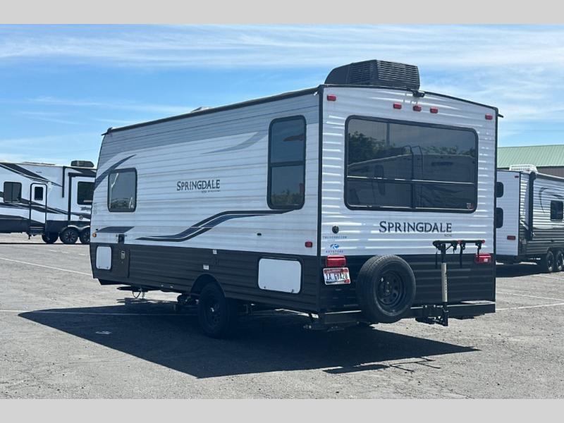 If you're ready for camping near or far, you will want an easy to tow, lightweight Keystone Springdale Mini travel trailer. These models include a power awning with LED lights, a pass-through storage compartment for all your gear, and LCI SolidStep entry steps for your convenience. The interior is made bright and open with a Whitewashed brick accent wall, larger windows, and lighter vinyl flooring throughout. You will find many convenient storage solutions, such as wall-mounted cargo nets next to each USB port for your tablet, camera, or phone, two shelves above the bed for your books, and easy access storage under the sofa or bunks where applicable. These travel trailers also include safety measures for your peace of mind, including GFI receptacles, smoke and carbon monoxide detectors, a fire extinguisher, plus more!