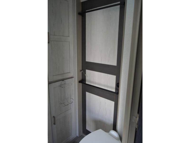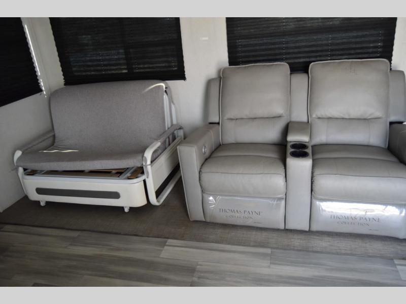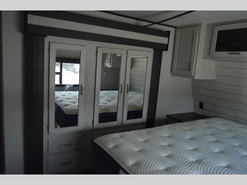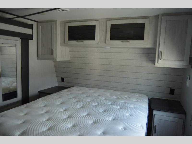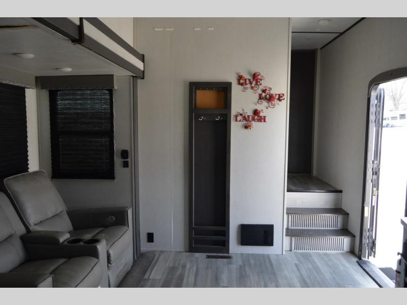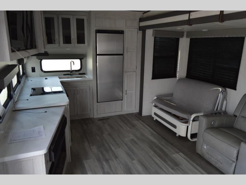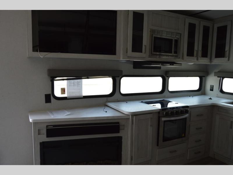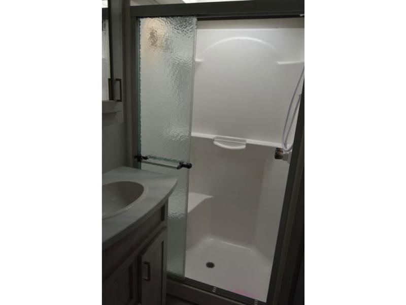 The perfect couples trailer with an open floorplan, a rear kitchen, a mid-living area and a private bedroom. You can relax in the full reclining theater seats to watch the 40" LED HDTV with a fireplace/heater below and play games at the booth dinette or choose the free standing dinette option if you prefer that type of seating. The rear kitchen offers a pantry to hold all your dry goods, an 8 cu. ft. refrigerator or choose the 10 cu. ft. option, a range with glass top, a microwave, a large kitchen sink, and plenty of counter space that the cook will enjoy. When it's time for bed, the full bathroom with a residential shower with a seat will keep you refreshed and the double entry doors allow easy access from the bedroom or the hallway. And don't forget about the triple slides providing lots of floor space, the exterior storage for your outdoor gear, and more!