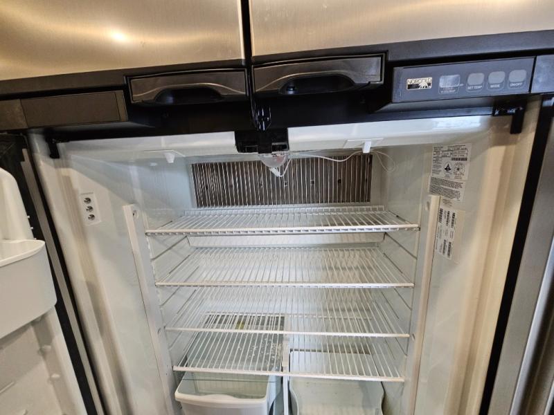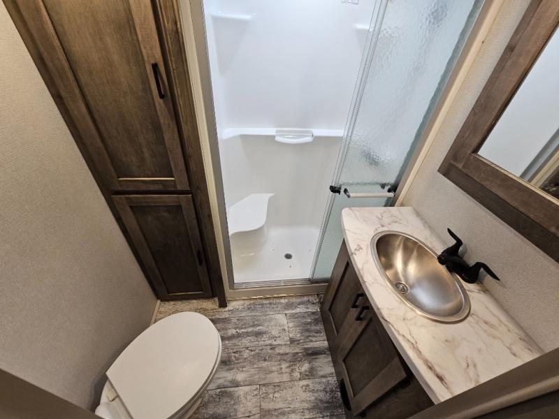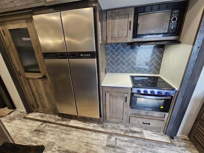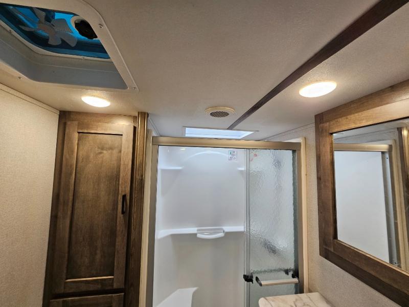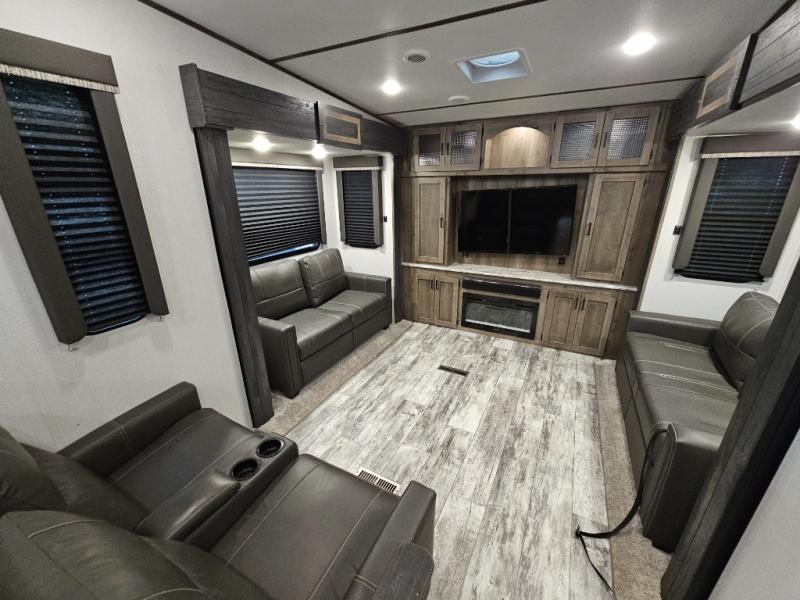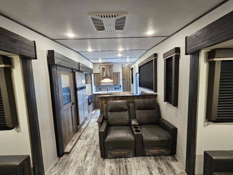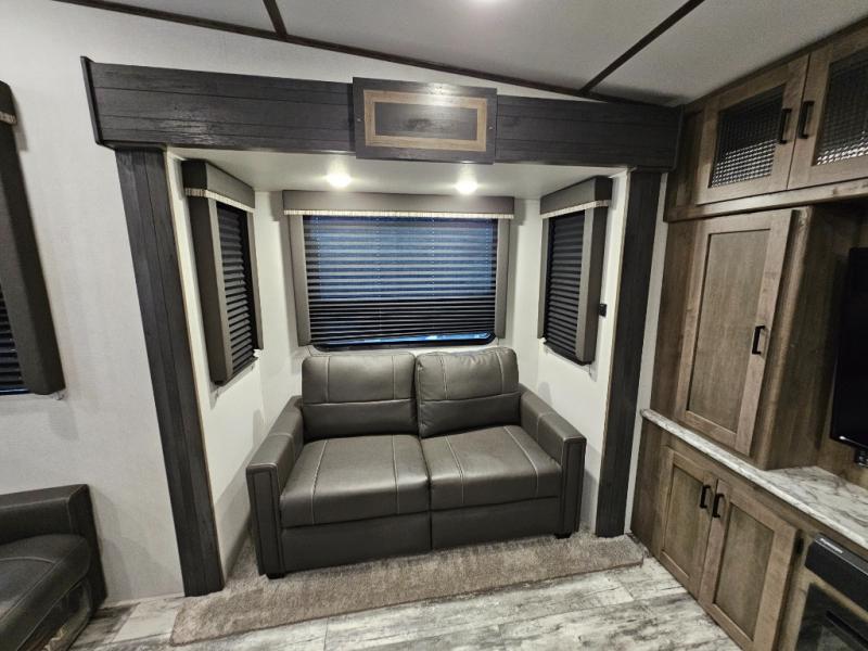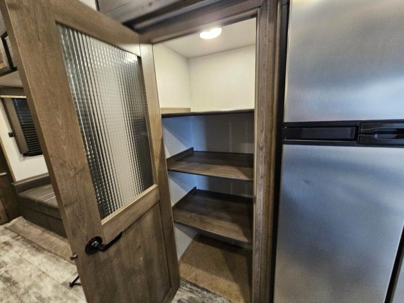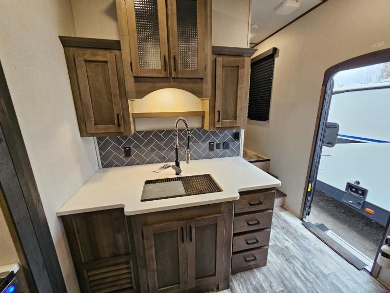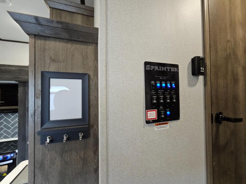 Once you step inside this Sprinter Limited fifth wheel, you won't want to camp any other way! The front private bedroom features a king-size bed with outlets on either side so that you can keep your electronics charged and a mirrored wardrobe with a closet next to it that is prepped for you to add the optional washer and dryer. The full bathroom is equipped with everything you need to get squeaky clean each morning including a seat in the residential shower and a linen closet, plus there is a skylight above the shower for added natural lighting. With a large kitchen pantry, everyone can bring along their favorite snacks and enjoy eating them while they sit back on one of the two tri-fold sofas or full reclining theater seating while watching a movie on the 50" TV!