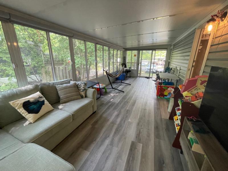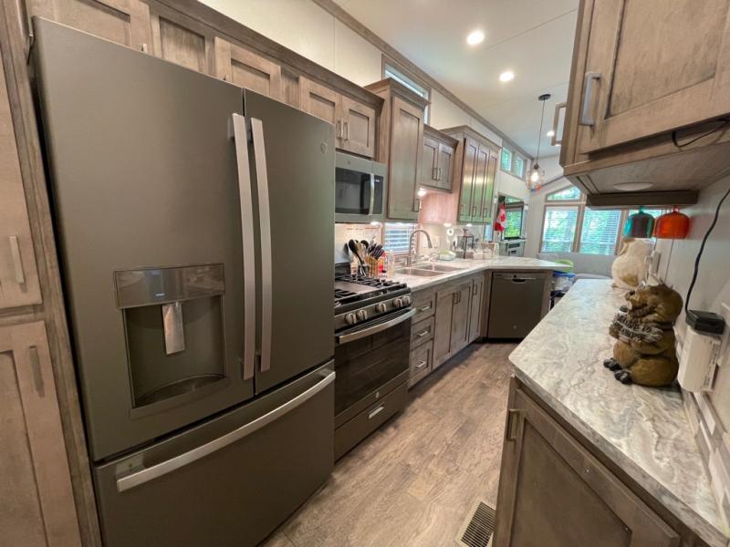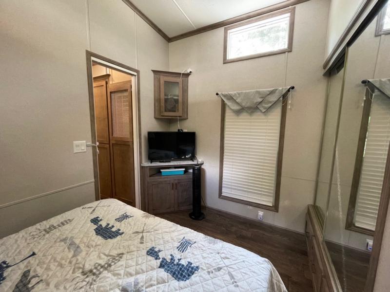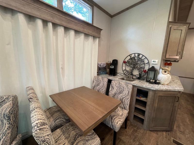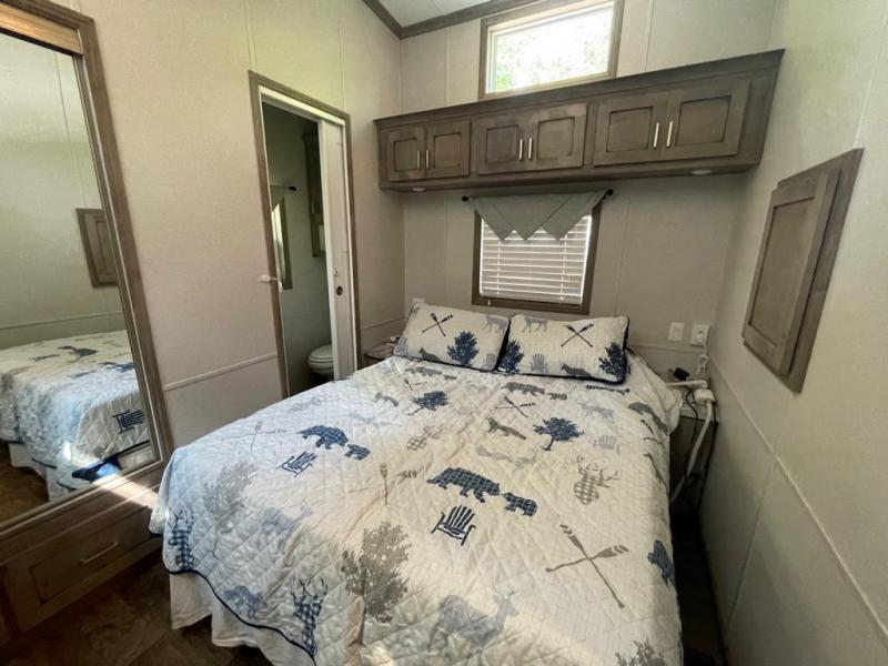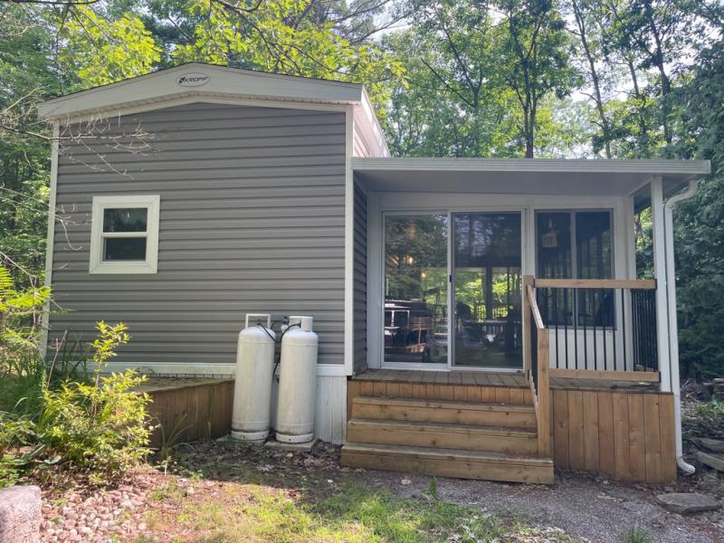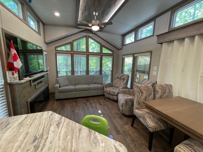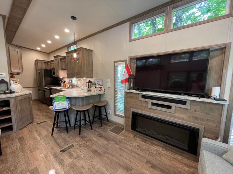 2021 Kropf Park Model in the Park | 2 Bedrooms + 2 Bathrooms2021 Kropf luxury park model on site 45. Located in a quiet lot overlooking the forest but close to all park events. This unit has a large 10'3" x 26' Florida room for additional living space including cordless blinds (2023). It also gives access to the back deck, wrap around partially covered deck with double stair access. Head inside to an open concept dining and living space with an electric fireplace and 2 pull out couches. Large galley kitchen with tons of storage and full size appliances including a dishwasher. Customized bar area including sink and beverage fridge. There is a 4pc bathroom for guests to use! Bunk room with a double and single bed for the family. At the end of the hall find the queen bed master suite with built in storage and a 2pc ensuite bathroom. Outside there is a 8' x10' shed (2022). Upgraded electrical, wifi enabled. Comfortably sleeps 9.