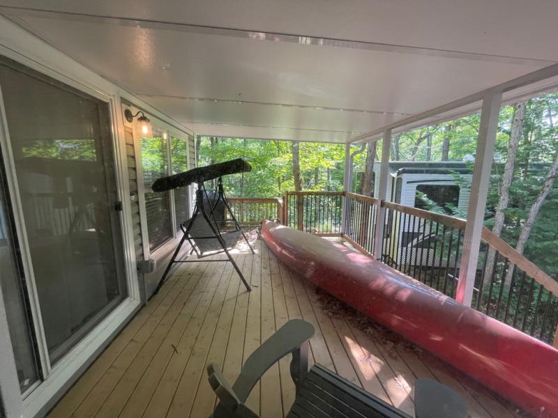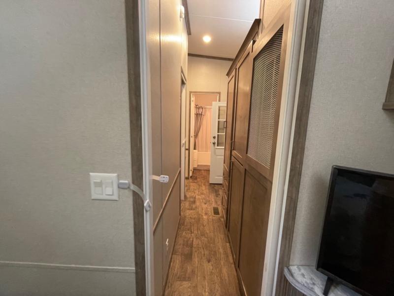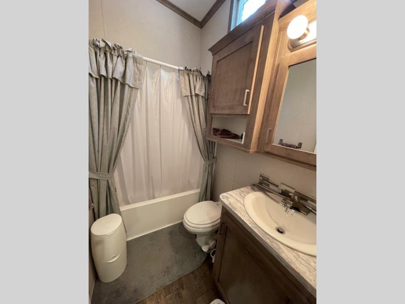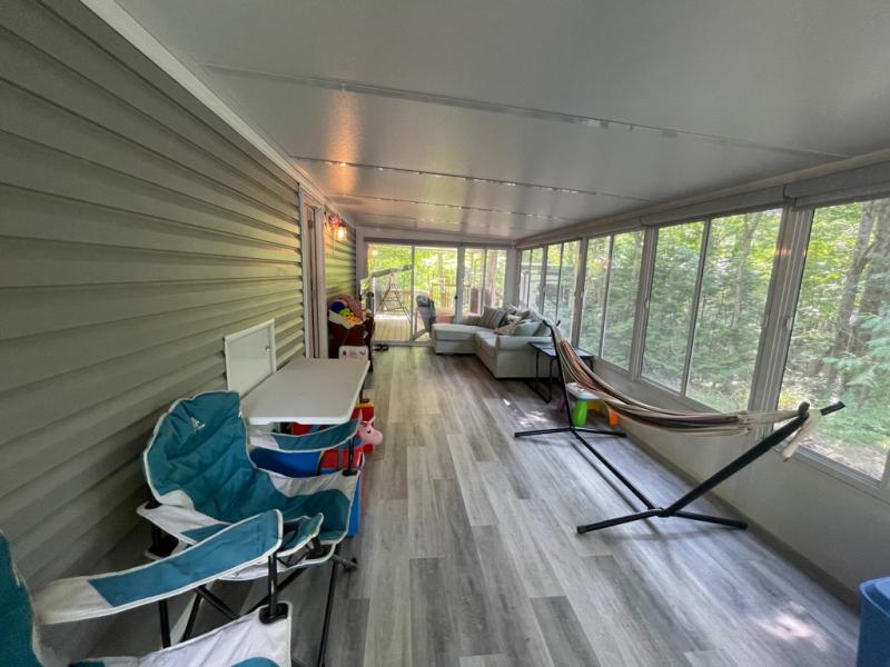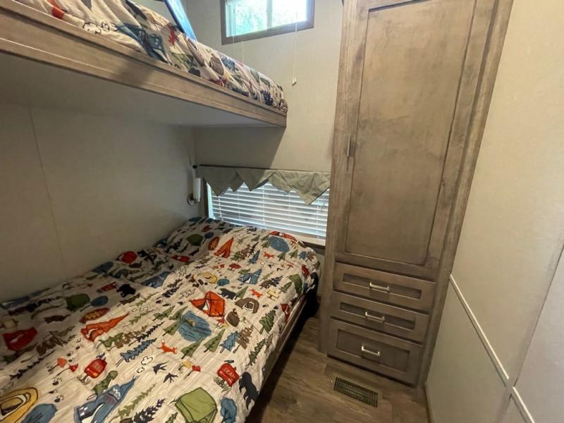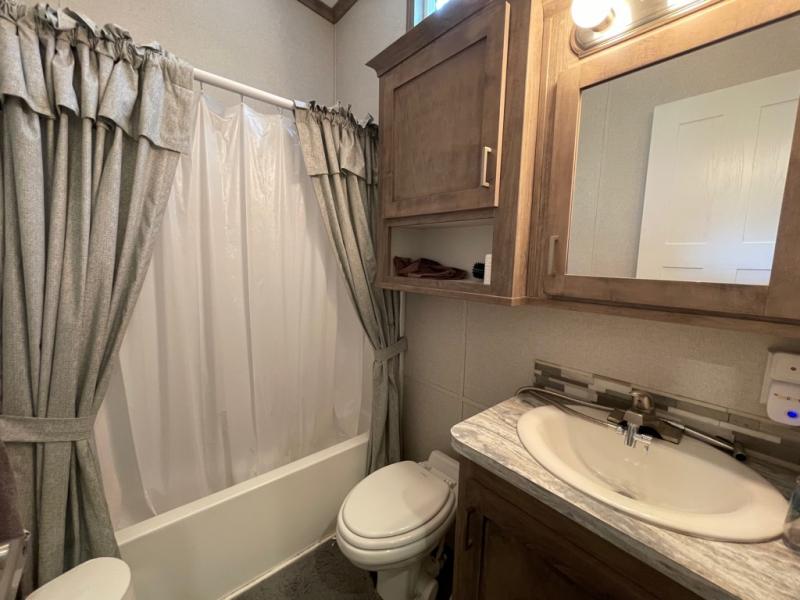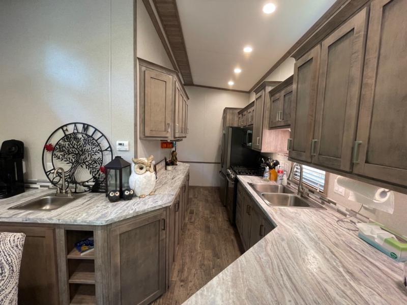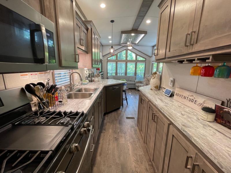 2021 Kropf Park Model in the Park | 2 Bedrooms + 2 Bathrooms2021 Kropf luxury park model on site 45. Located in a quiet lot overlooking the forest but close to all park events. This unit has a large 10'3" x 26' Florida room for additional living space including cordless blinds (2023). It also gives access to the back deck, wrap around partially covered deck with double stair access. Head inside to an open concept dining and living space with an electric fireplace and 2 pull out couches. Large galley kitchen with tons of storage and full size appliances including a dishwasher. Customized bar area including sink and beverage fridge. There is a 4pc bathroom for guests to use! Bunk room with a double and single bed for the family. At the end of the hall find the queen bed master suite with built in storage and a 2pc ensuite bathroom. Outside there is a 8' x10' shed (2022). Upgraded electrical, wifi enabled. Comfortably sleeps 9.