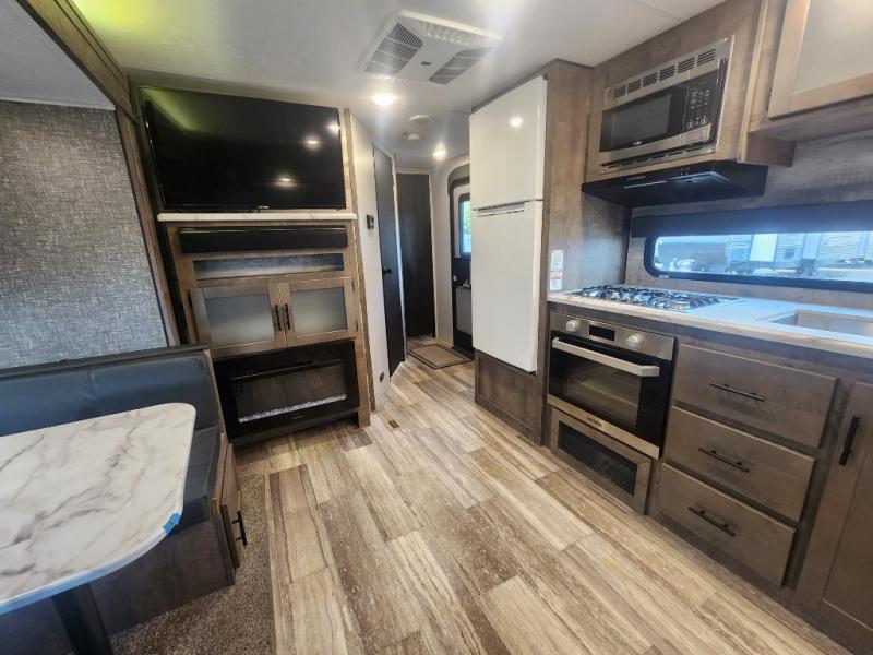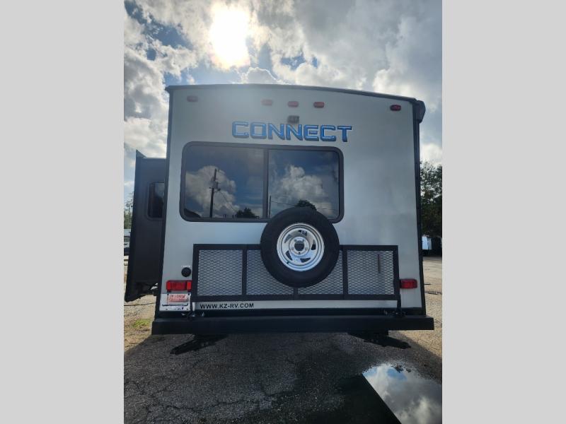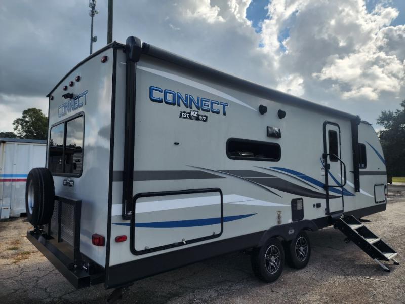 The KZ Connect travel trailer is a trailer with extreme style and creative floorplans! Wrapped up in a lightweight package, the Connect has gorgeous interior décor and a high-end fiberglass exterior. You will find a fiberglass front cap with front windshield, a power front jack, exterior speakers, a spare tire, Equa-Flex suspension, nitrogen-filled tires, a leash latch, and a heated, insulated, and enclosed underbelly, and that's just the beginning. There is still plenty more to check out, like the well-appointed interior that has a kitchen skylight, an HDMI/USB charging port, LED motion-sensor lights, an electric fireplace, and upgraded linoleum flooring.