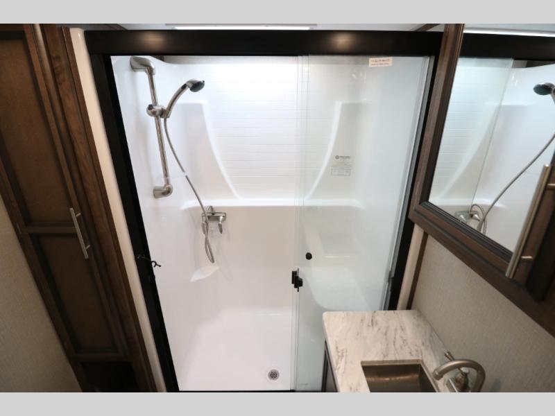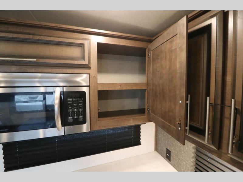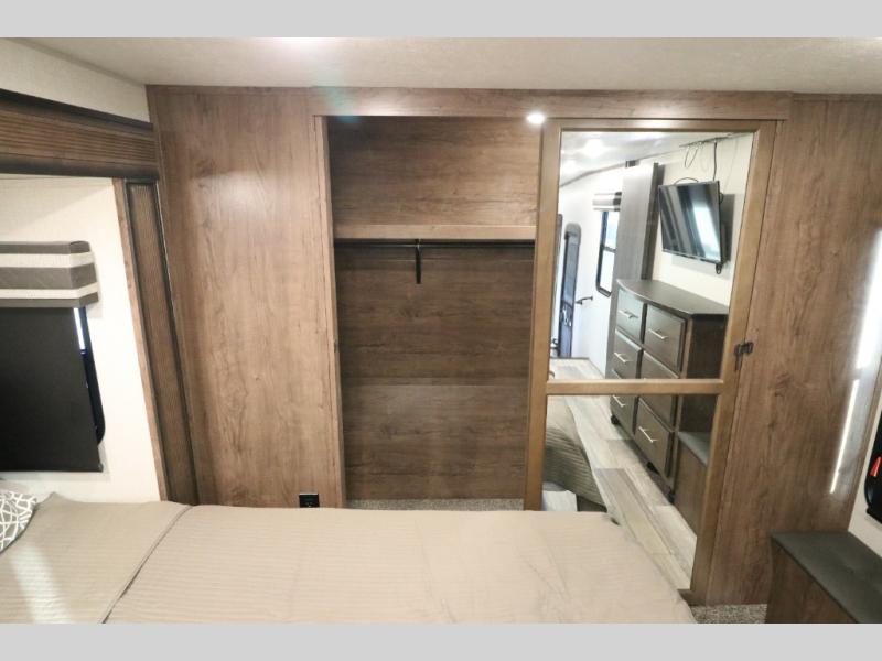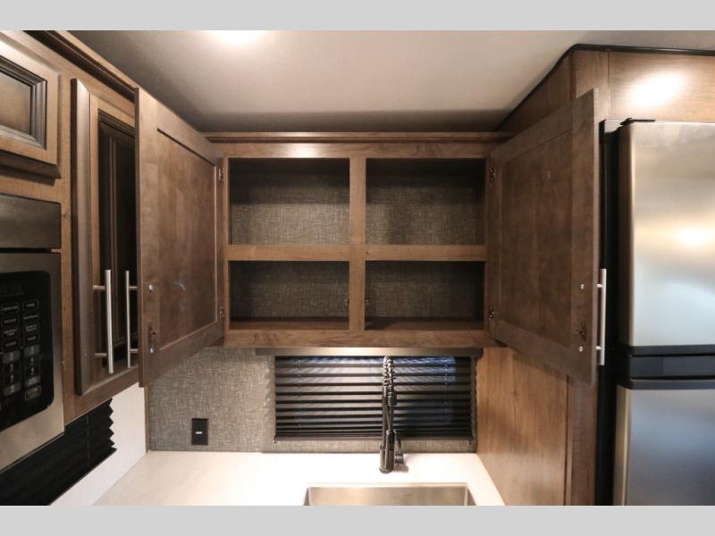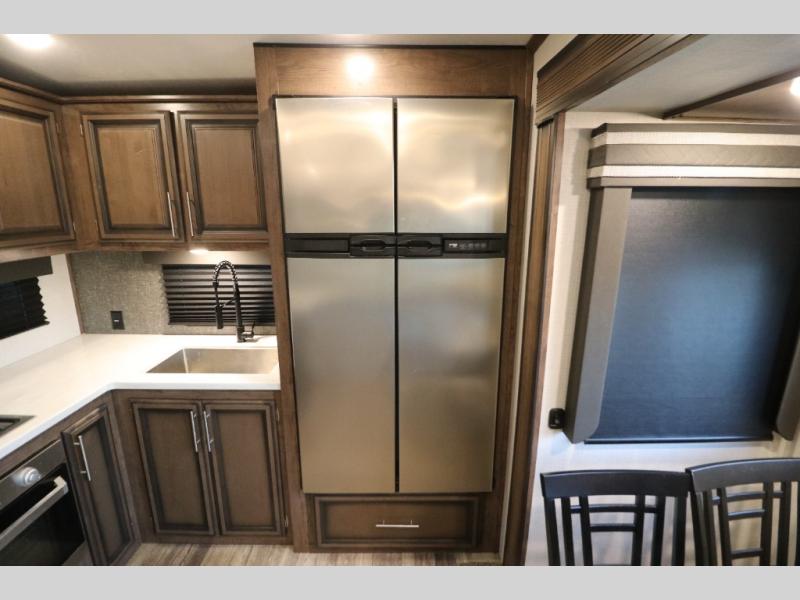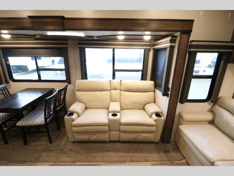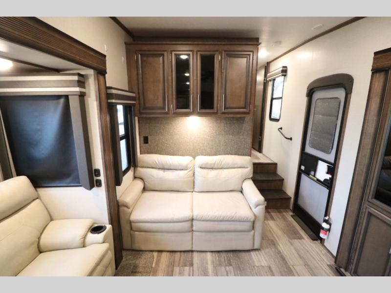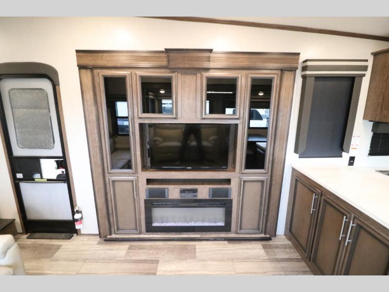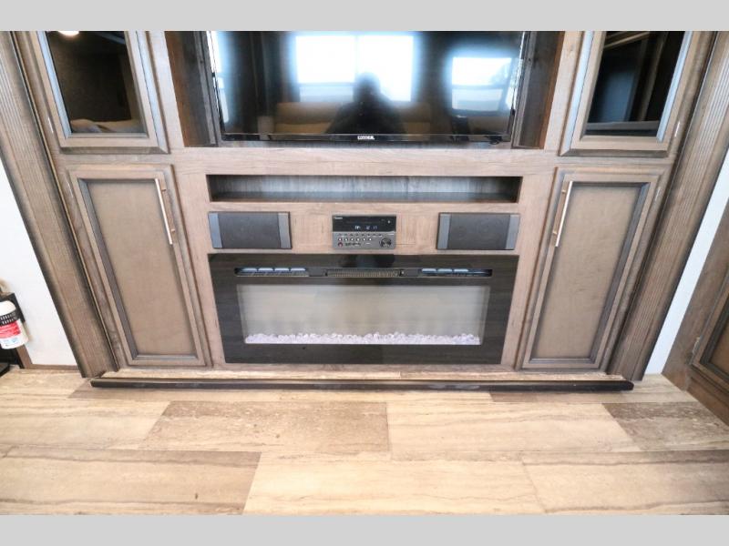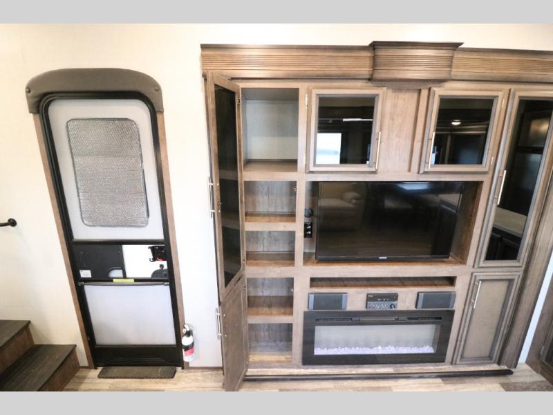 Outdoor fun with inside comforts await you each time you take this fifth wheel camping or glamping! You and your spouse will have a private bedroom with a king bed slide out, a full wall wardrobe with the option to add a washer and dryer, and a dresser with built-in hamper. You might like to take a shower first in the full bathroom with a space savings pocket door, or drink a cup of coffee and make breakfast in the rear kitchen which also includes a hutch/pantry. The fireplace will keep you cozy during the cooler months while you watch the LED TV, reclining in a theater seat with heat and massage features, and relaxing on the hide-a-bed sofa.