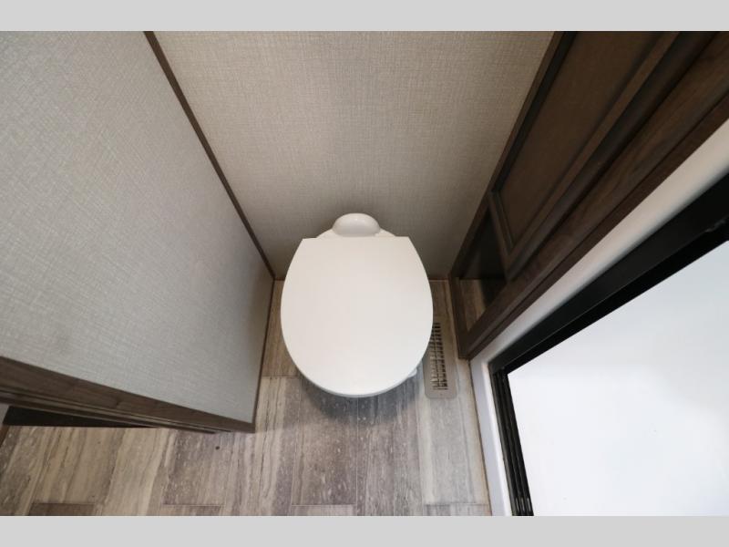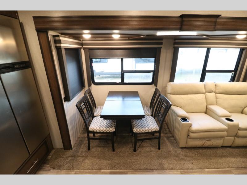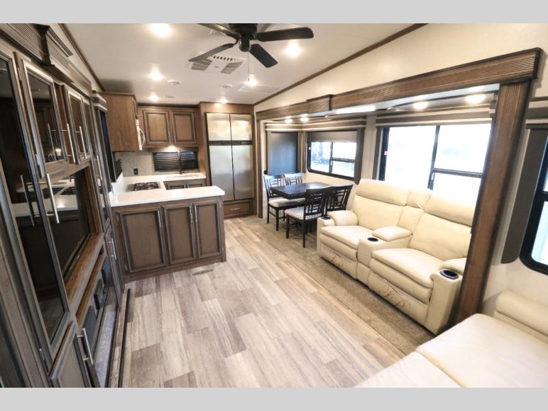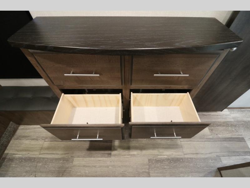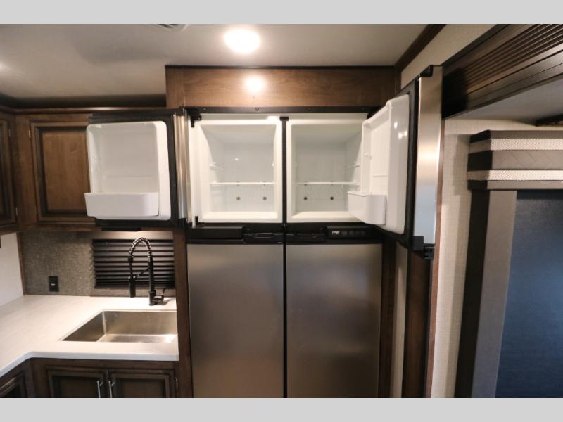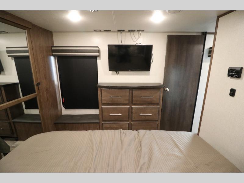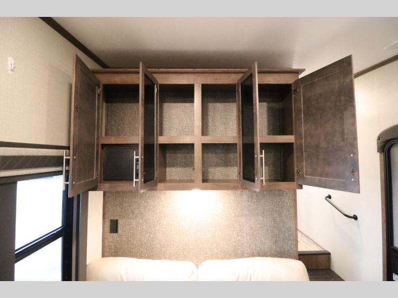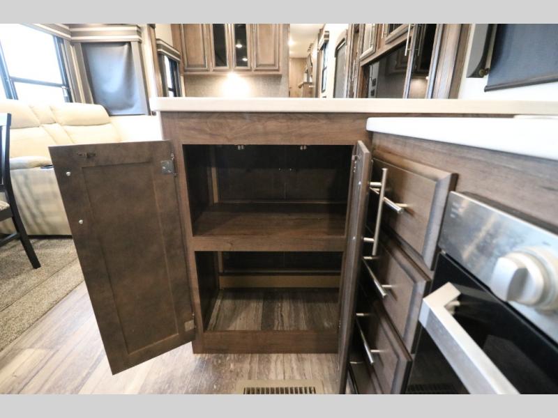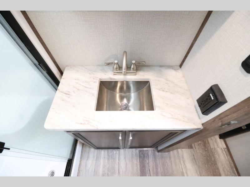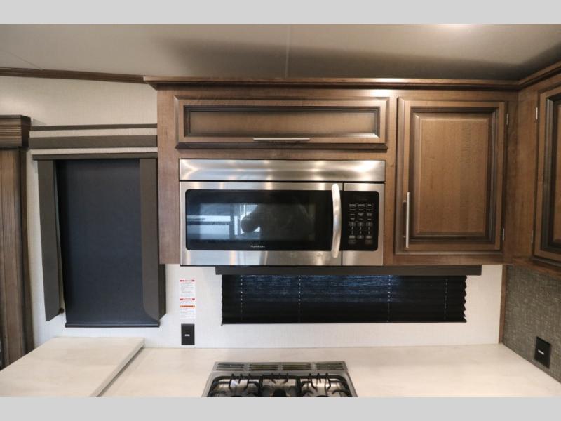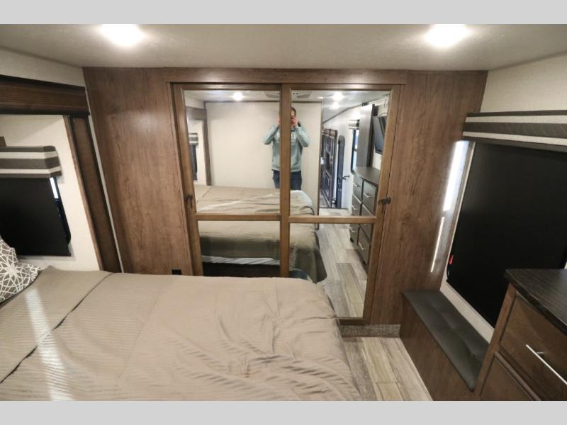 Outdoor fun with inside comforts await you each time you take this fifth wheel camping or glamping! You and your spouse will have a private bedroom with a king bed slide out, a full wall wardrobe with the option to add a washer and dryer, and a dresser with built-in hamper. You might like to take a shower first in the full bathroom with a space savings pocket door, or drink a cup of coffee and make breakfast in the rear kitchen which also includes a hutch/pantry. The fireplace will keep you cozy during the cooler months while you watch the LED TV, reclining in a theater seat with heat and massage features, and relaxing on the hide-a-bed sofa.