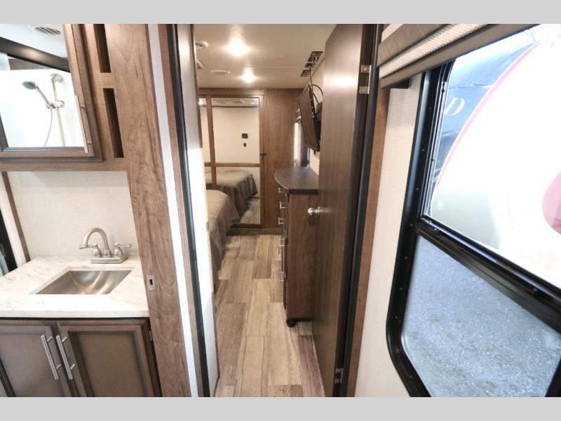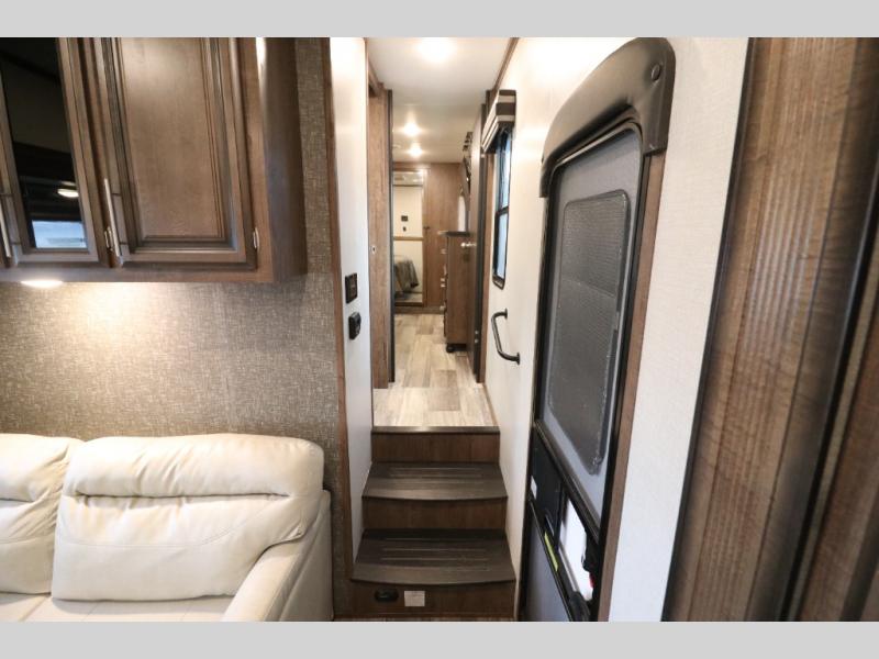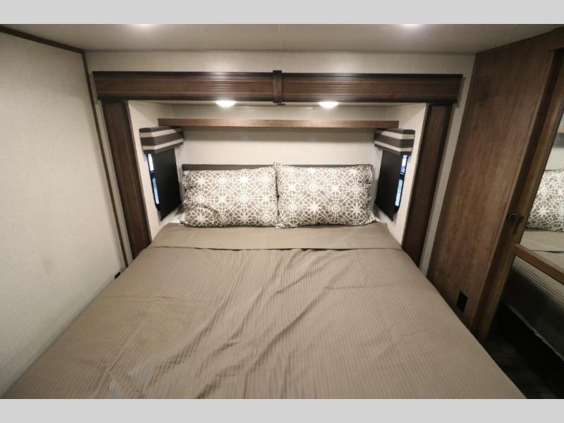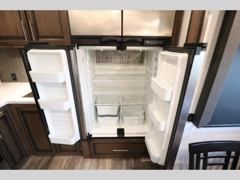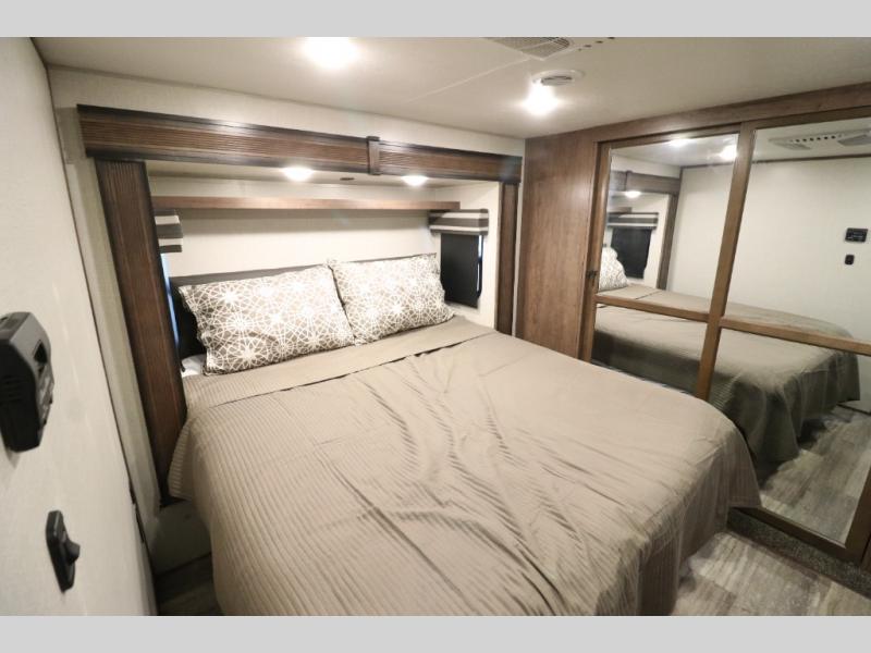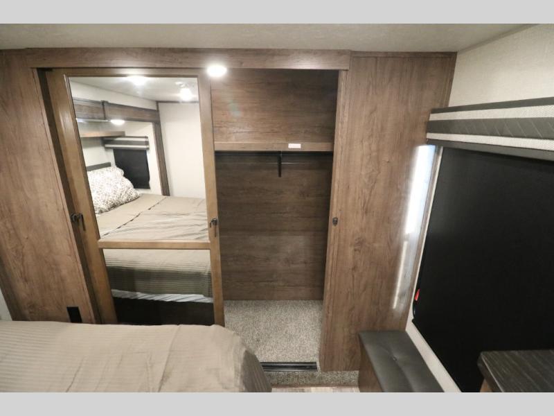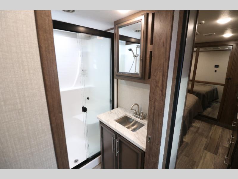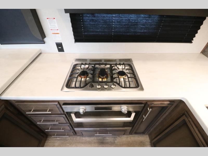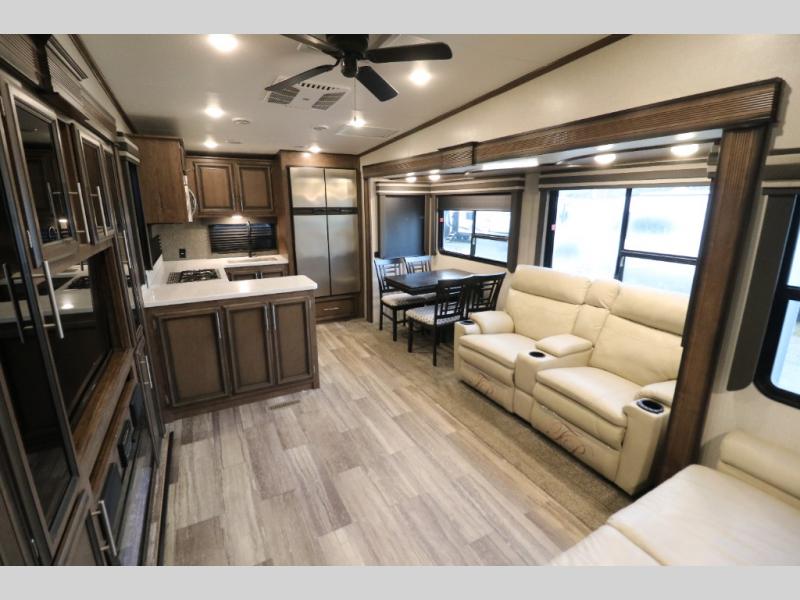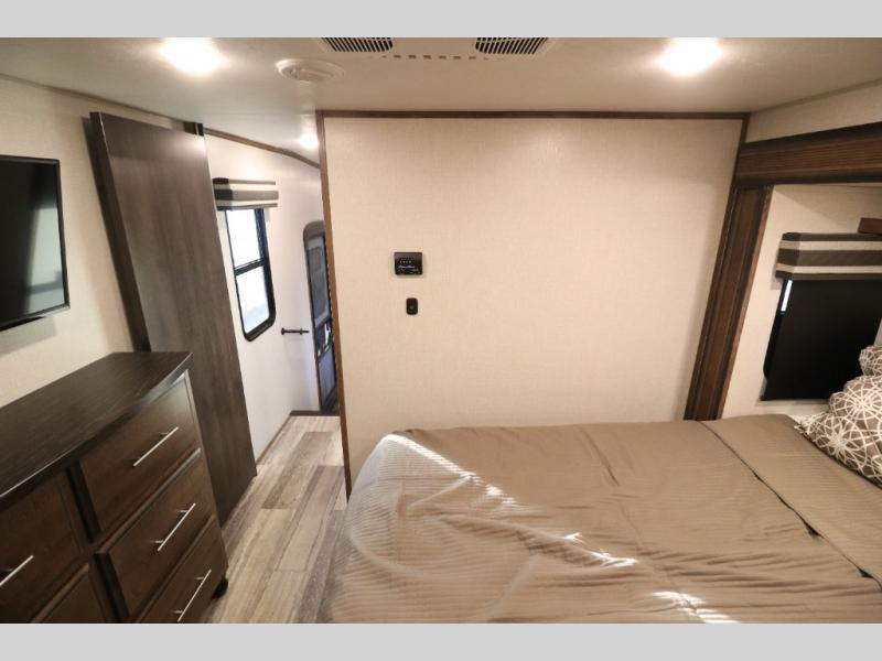Outdoor fun with inside comforts await you each time you take this fifth wheel camping or glamping! You and your spouse will have a private bedroom with a king bed slide out, a full wall wardrobe with the option to add a washer and dryer, and a dresser with built-in hamper. You might like to take a shower first in the full bathroom with a space savings pocket door, or drink a cup of coffee and make breakfast in the rear kitchen which also includes a hutch/pantry. The fireplace will keep you cozy during the cooler months while you watch the LED TV, reclining in a theater seat with heat and massage features, and relaxing on the hide-a-bed sofa.