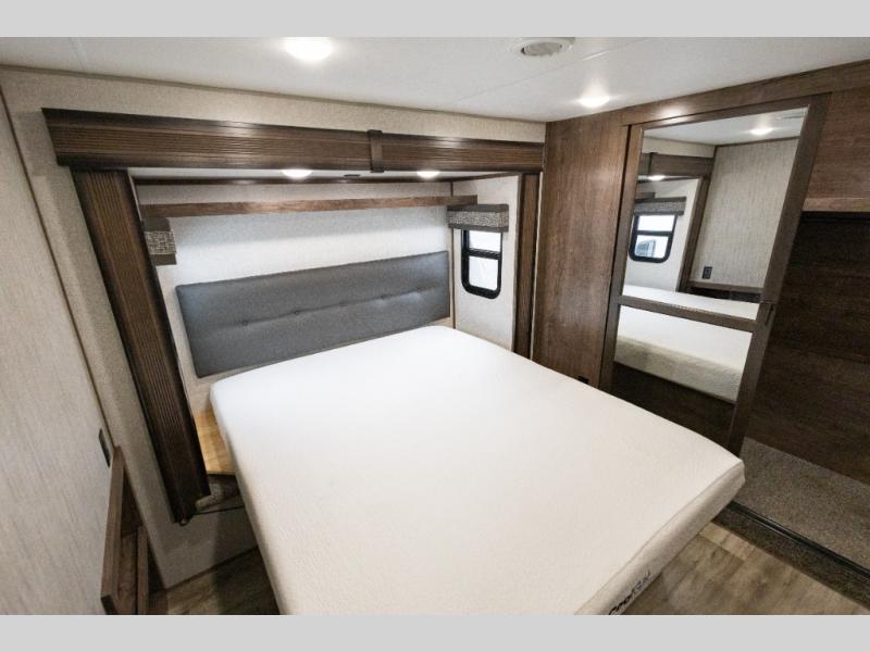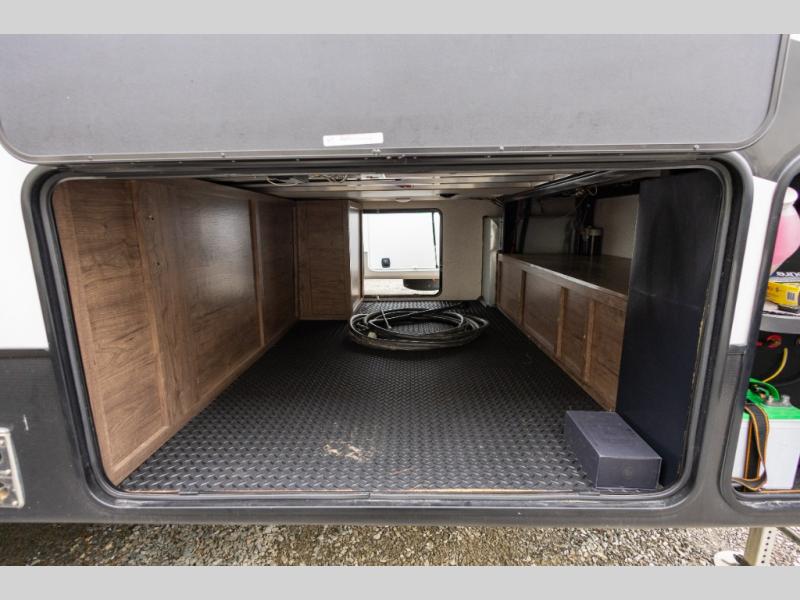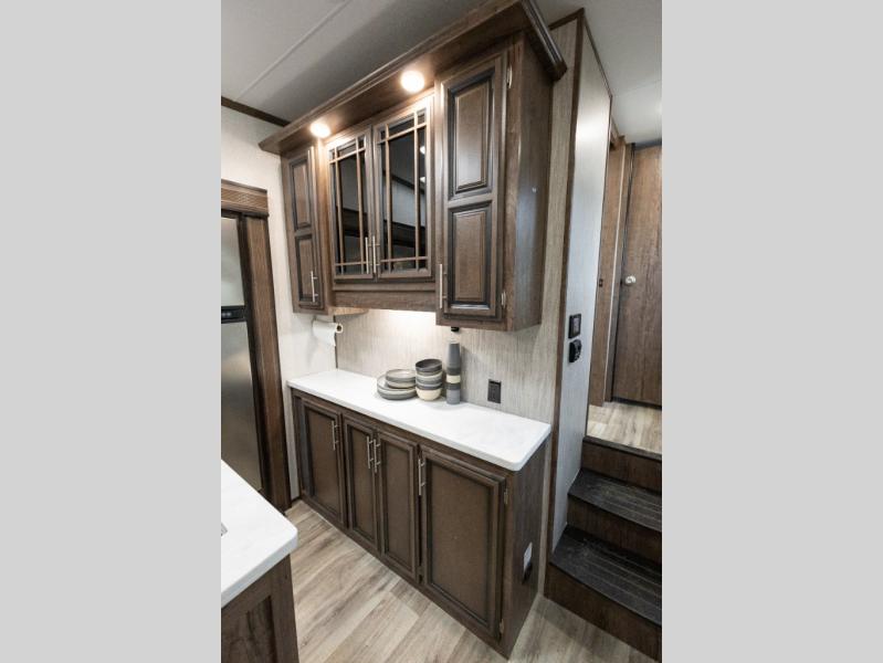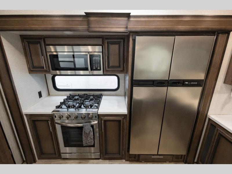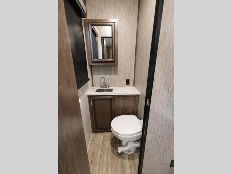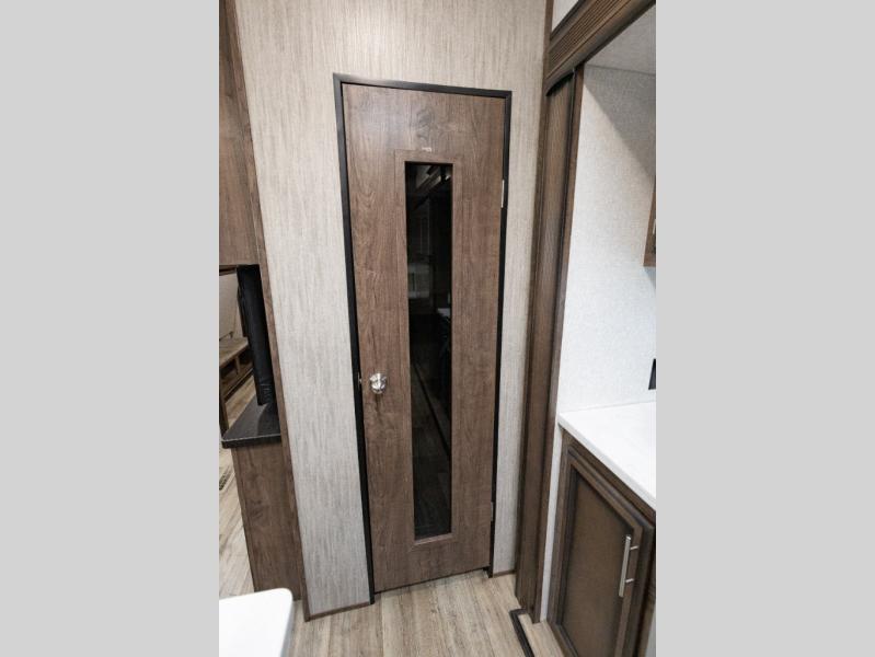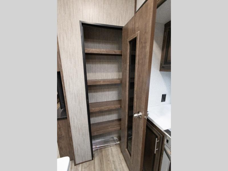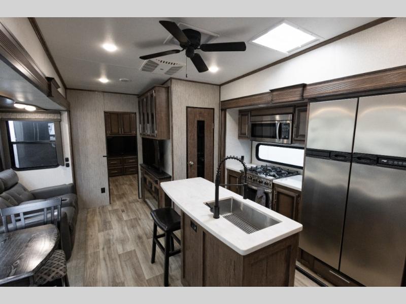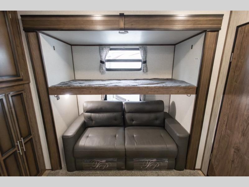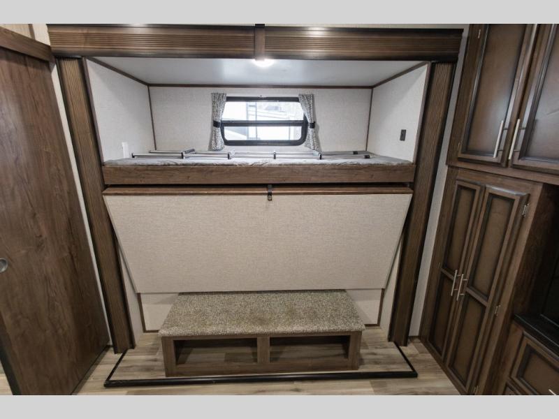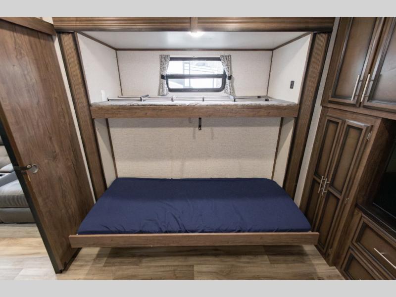 The kids or your guests will love having their own space in the private bunkhouse! They can enjoy a hide-a-bed sofa with a bunk above and two bunks on the opposite side, plenty of storage and an entertainment center, lots of floor space thanks to the dual opposing slides, and a half bath which is quiet handy at night. You will have your own king bed slide in the front bedroom on the opposite side of the RV. If you like to keep everything clean while camping, choose the washer and dryer option in the prepped space in the wardrobe, and the handy built-in hamper in the dresser is near by. The cook will have a full kitchen to make meals including a 12 cu. ft. refrigerator, and the choice to cook outdoors on the outside kitchen. You will also be able to tow with the hitch receiver, walk up the flip-up solid steps with ease, and sit under the 16' power awning when you would like some outdoor living space.