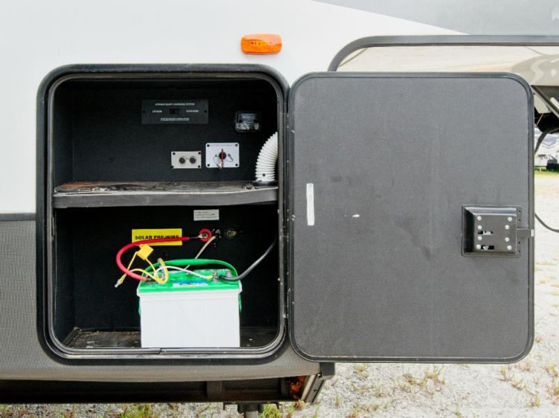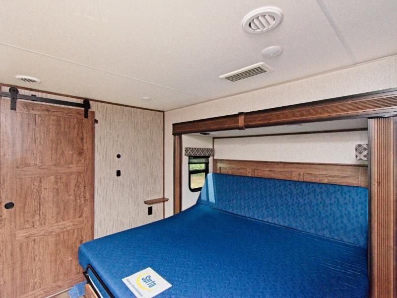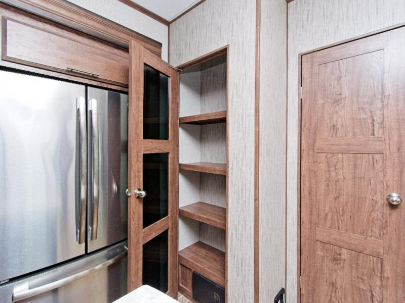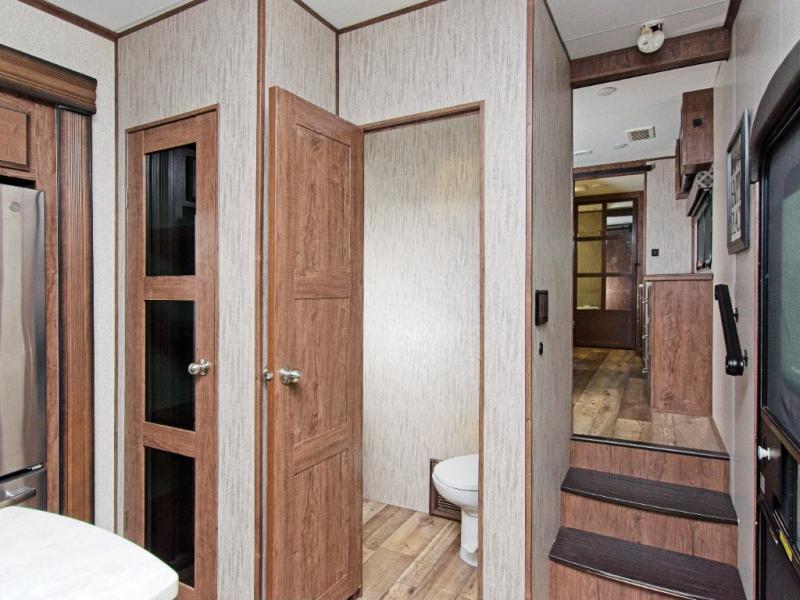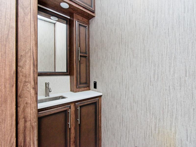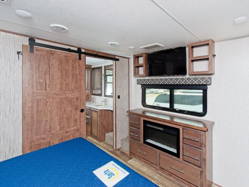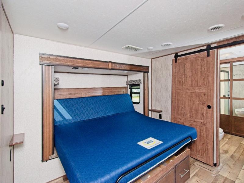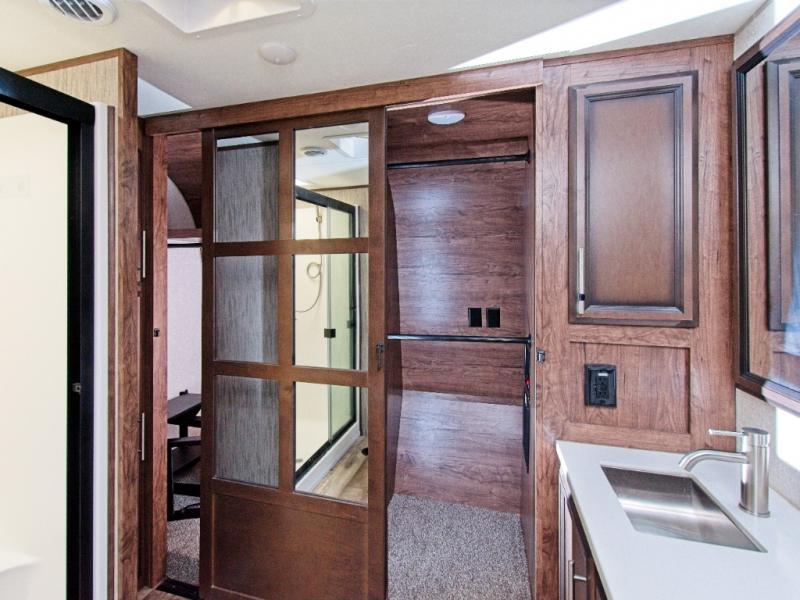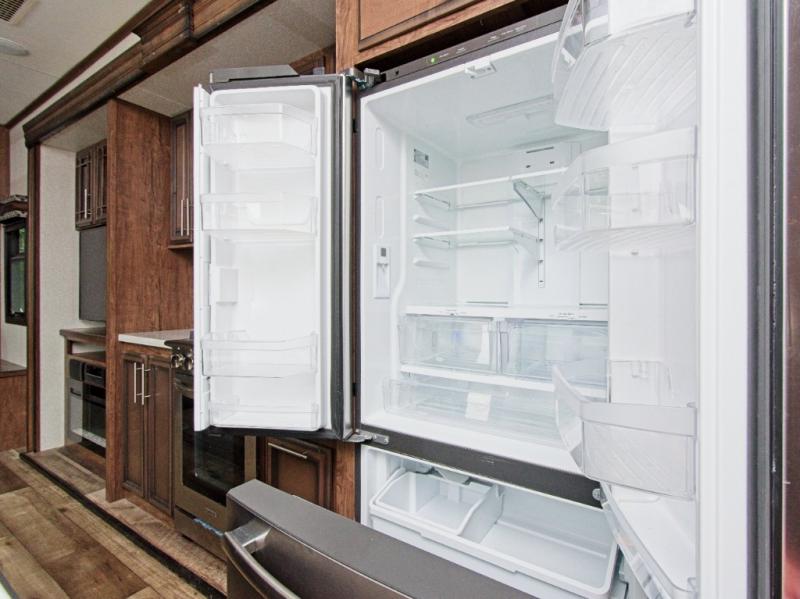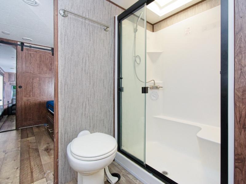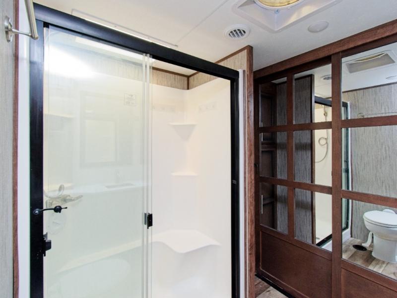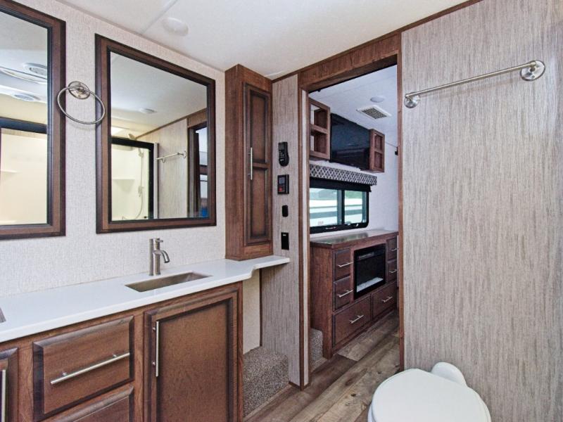 The Durango Gold G366FBT is a luxury fifth wheel crafted for couples who want residential comfort on the road. Enjoy a front master bathroom with dual sinks, a walk-in shower with seat, linen storage, and washer/dryer prep. The electric-tilt king bed offers underbed drawers and a perfect view of the 32" LED TV for nighttime relaxation.