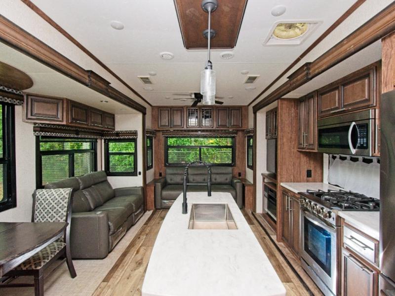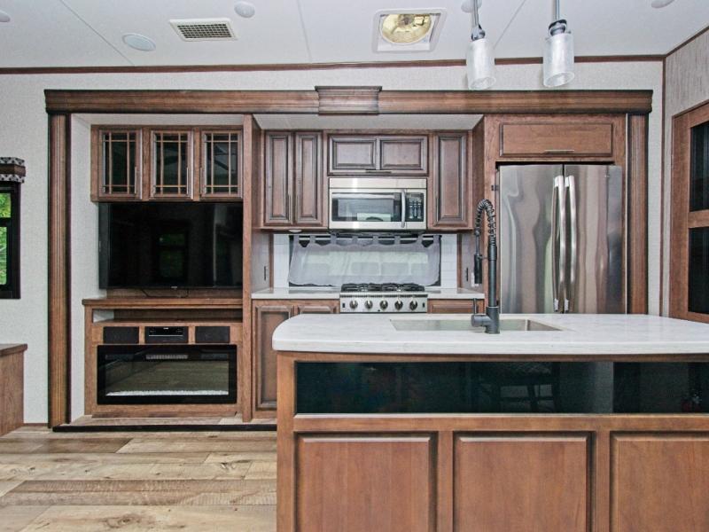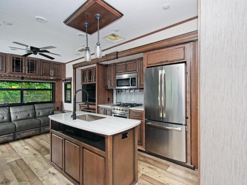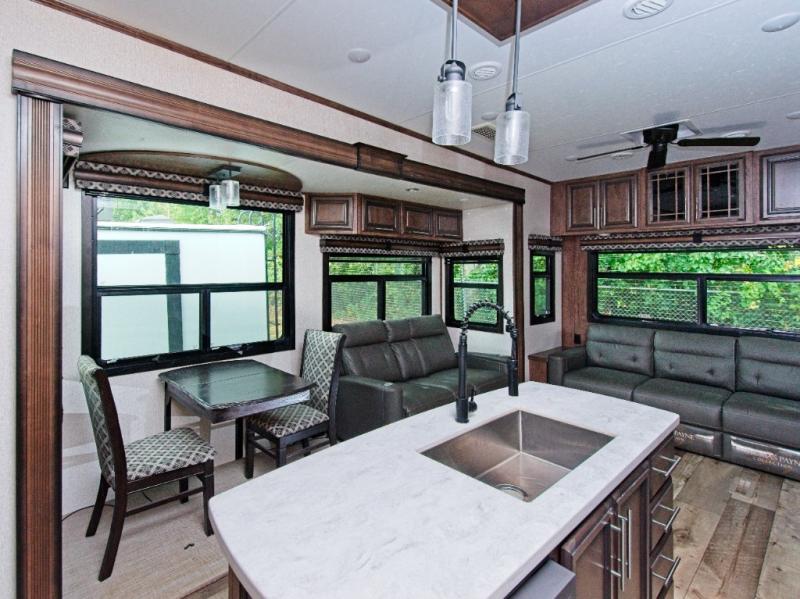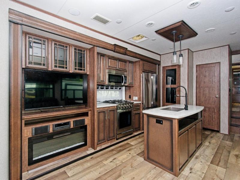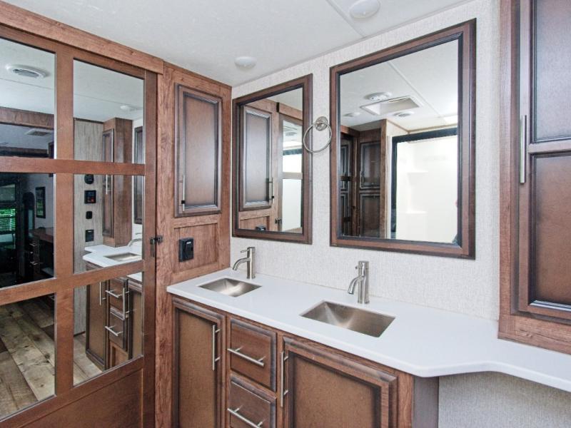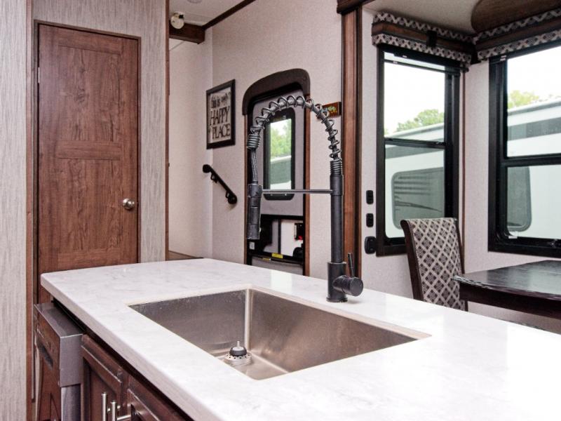 Experience full-time luxury in the KZ Durango Gold G366FBT, featuring a spacious front bath with dual sinks and a chef-ready kitchen island with a stainless steel dishwasher.