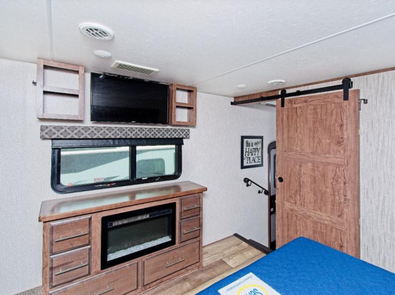 Guests will appreciate the half bath, while the hide-a-bed sofa provides a comfortable sleeping option for grandkids or visitors. The theater seating and 50" LED TV paired with a fireplace create a cozy living space for movie nights or quiet evenings.