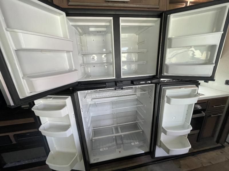 You will enjoy living or camping in this fifth wheel with the choice to hangout outside above ground on the rear patio deck with a patio door for easy access plus you can use some of the space to store your outdoor gear like fishing pools, wet boots, and such. The 19' power awning by the main entry also offers an outdoor living area protected from the elements and you might choose to add a second awning option. The cook will enjoy making food for everyone with all the appliances and floor space plus the stainless steel dishwasher will help with clean up. The extra room is accessed through the kitchen and can be utilized as an office with the desk top, a second living area and/or a second bedroom thanks to the hide-a-bed sofa. The queen-size loft above has stairs with access in the hallway so the kids can easily get to the loft to sleep or play, and it is near the full bathroom. The front master bedroom will surely not disappoint each time you enter thanks to electric-tilt king bed and all the storage for your clothing, plus there is a space prepped for a washer/dryer option and more handy storage.