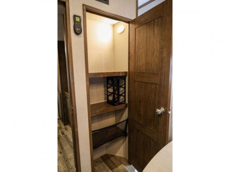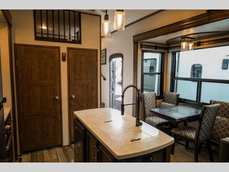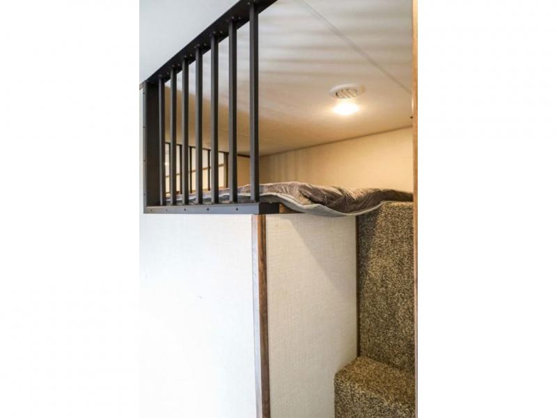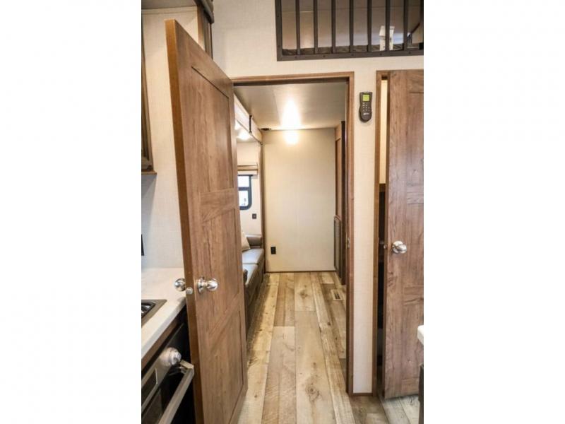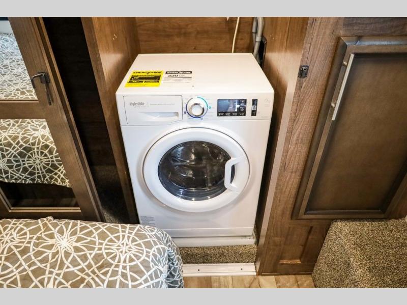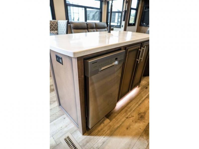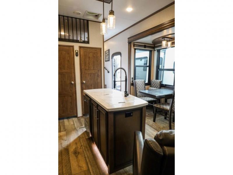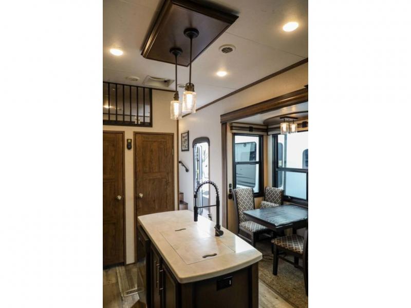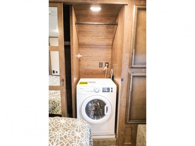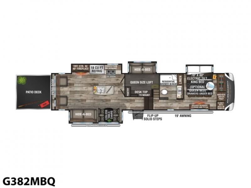 You will enjoy living or camping in this fifth wheel with the choice to hangout outside above ground on the rear patio deck with a patio door for easy access plus you can use some of the space to store your outdoor gear like fishing pools, wet boots, and such. The 19' power awning by the main entry also offers an outdoor living area protected from the elements and you might choose to add a second awning option. The cook will enjoy making food for everyone with all the appliances and floor space plus the stainless steel dishwasher will help with clean up. The extra room is accessed through the kitchen and can be utilized as an office with the desk top, a second living area and/or a second bedroom thanks to the hide-a-bed sofa. The queen-size loft above has stairs with access in the hallway so the kids can easily get to the loft to sleep or play, and it is near the full bathroom. The front master bedroom will surely not disappoint each time you enter thanks to electric-tilt king bed and all the storage for your clothing, plus there is a space prepped for a washer/dryer option and more handy storage.