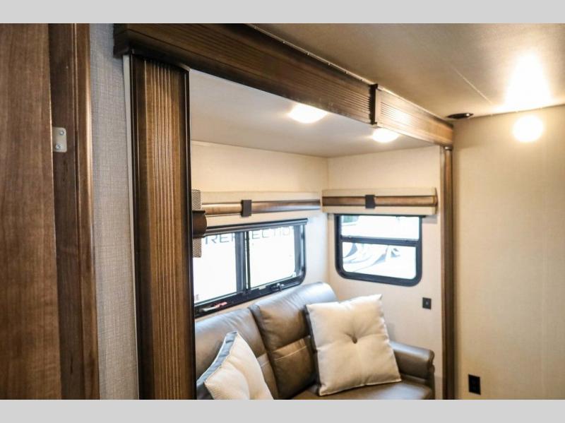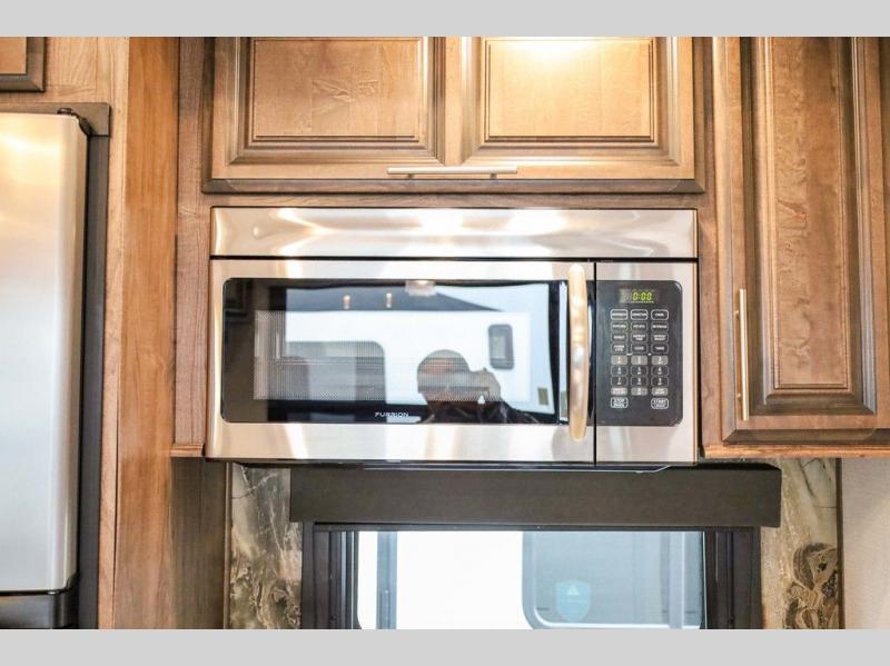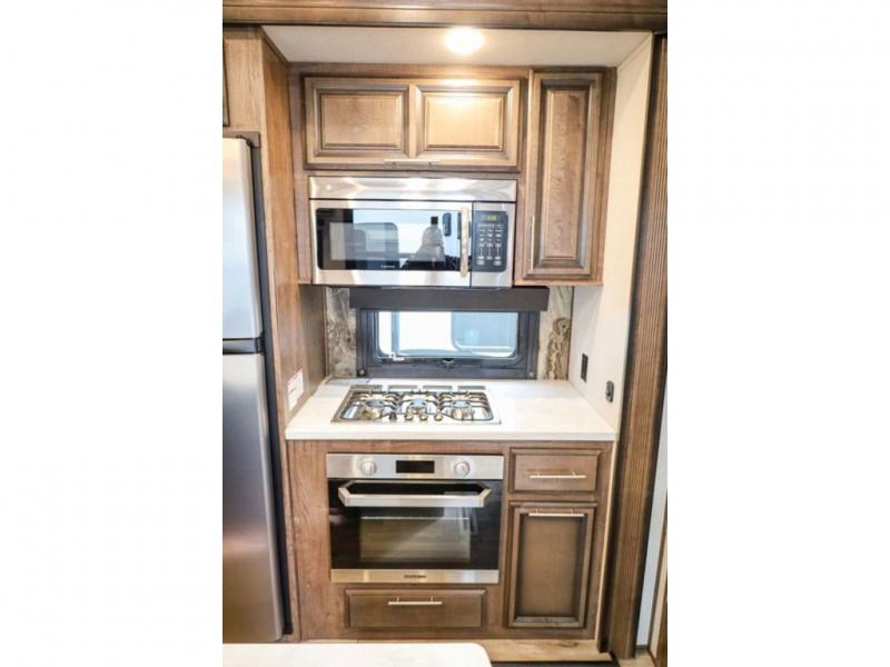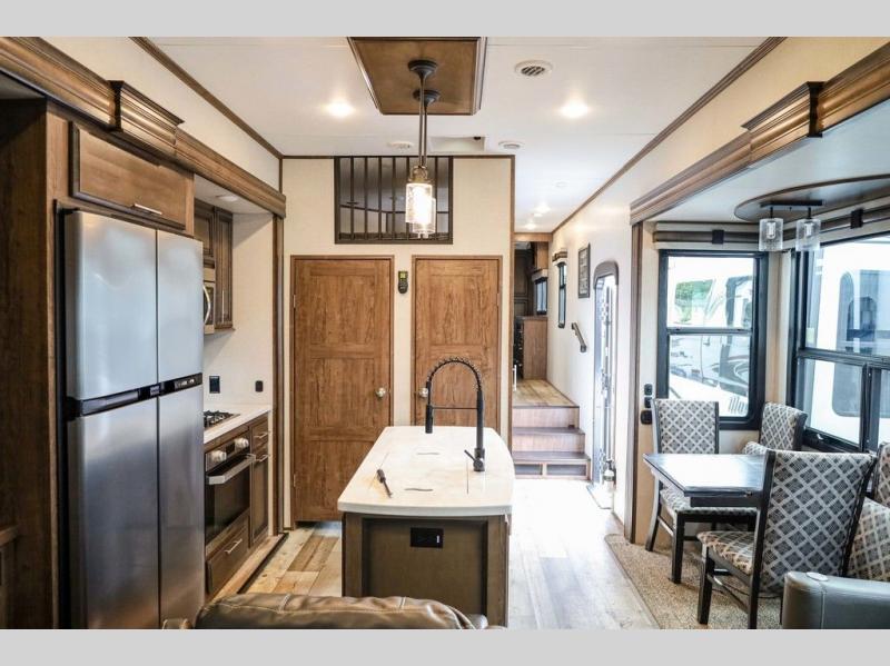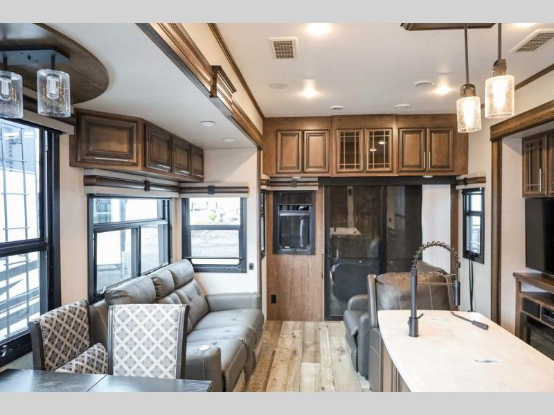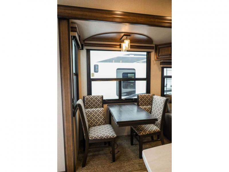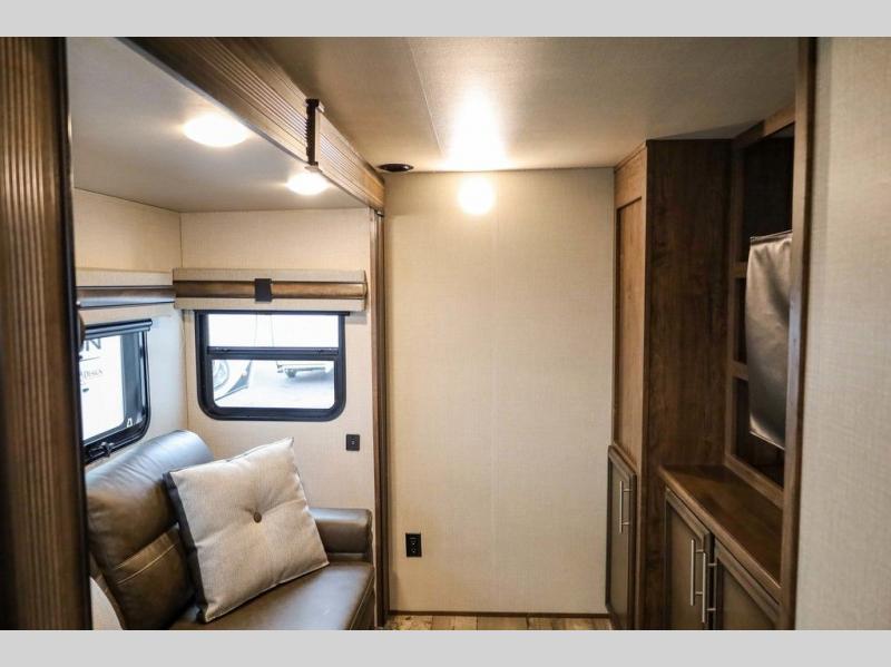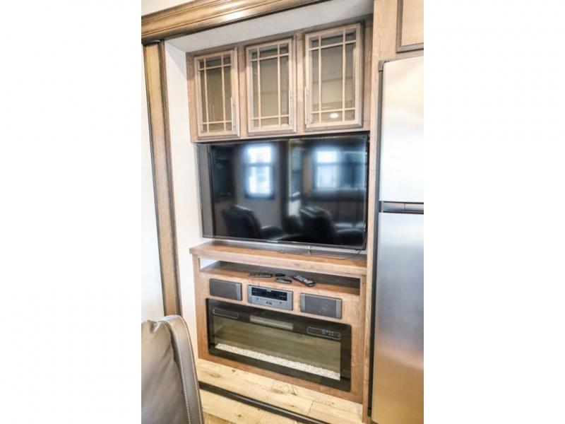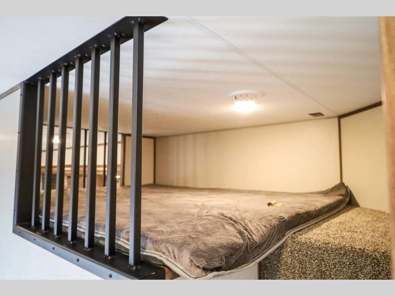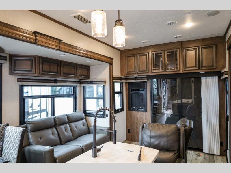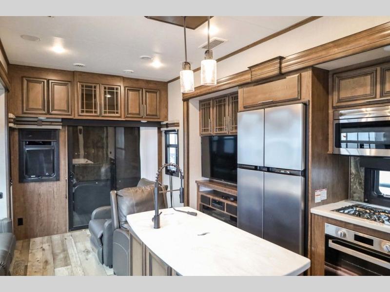 You will enjoy living or camping in this fifth wheel with the choice to hangout outside above ground on the rear patio deck with a patio door for easy access plus you can use some of the space to store your outdoor gear like fishing pools, wet boots, and such. The 19' power awning by the main entry also offers an outdoor living area protected from the elements and you might choose to add a second awning option. The cook will enjoy making food for everyone with all the appliances and floor space plus the stainless steel dishwasher will help with clean up. The extra room is accessed through the kitchen and can be utilized as an office with the desk top, a second living area and/or a second bedroom thanks to the hide-a-bed sofa. The queen-size loft above has stairs with access in the hallway so the kids can easily get to the loft to sleep or play, and it is near the full bathroom. The front master bedroom will surely not disappoint each time you enter thanks to electric-tilt king bed and all the storage for your clothing, plus there is a space prepped for a washer/dryer option and more handy storage.