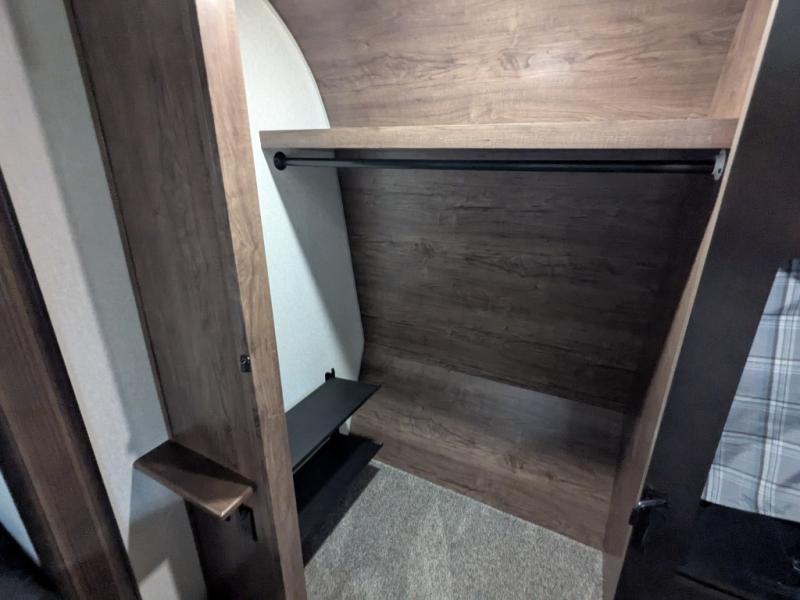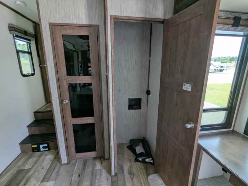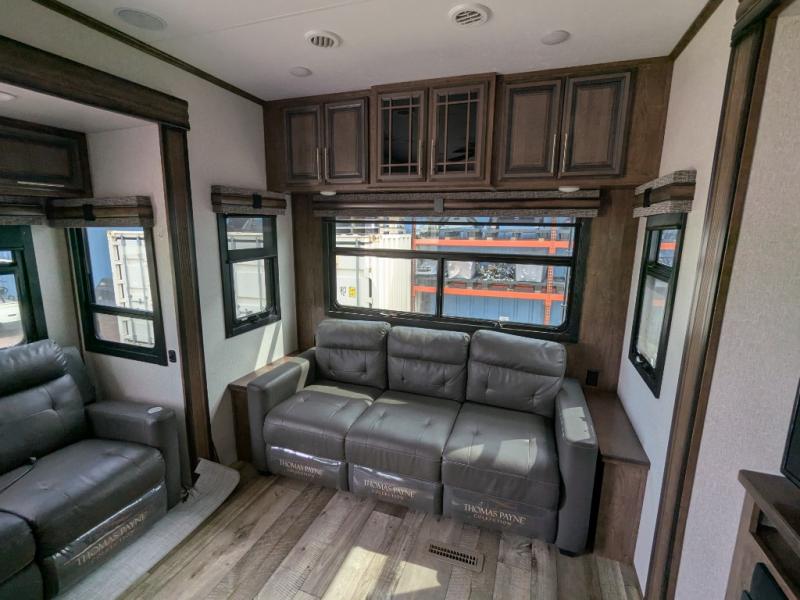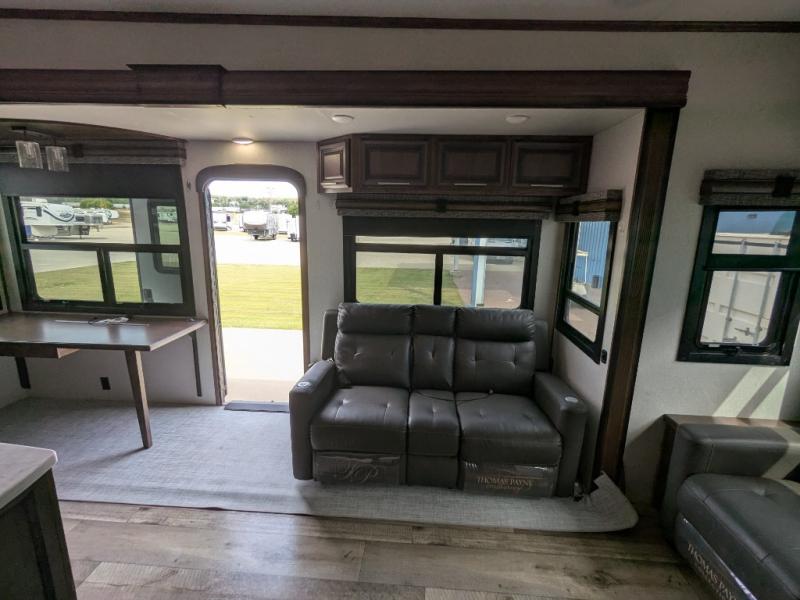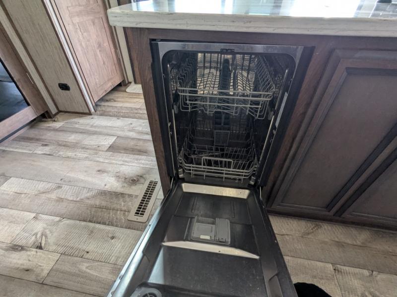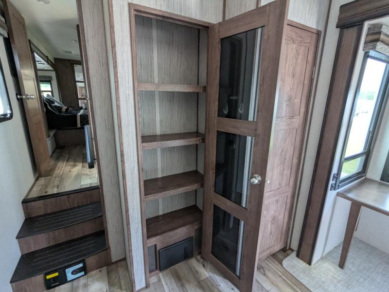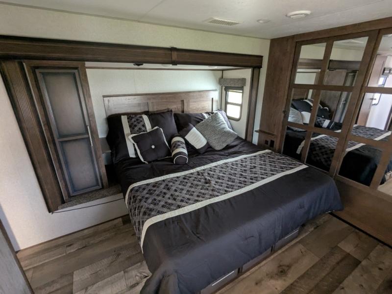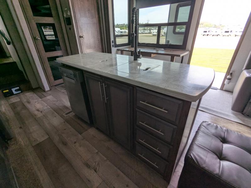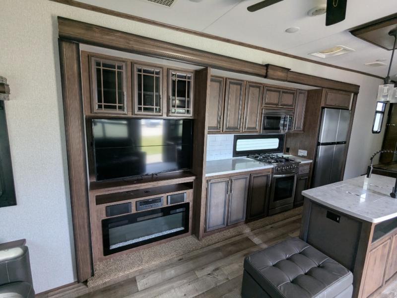 The spacious front master bedroom will excite you with its two slide outs offering lots of space to walk around the electric-tilt king bed to get to the front wall wardrobe, the closet with built-in hamper, the dresser with hidden storage and the closet next to the bed. You also have access to the double entry bathroom. Inside, you will find a shower with a seat, linen storage and a dual sink vanity to quickly get ready for the day. Cooking is made easy with a four-burner range, 24" oven and a convection microwave, plus the kitchen island offers extra counter space to serve meals. There is a closet prepped for a washer/dryer option, a pantry for all your goodies, and a fireplace to keep you cozy while sitting on the hide-a-bed sofa or theater seats, plus there are two more slides giving you plenty of walking around room to entertain and stretch out. And there are more options to choose from to customize your RV just like you want, take a look!