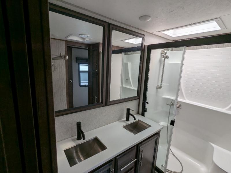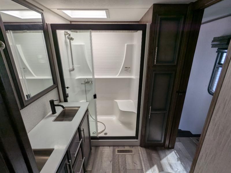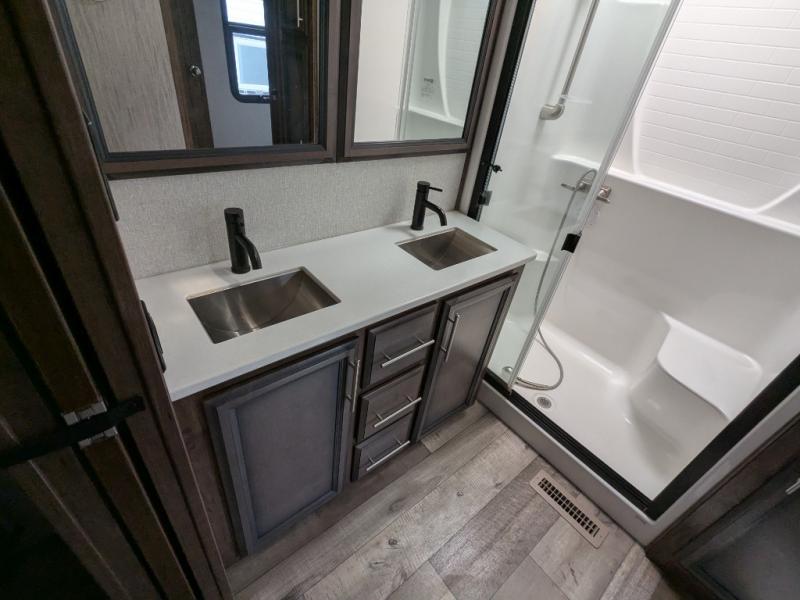 With any Durango Gold fifth wheels by KZ you will have flexible, puncture resistant, and reflective Tufflex roofing material, six-sided aluminum framing, and a heated, insulated and enclosed underbelly to travel all year long. Each model features a fully-vented attic system with two attic vents providing vital escape routes for unwanted moisture, and the Durango Towing package which includes a 2" towing receiver hitch with 4-pin wire harness connection, a 3,000 lb. tow rating, and 300 lb. hitch rating. The lithium-ready charging station includes a dual converter allowing you to flip a switch to choose between lithium or lead batteries. The interior offers outstanding features such as theater seating with cupholders, a USB plug, heat, massage and power recline/decline, an under-mount bathroom stainless steel sink with waterfall faucet, bedroom cabinetry with built-in hamper, and a Gold's 70" x 80" walk-around electric-tilt king bed with underbed drawers for extra storage. The list keeps going, choose your favorite Durango Gold today for luxury full-time traveling!