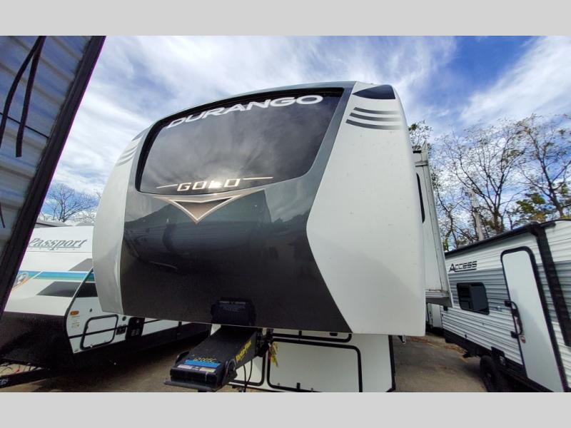 With any Durango Gold fifth wheels by KZ you will have flexible, puncture resistant, and reflective Tufflex roofing material, six-sided aluminum framing, and a heated, insulated and enclosed underbelly to travel all year long. Each model features a fully-vented attic system with two attic vents providing vital escape routes for unwanted moisture, and the Durango Towing package which includes a 2" towing receiver hitch with 4-pin wire harness connection, a 3,000 lb. tow rating, and 300 lb. hitch rating. The lithium-ready charging station includes a dual converter allowing you to flip a switch to choose between lithium or lead batteries. The interior offers outstanding features such as theater seating with cupholders, a USB plug, heat, massage and power recline/decline, an under-mount bathroom stainless steel sink with waterfall faucet, bedroom cabinetry with built-in hamper, and a Gold's 70" x 80" walk-around electric-tilt king bed with underbed drawers for extra storage. The list keeps going, choose your favorite Durango Gold today for luxury full-time traveling!