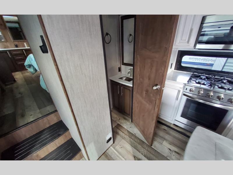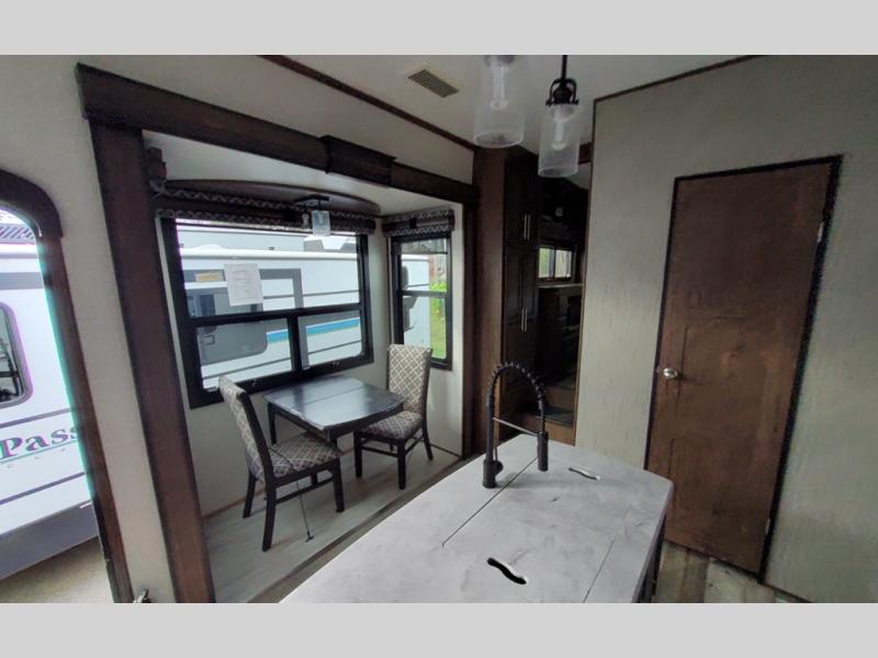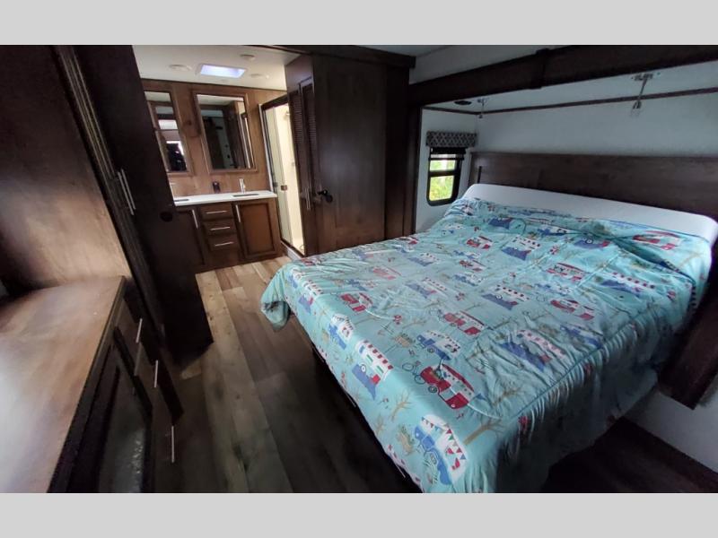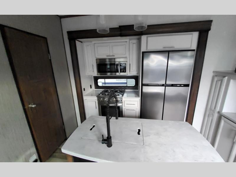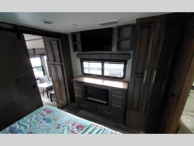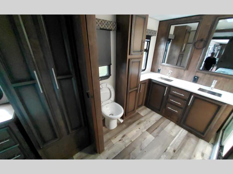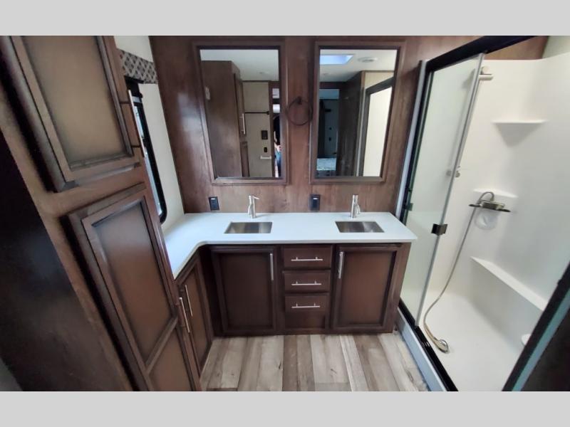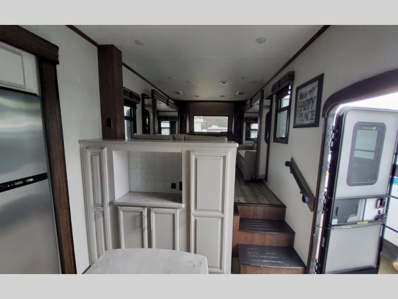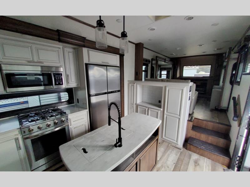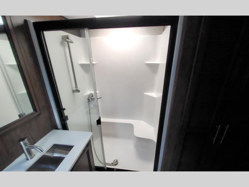 There will be no worries about storage when living or camping in this fifth wheel thanks to the exterior slide out tray and pass-through storage with a motion-lit, fully finished, heated and sealed basement storage for those larger items like golf clubs, off-season clothing in totes, camping chairs, outdoor games and such. The separate front entertainment/living area offers a 65" LED TV and 48" fireplace, theater seating, and two hide-a-bed sofas within slide outs providing seating as well as sleeping space for the kids and friends. The separate kitchen is spacious as well with two slides including a convection microwave, a 24" oven, and a four-burner range plus a legless table with four chairs, and a hutch/pantry. The half bath is an added convenience. You will have your own electric-tilt king bed or choose a queen option, drawer storage under the bed and there is a dresser with hidden storage and a wardrobe. Each morning you can get ready together with dual sinks, and stay refreshed with a residential shower with a seat.