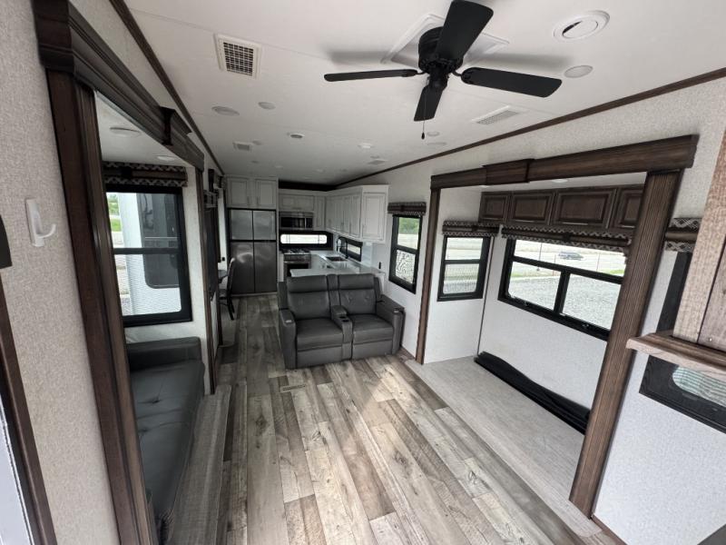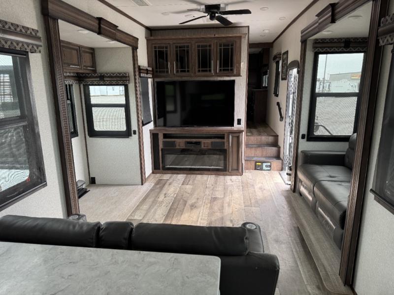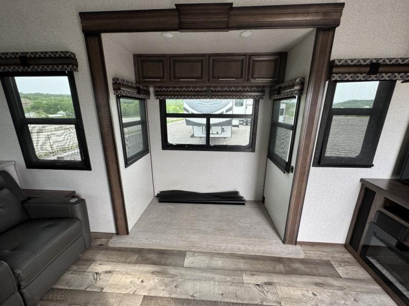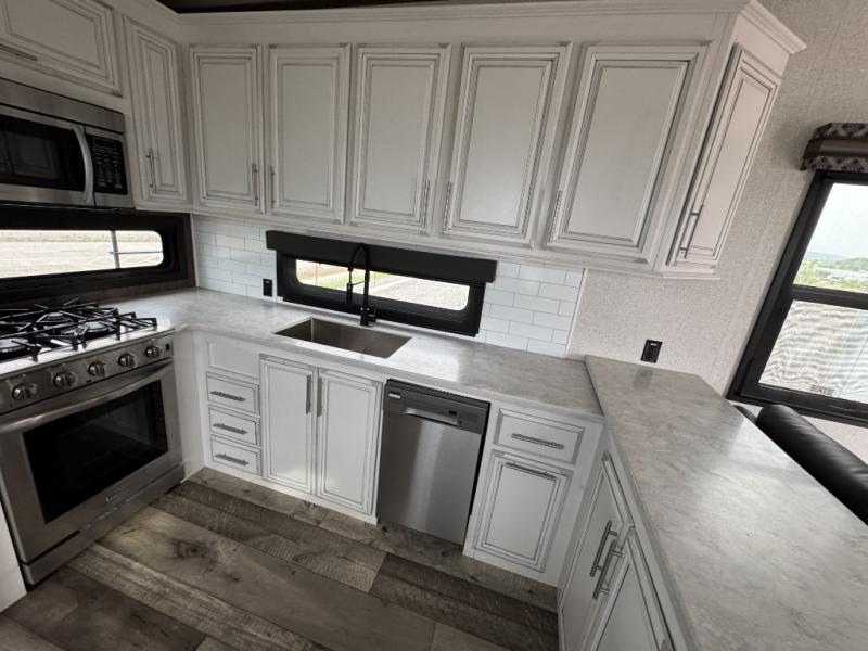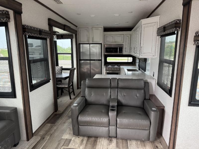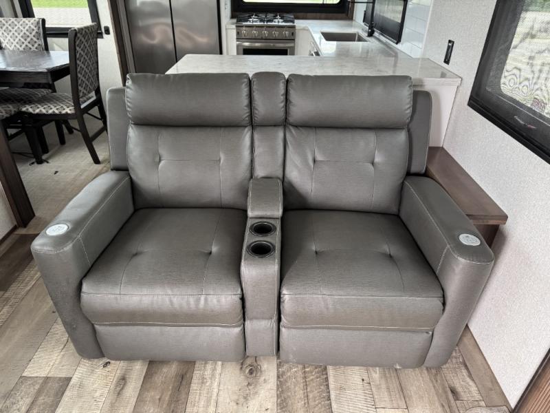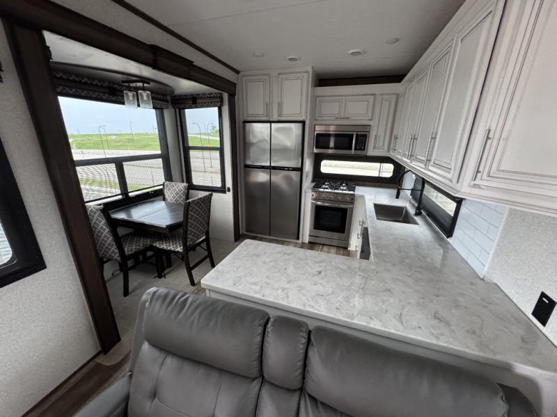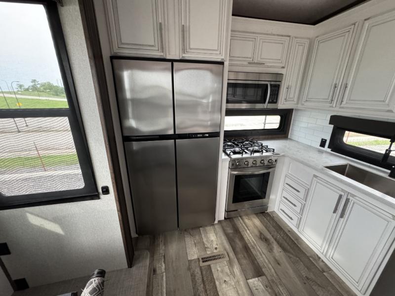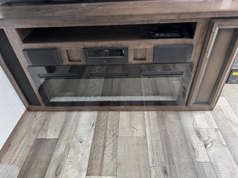 This is the perfect entertaining fifth wheel with a separate living area to watch the 65" LED TV with a 48" fireplace below while visiting with other RVers sitting on the dual opposing hide-a-bed sofas and theater seats. The cook will have lots of space in the rear kitchen to prepare and serve meals and snacks, plus plenty of storage in the pantry, the four door 18 cu. ft. refrigerator, and the overhead cabinets. The windows will allow for great views while cooking. Some friends might play games at the legless table with chairs or move the chairs to the living area for even more seating. When you are ready to call it a night, get cleaned up quickly in the dual sink vanity full bathroom and fall asleep on your own electric-tilt king bed or choose the queen bed option if you like. You can also add a washer/dryer option in the prepped space.