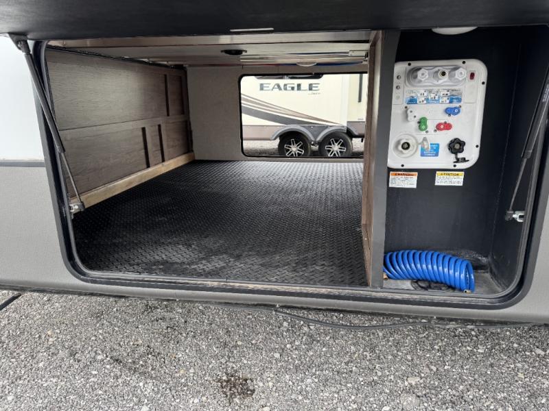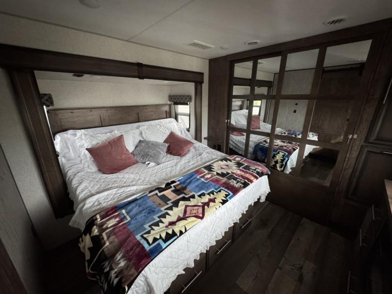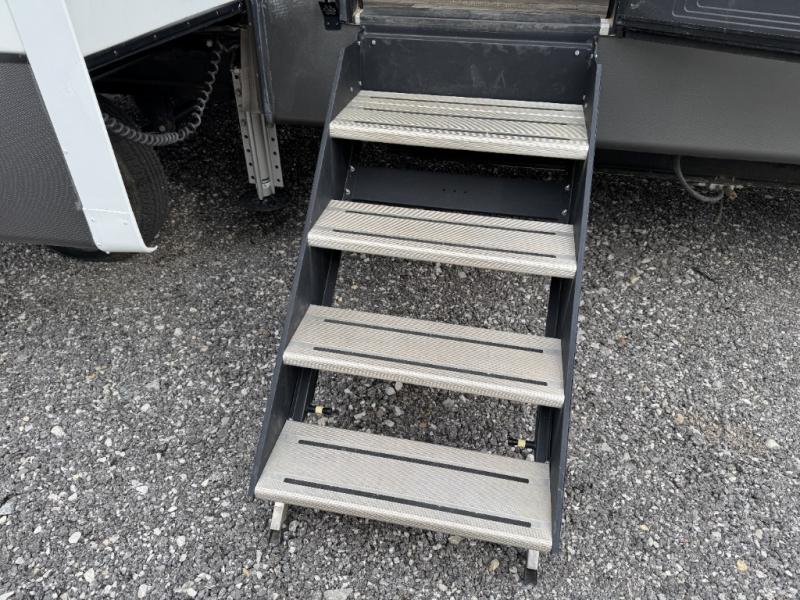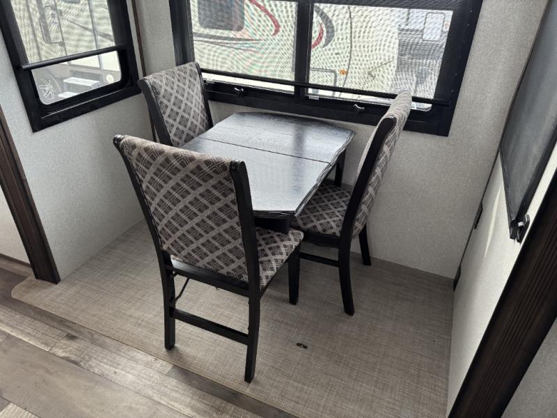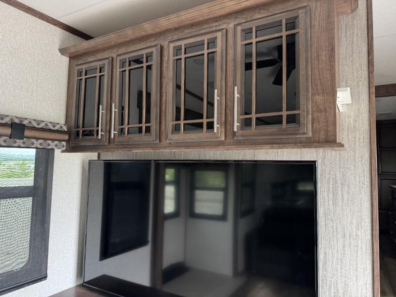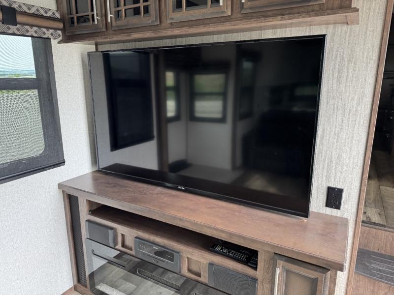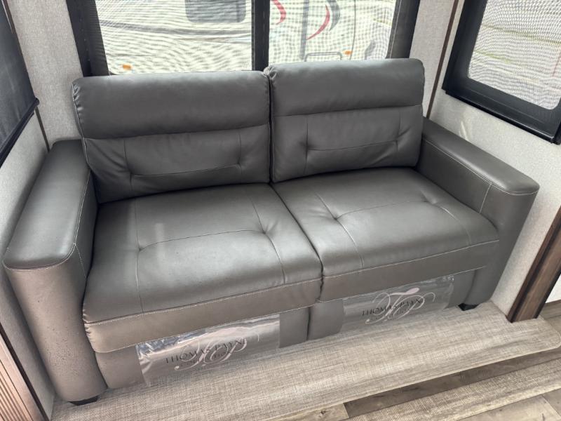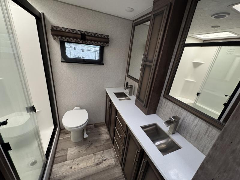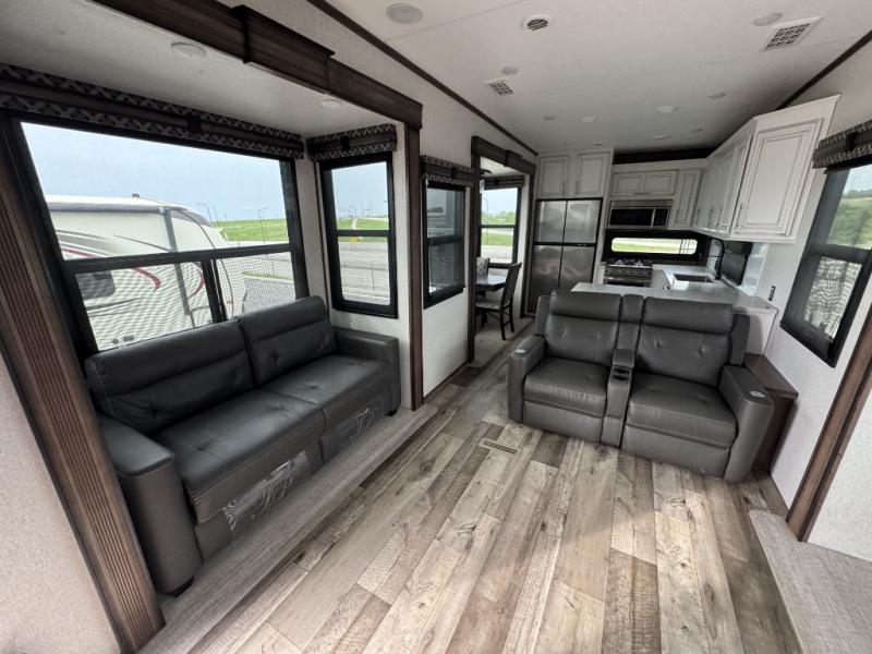 This is the perfect entertaining fifth wheel with a separate living area to watch the 65" LED TV with a 48" fireplace below while visiting with other RVers sitting on the dual opposing hide-a-bed sofas and theater seats. The cook will have lots of space in the rear kitchen to prepare and serve meals and snacks, plus plenty of storage in the pantry, the four door 18 cu. ft. refrigerator, and the overhead cabinets. The windows will allow for great views while cooking. Some friends might play games at the legless table with chairs or move the chairs to the living area for even more seating. When you are ready to call it a night, get cleaned up quickly in the dual sink vanity full bathroom and fall asleep on your own electric-tilt king bed or choose the queen bed option if you like. You can also add a washer/dryer option in the prepped space.