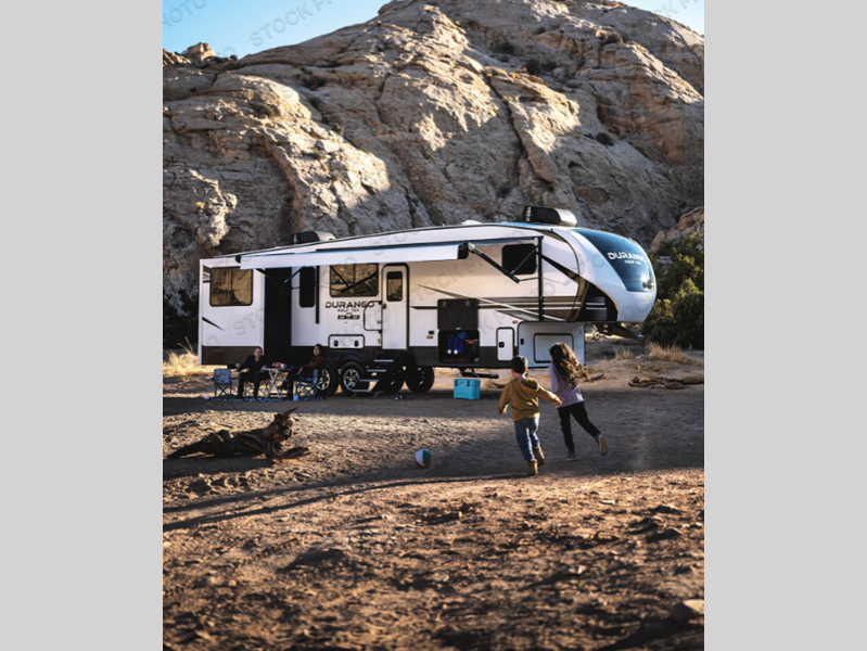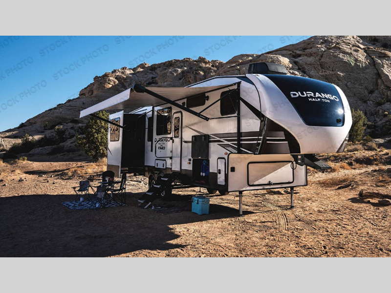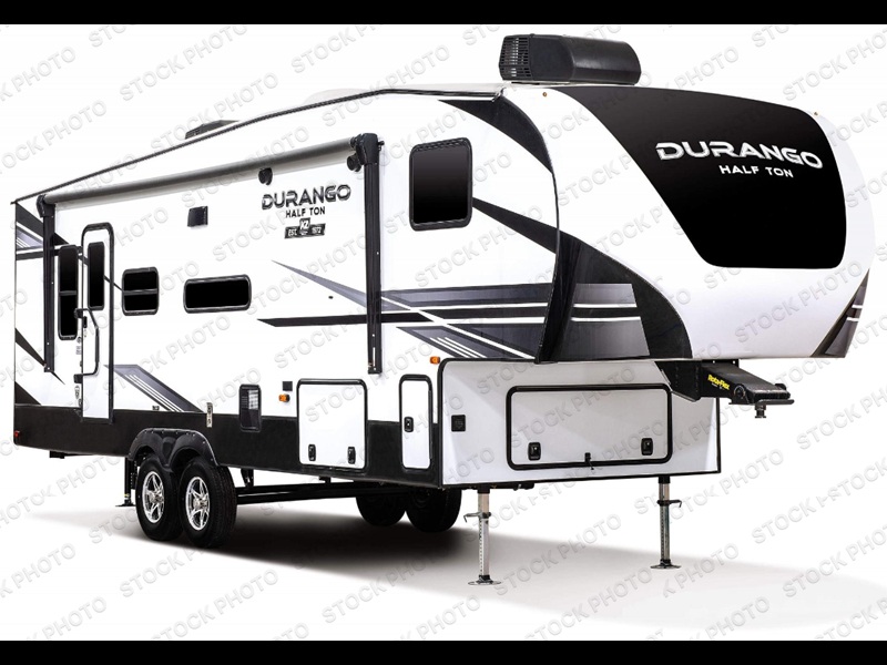 You will be absolutely impressed by the KZ Durango Half-Ton fifth wheel! With sumptuous décor and unparalleled quality, there isn't much else that compares. The Durango Half-Ton fifth wheel has a Lamilux gel-coat fiberglass, a steel powder-coated frame, a one-piece, seamless, walk-on Tufflex roof, and a reinforced heavy-duty fiberglass front cap. You can travel confidently with the Dexter axles that have self-adjusting brakes, the Equa-Flex rubberized suspension, and the 16" nitro-filled tires, and the exterior speakers and electric awning with LED lights will make for a great party space once you have made it to your destination. The fully finished, heated and sealed basement storage compartment will safely transport your gear to the campsite, and you can use the leash latch with bonus beverage holder to keep your puppy secured while playing outside.