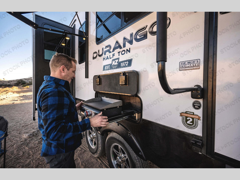 You will have a great time making memories in this Durango Half-Ton fifth wheel! The rear living room is going to be the best place to spend your evenings. With its rear entertainment center, 65" LED TV, opposing hide-a-bed sofa slides, and theater seating with USB charging ports, this space is comfortable and convenient. You can also make it even more cozy by adding the optional 48" fireplace. Back in the kitchen area, there is a dinette that has two free-standing chairs on one side and booth seating on the other side, and the kitchen appliances sit nicely on the large slide. You can get some privacy by heading up to the private bedroom, and you can also head outside to cook some dinner on the outdoor griddle.