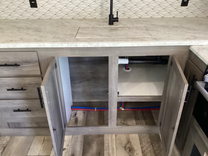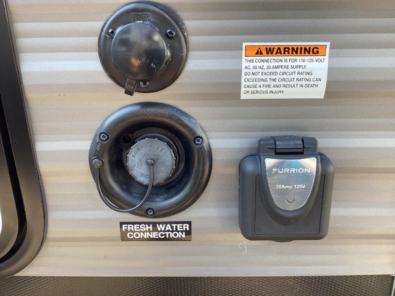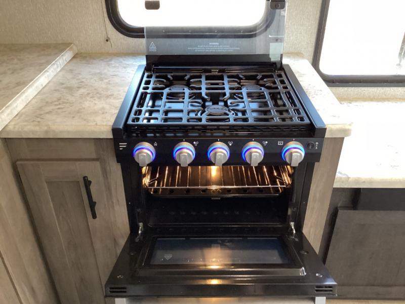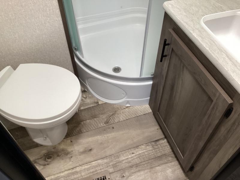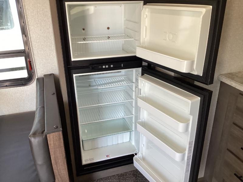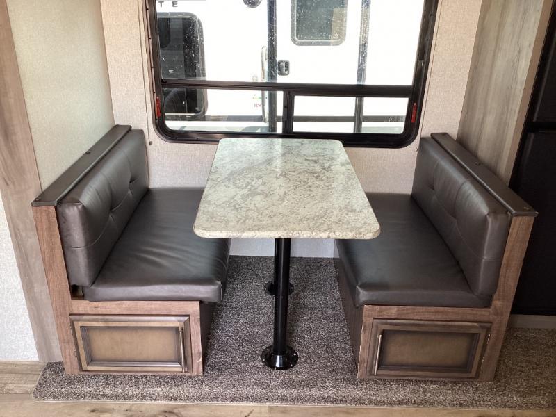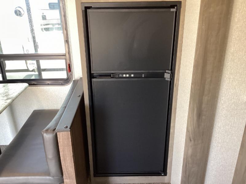You and your spouse will love camping in this travel trailer with its front kitchen layout! With this design, it provides lots of counter space for you to prepare a delicious home cooked meal. You can enjoy your meals at the 70" jackknife sofa dinette with a center console and built-in bolster arms, and the 10 cu. ft. refrigerator is right next to it so you can quickly grab a drink. The full bathroom has everything you will need to freshen up each morning including a power vent and a linen closet to store your towels. The rear private bedroom features a queen bed with closets and nightstands on either side to place your electronics or a glass of water!