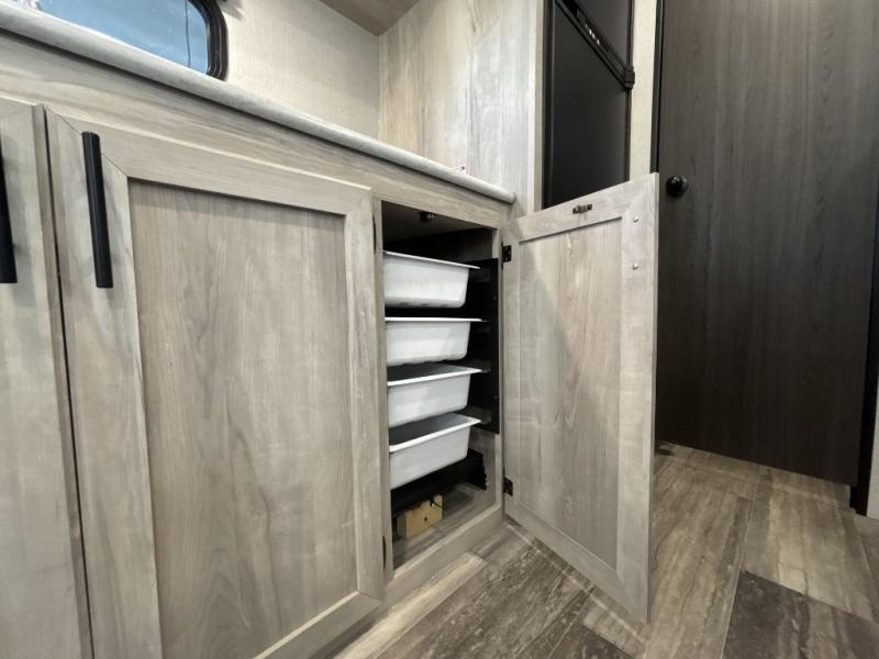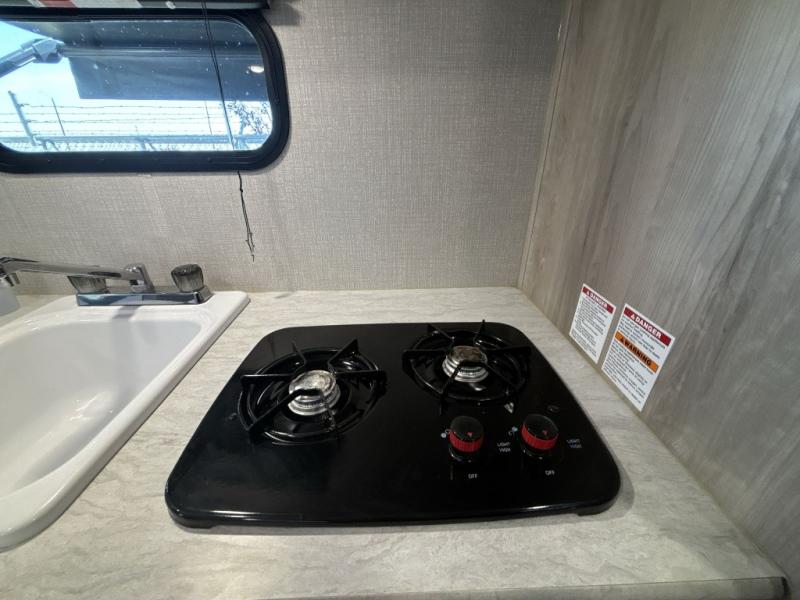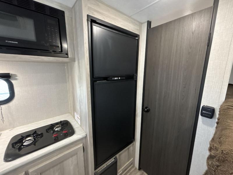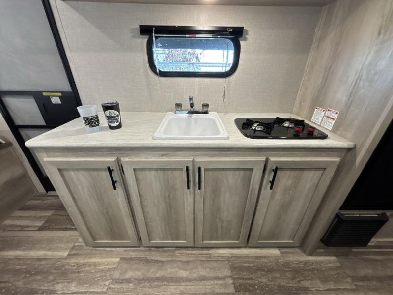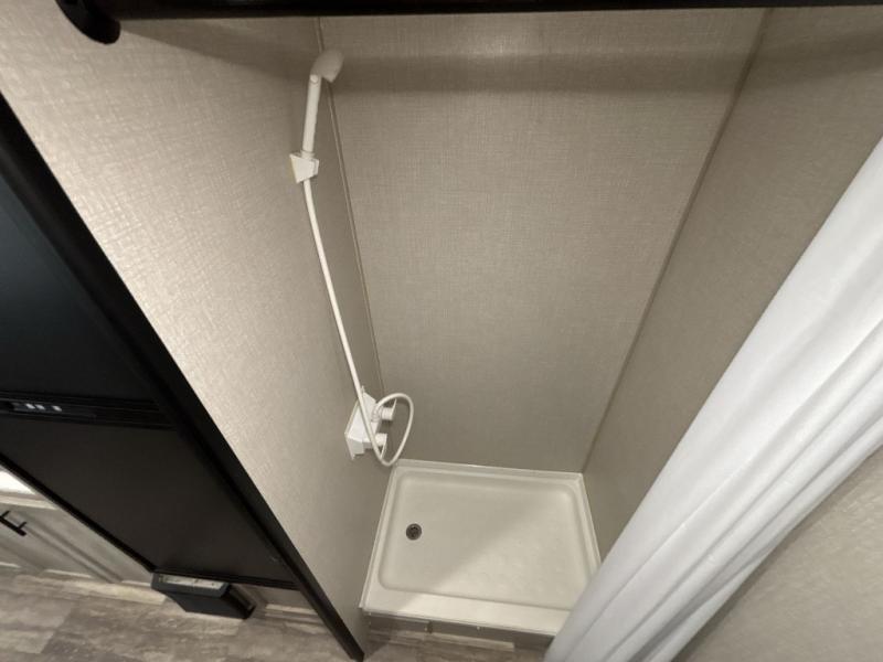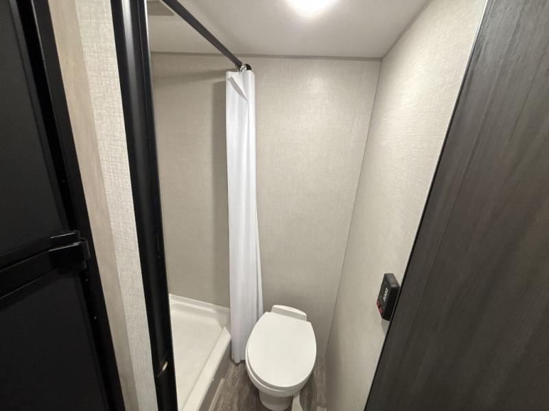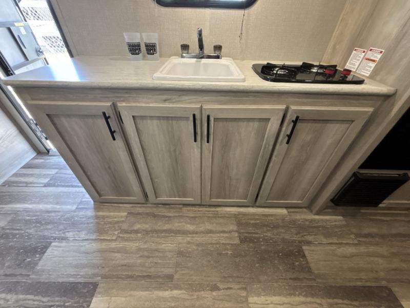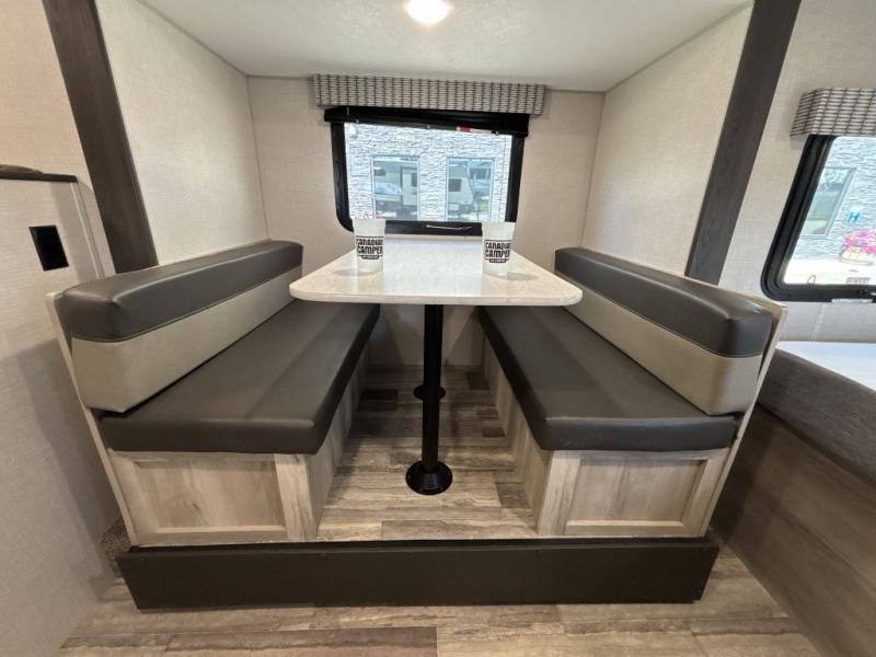 You can take the kids or your next door neighbors with you on your next camping adventure with this travel trailer! They can sleep on the rear corner set of 28" x 75" bunk beds and you can sleep on the front 54" x 80" bed. They can even bring a friend or two to sleep on the booth dinette slide once it's converted. The corner bathroom has a toilet and a shower for everyone to rinse the sand off each day. The exterior pass-through storage area is big enough to store your favorite camping gear and the 14' power awning is a great place to relax underneath at night!