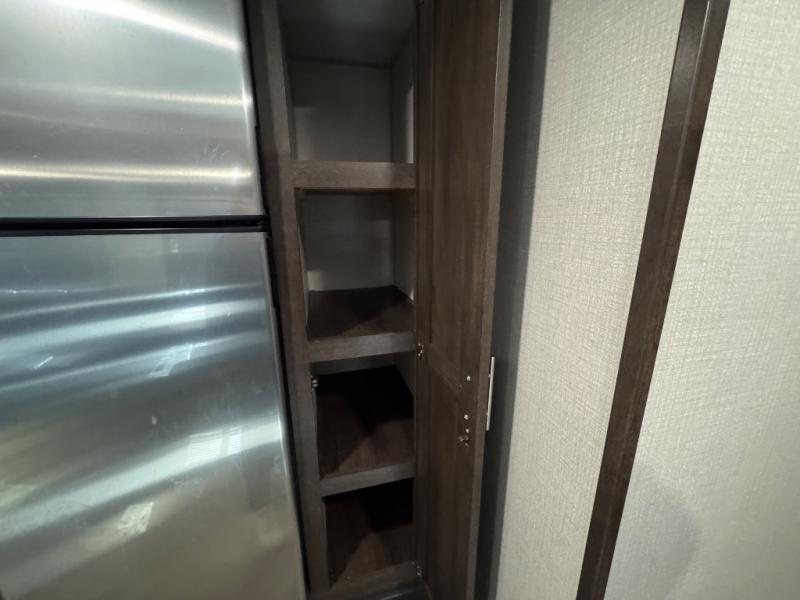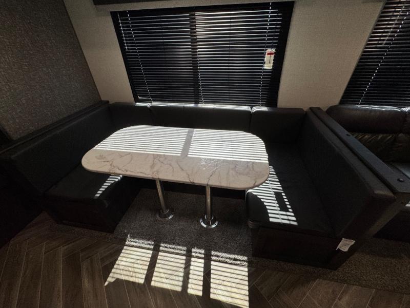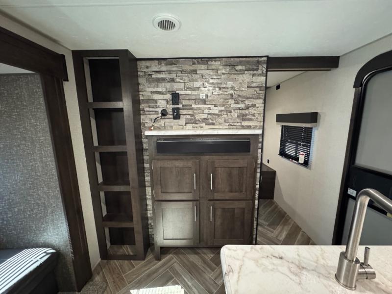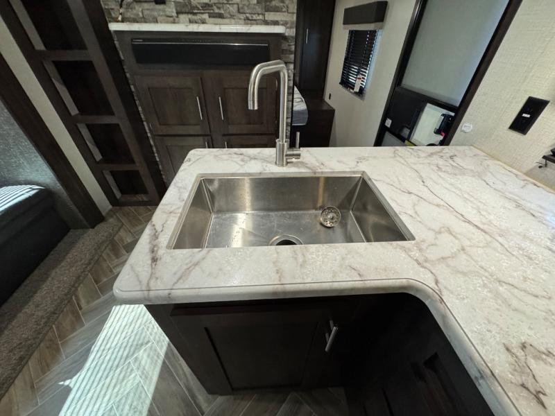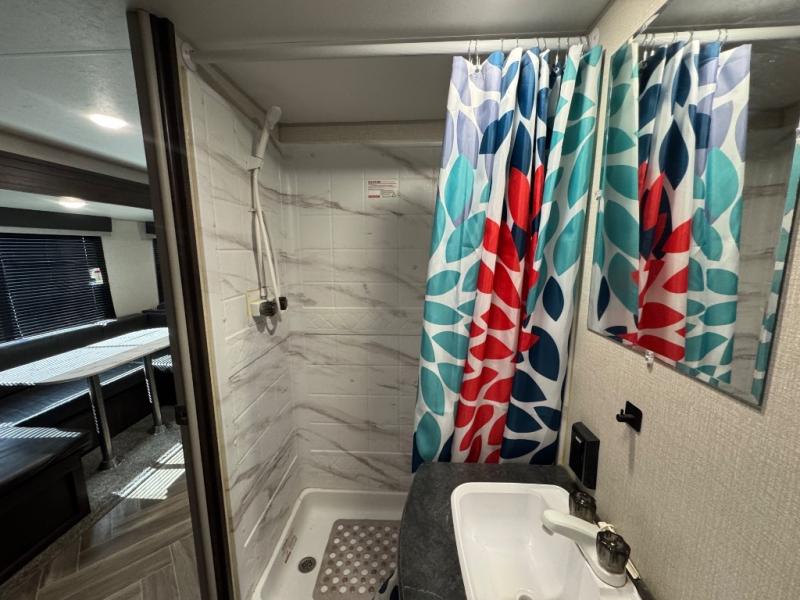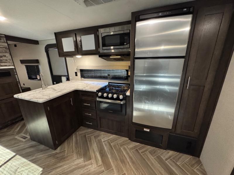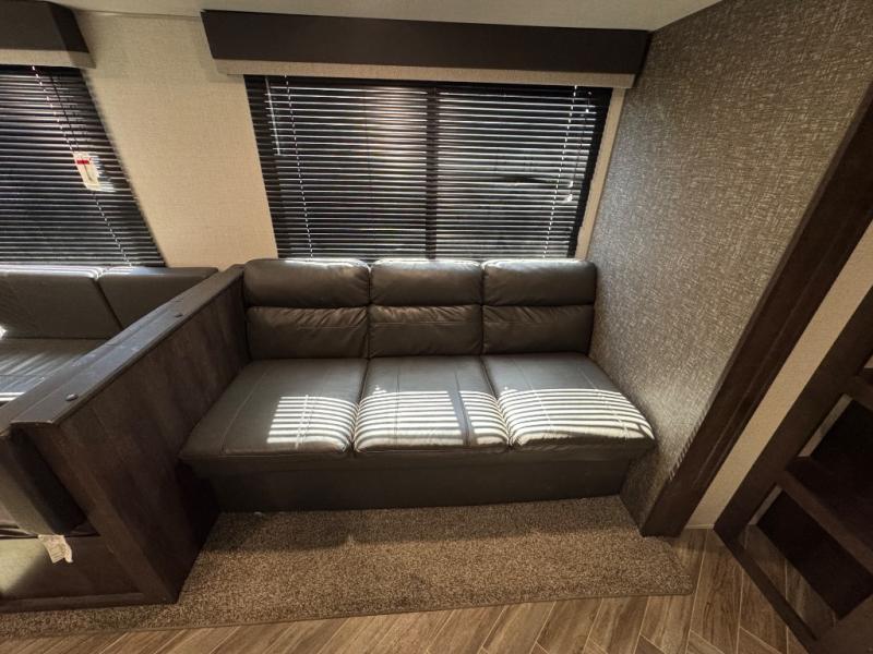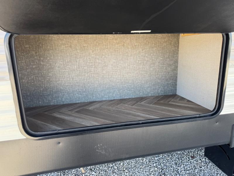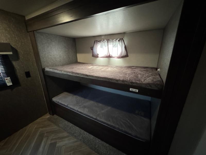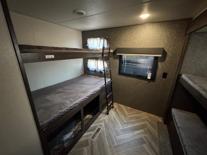 The cook will love the L-shaped kitchen allowing them to make warm meals without having to move for anyone walking through the trailer. They will have a large sink, plenty of counter space and all the appliances needed to make a holiday meal. And if you decided to add the outside kitchen option, the whole campgrounds can get fed. The 19' power awning offers an outdoor living area and the storage door and pass-through compartment will come in handy for the larger items. The living room slide offers furniture to dine, play games and even sleep when the private bunkhouse with four bunk beds isn't enough sleeping space. And you will love your own privacy in the front bedroom.