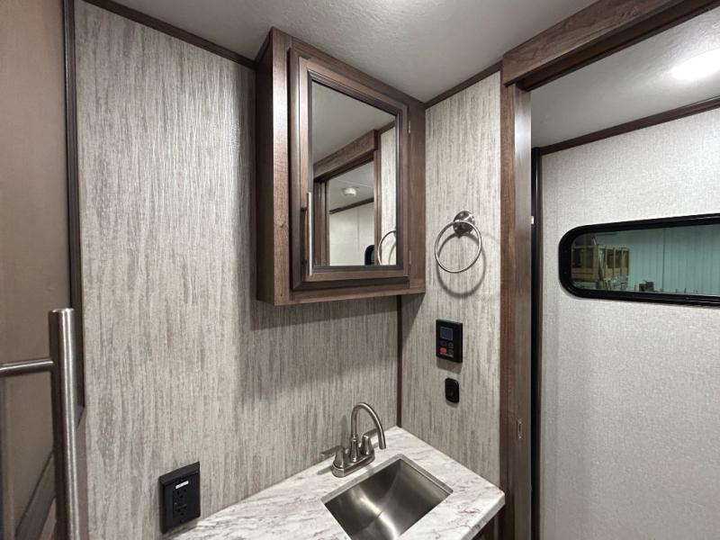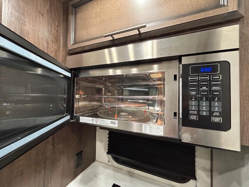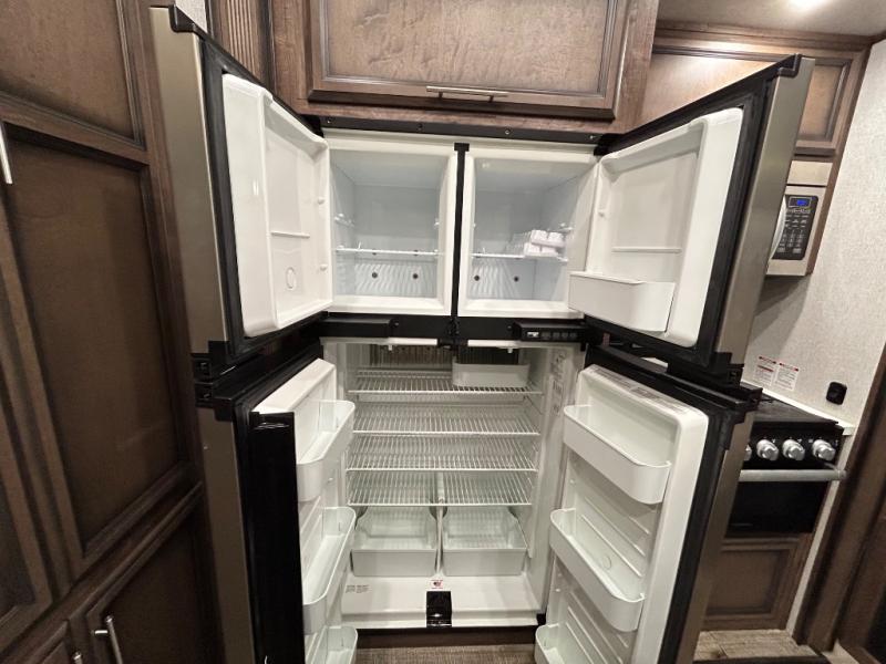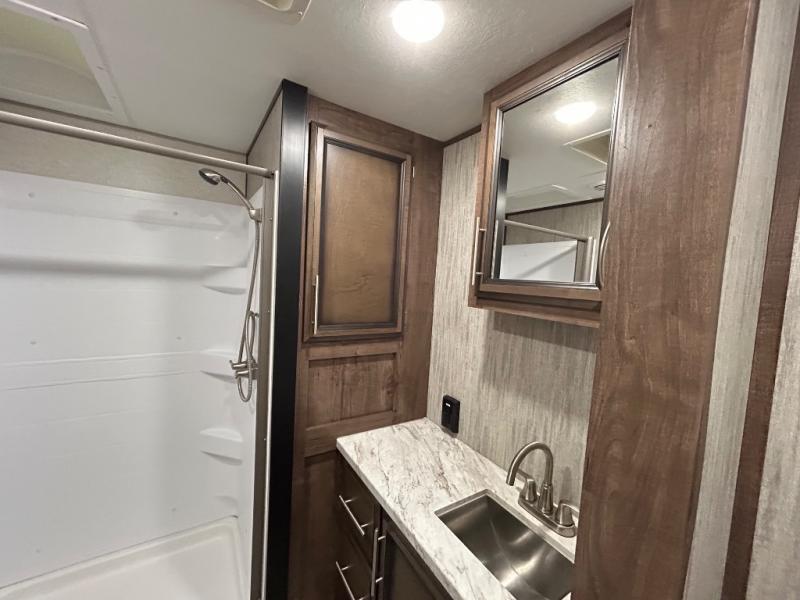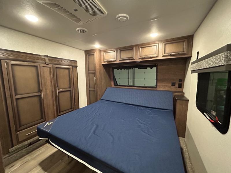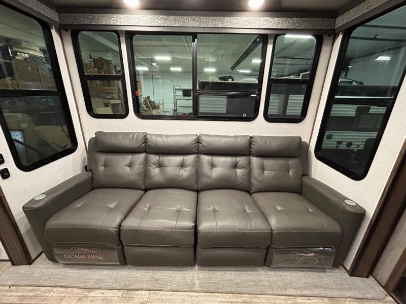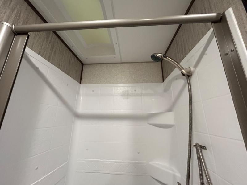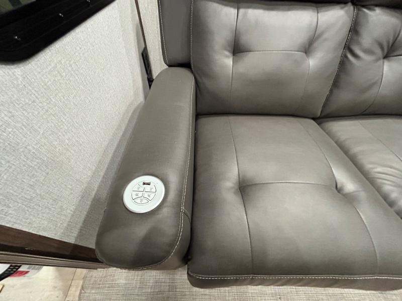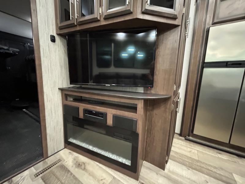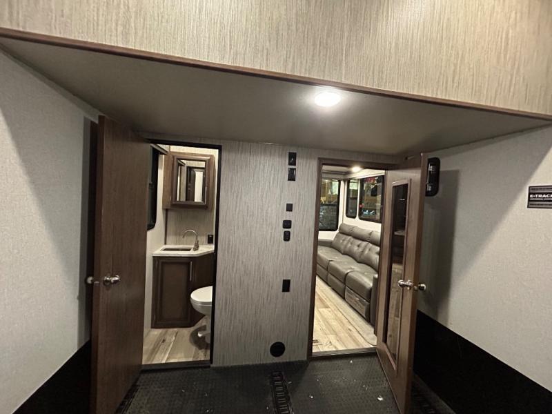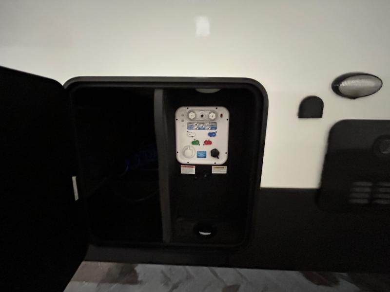 Easily load up your four-wheeler, motorcycles, or bicycles in the 13' separate garage and head to the campsite to easily unload and have fun! You might decide to add the power bed with sit and sleep option to the garage giving you space to invite friends to stay the night in their own room. The 30 gallon fuel tank will allow you to fill up your toys without having to go into town, the retractable screen wall provides great views of your campsite, and the side man door offers quick access inside to get to the half bath. Everyone can gather in the main living and kitchen area to eat meals made in the full kitchen and watch the LED TV. You can dine at the kitchen island with two stools or on the super sofa with footrests. And the fireplace adds a coziness to this room. Everyone can get cleaned up in the full bathroom before finding a place to sleep which includes the loft bed, the super sofa, the master bedroom's electric-tilt king bed or choose the queen option.