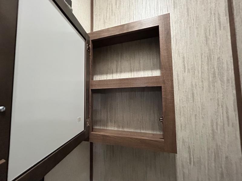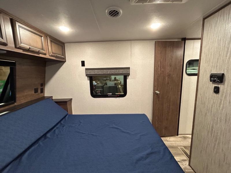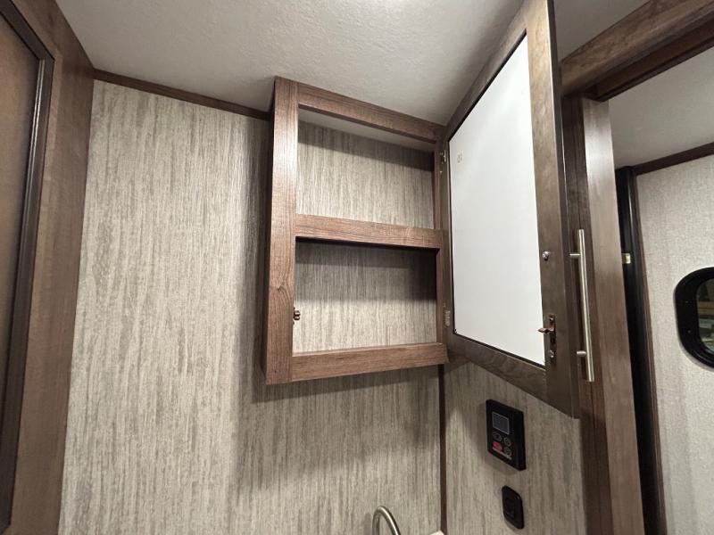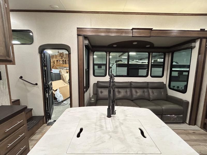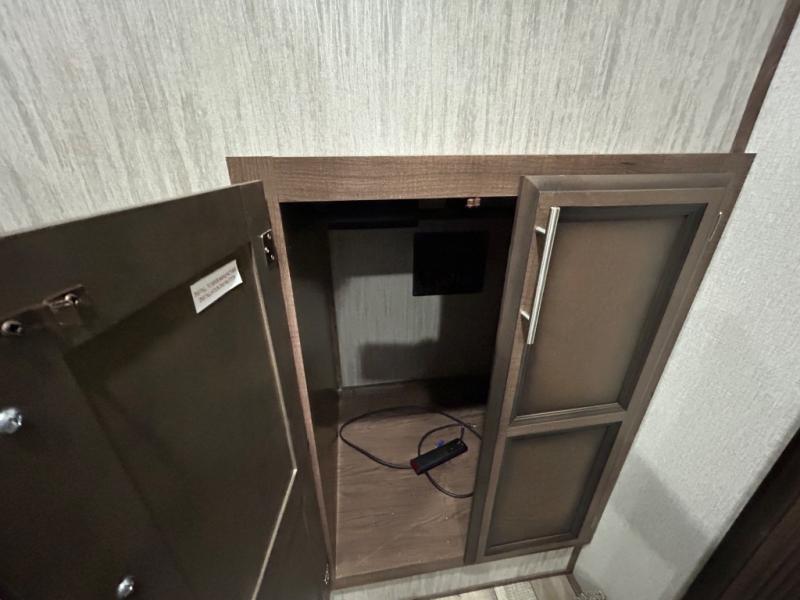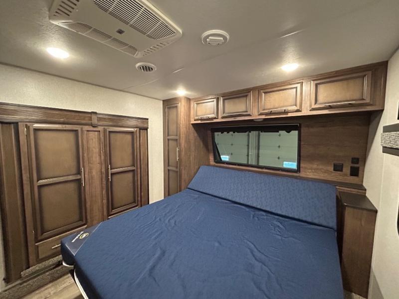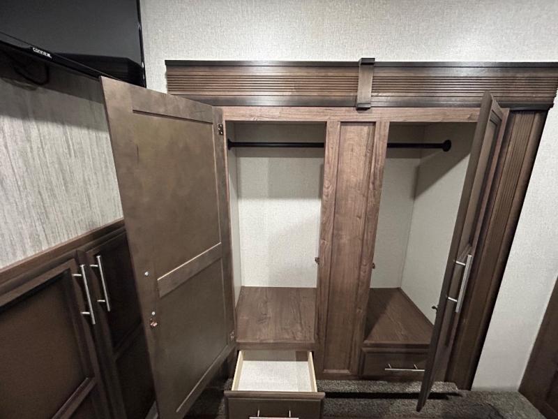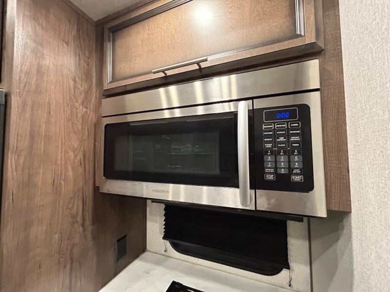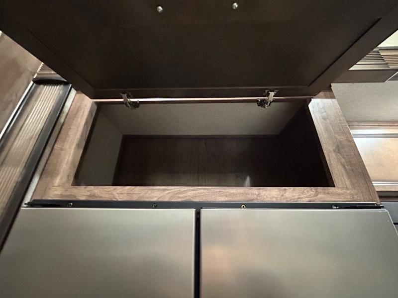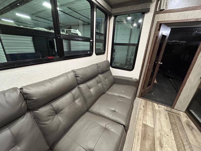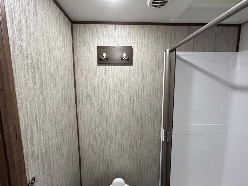 Easily load up your four-wheeler, motorcycles, or bicycles in the 13' separate garage and head to the campsite to easily unload and have fun! You might decide to add the power bed with sit and sleep option to the garage giving you space to invite friends to stay the night in their own room. The 30 gallon fuel tank will allow you to fill up your toys without having to go into town, the retractable screen wall provides great views of your campsite, and the side man door offers quick access inside to get to the half bath. Everyone can gather in the main living and kitchen area to eat meals made in the full kitchen and watch the LED TV. You can dine at the kitchen island with two stools or on the super sofa with footrests. And the fireplace adds a coziness to this room. Everyone can get cleaned up in the full bathroom before finding a place to sleep which includes the loft bed, the super sofa, the master bedroom's electric-tilt king bed or choose the queen option.