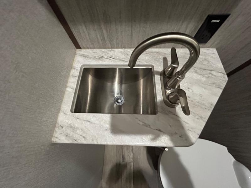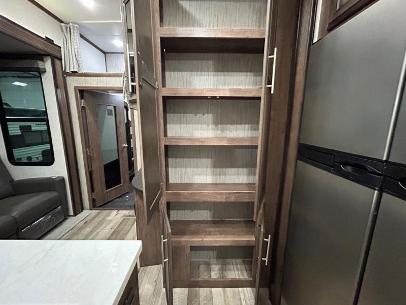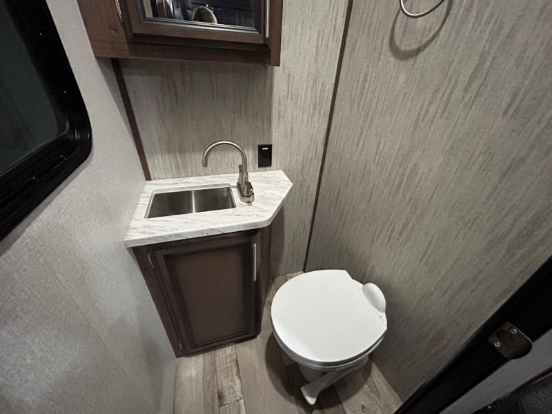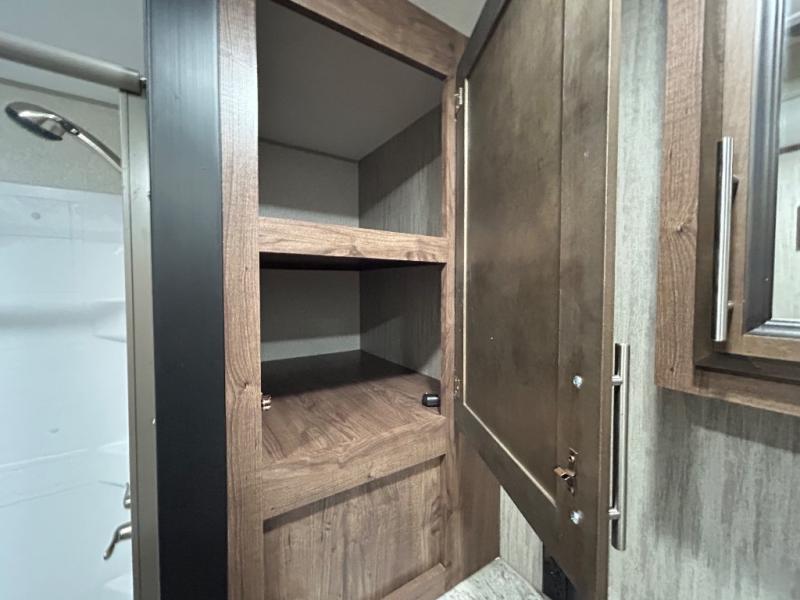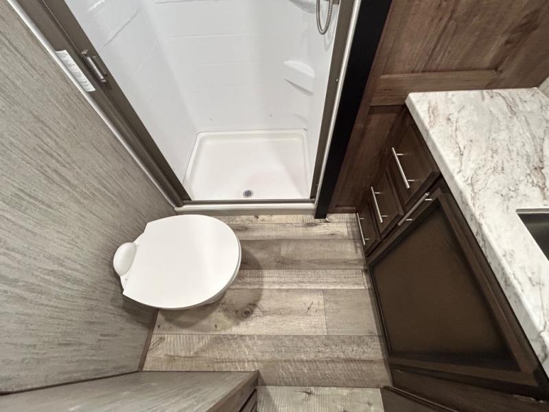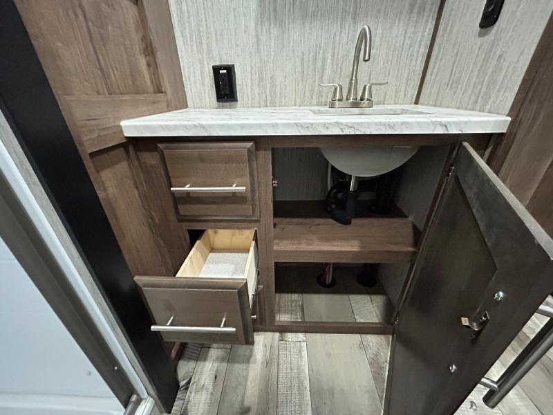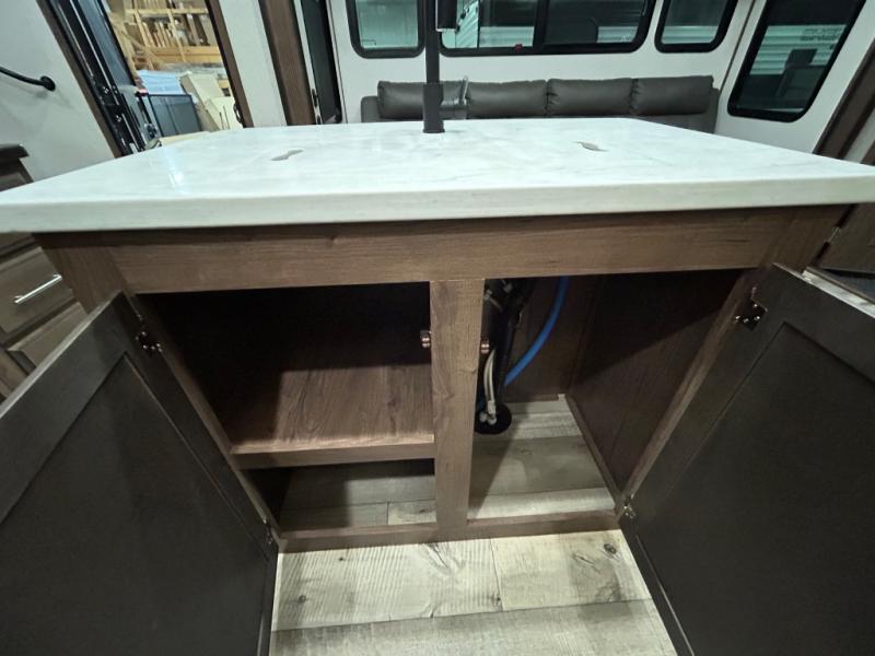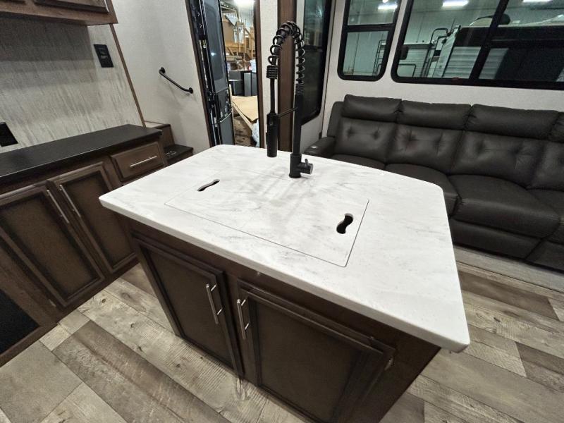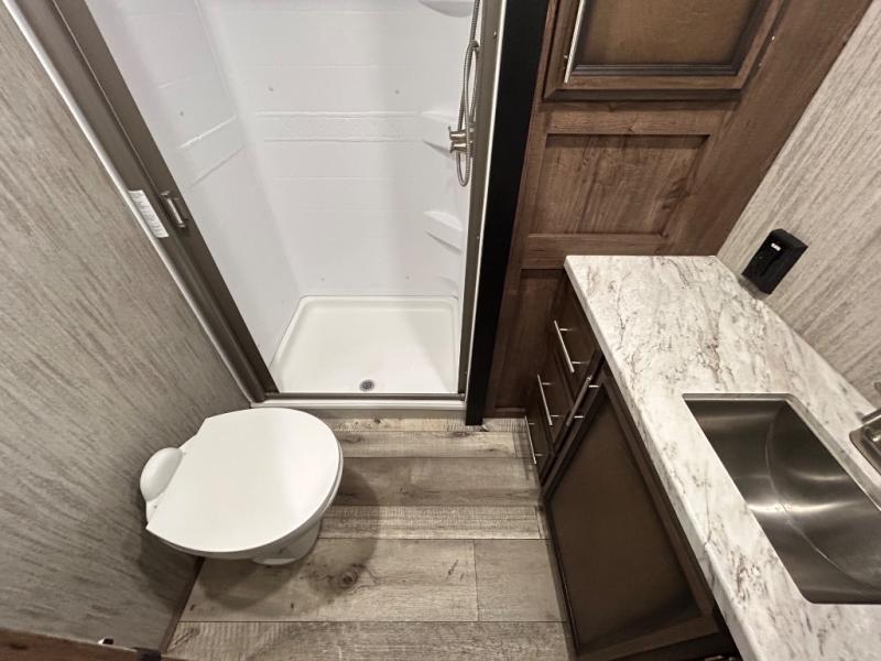 With any KZ Venom V-Series toy hauler fifth wheel, you will have the E-track universal track system with different fittings allowing you to quickly snap in and secure your load for travel, a Zero-G ramp door, and generator prep with a 30 gallon fuel tank and pump station. Other features that stand out include six-point electric auto leveling, Equa-Flex suspension, and Tufflex roofing material for a flexible, puncture resistance and reflective roof. The fully vented attic system provides two attic vents for escape routes for unwanted moisture, and the All-Weather Insulation package allows you to travel during any season. The interior provides deluxe residential-style furniture, decorative lighting above many cabinets, heavy-duty 100 lb. drawer glides on every drawer, and a On-Demand tankless water heater with digital user control panel. Going off-road doesn't mean you have to give up any luxuries, choose your favorite Venom V-Series today!