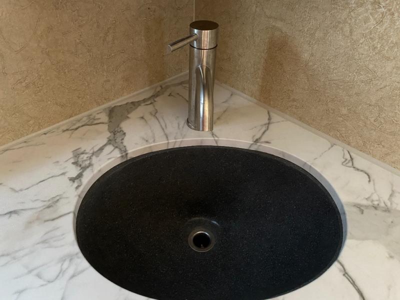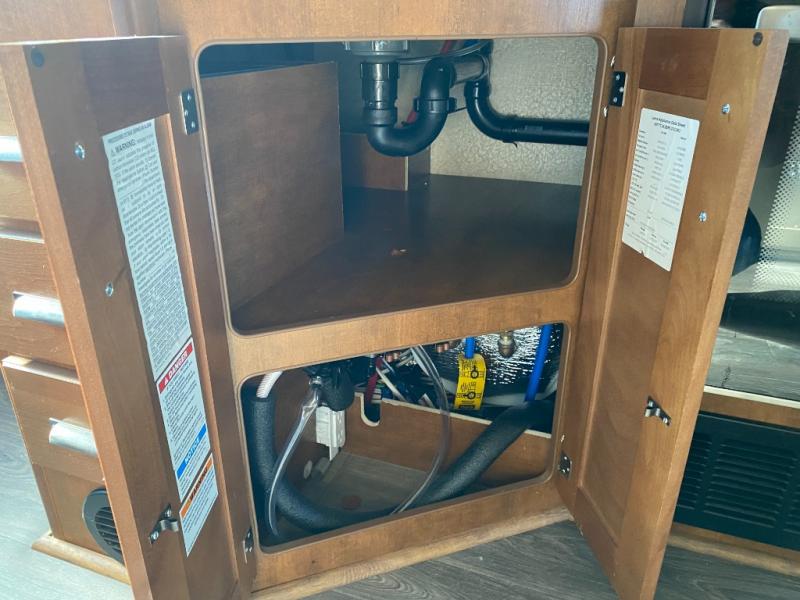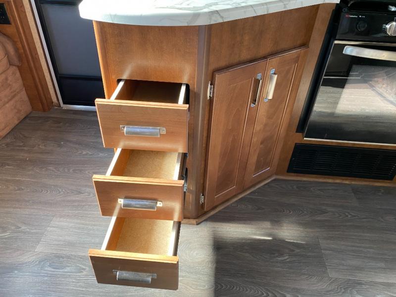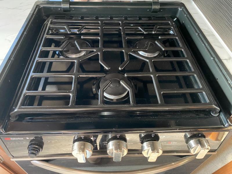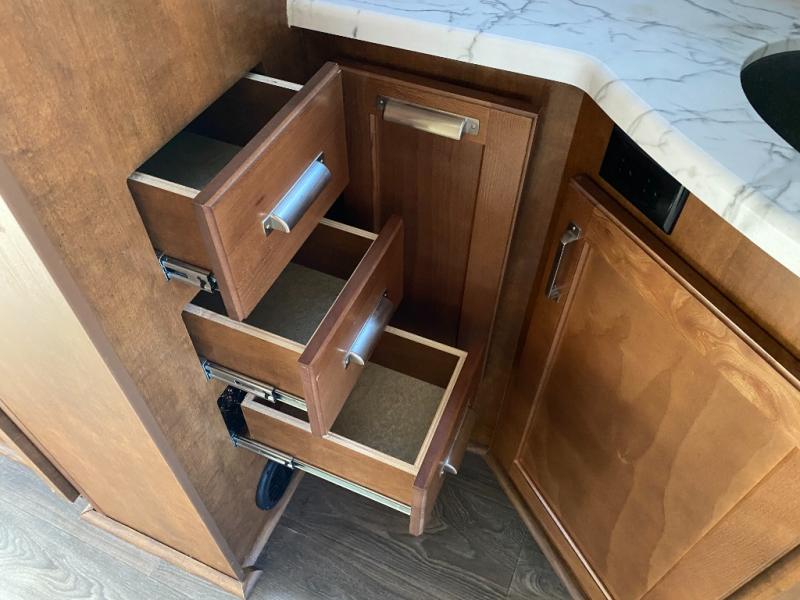 Solid-surface countertops, stainless appliances, excellent storage, and quality craftsmanship make cooking on the road feel effortless.