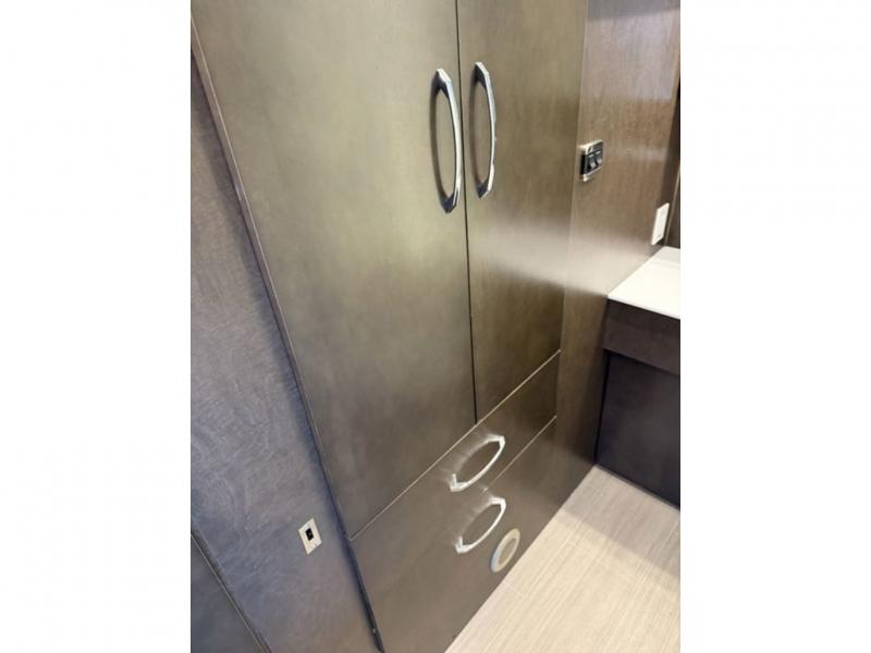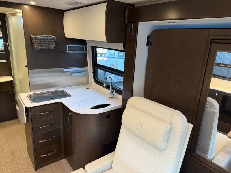 With a large residential-style bathroom in this Unity Class B+ diesel motorhome, you will enjoy every moment you spend cleaning up in the radius shower, and the skylight above will deliver more height and extra sunshine to illuminate the entire space. During the day you can host friends and family with the swivel cab chairs and standard Leisure Lounge, or you can choose to add the optional Leisure Lounge Plus. Once the party has ended, you can rest peacefully for the evening after you've turned down the Murphy bed. The next morning you might decide to make breakfast on the cooktop or in the convection microwave and serve from the countertop extension or on the Corian solid-surface countertops.