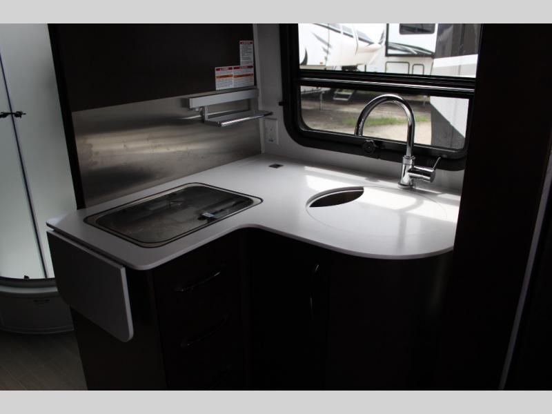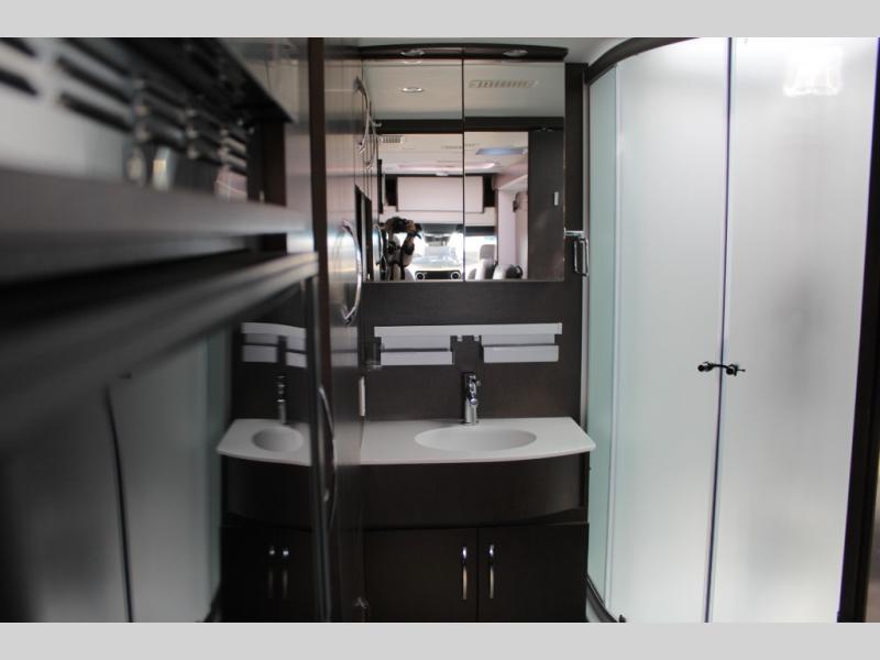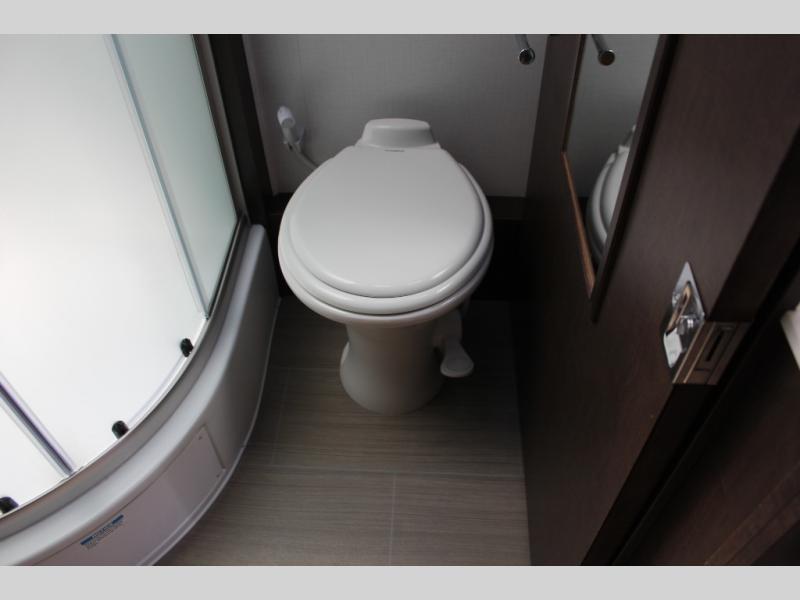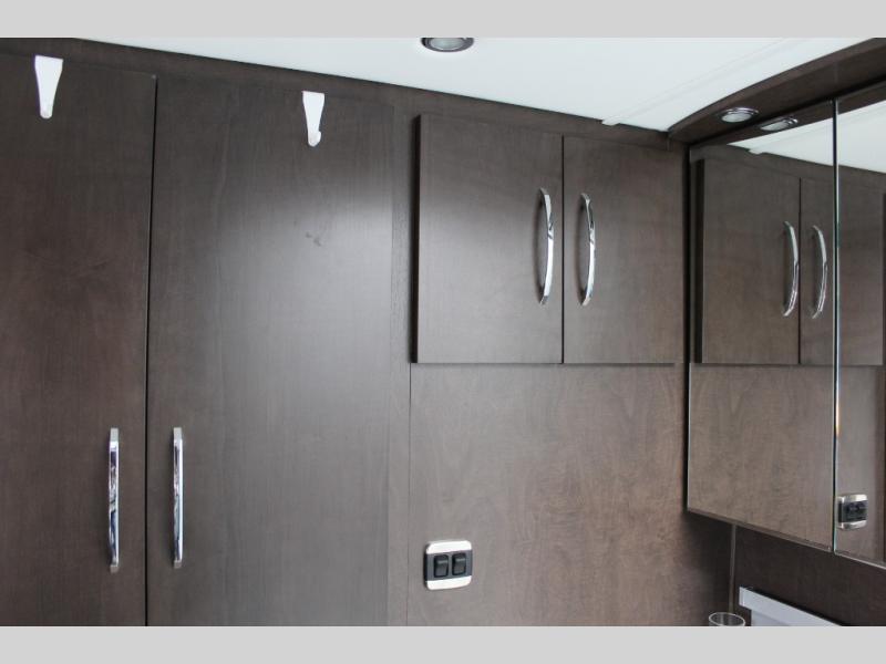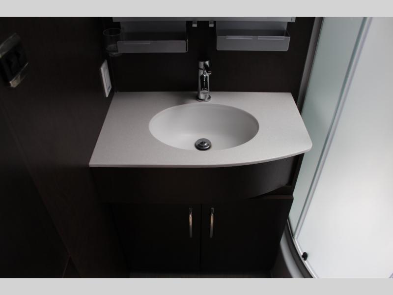 With a large residential-style bathroom in this Unity Class B+ diesel motorhome, you will enjoy every moment you spend cleaning up in the radius shower, and the skylight above will deliver more height and extra sunshine to illuminate the entire space. During the day you can host friends and family with the swivel cab chairs and standard Leisure Lounge, or you can choose to add the optional Leisure Lounge Plus. Once the party has ended, you can rest peacefully for the evening after you've turned down the Murphy bed. The next morning you might decide to make breakfast on the cooktop or in the convection microwave and serve from the countertop extension or on the Corian solid-surface countertops.