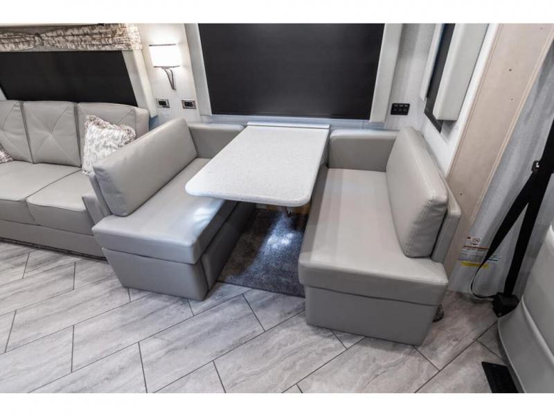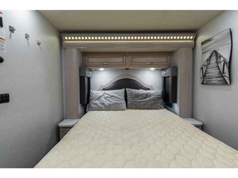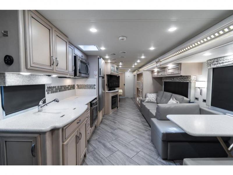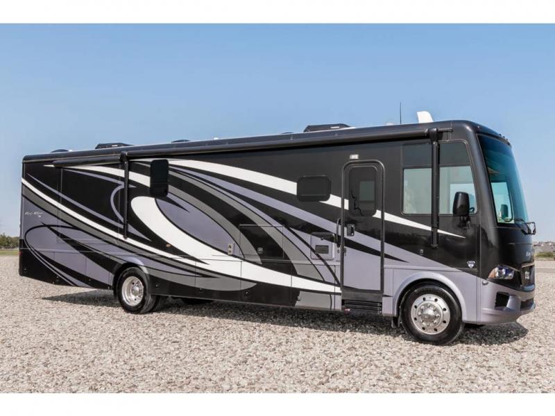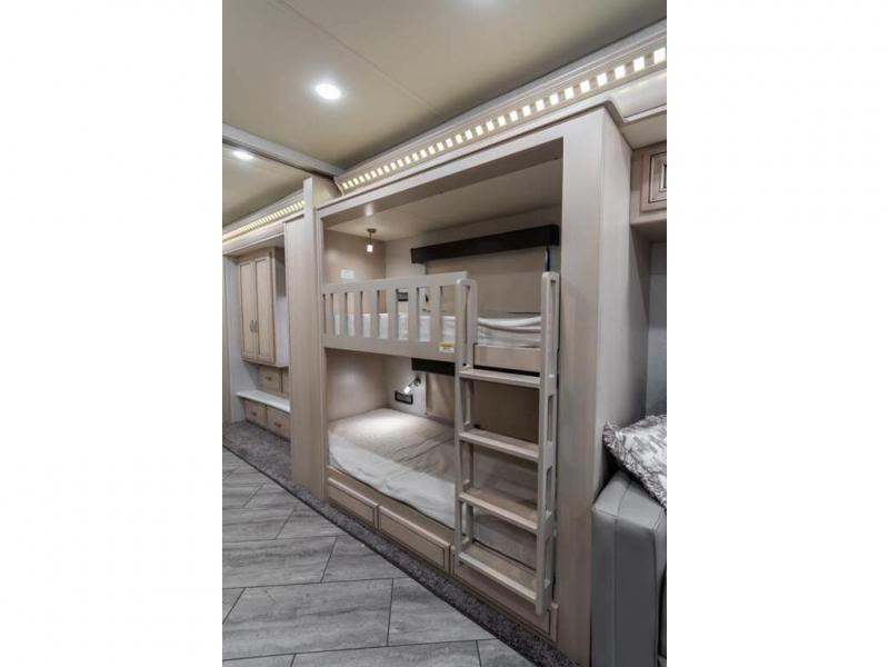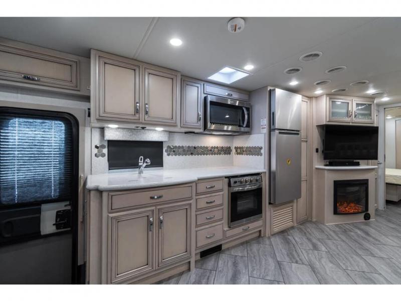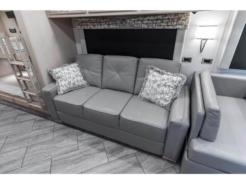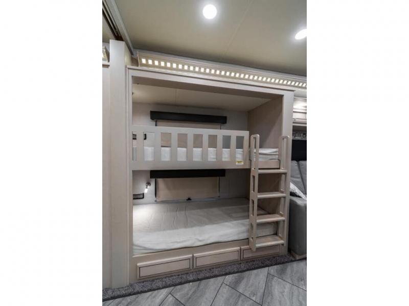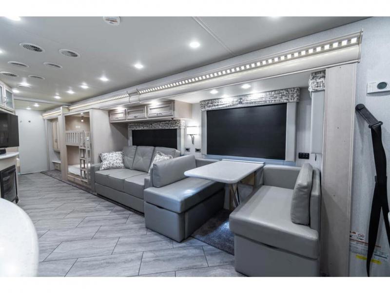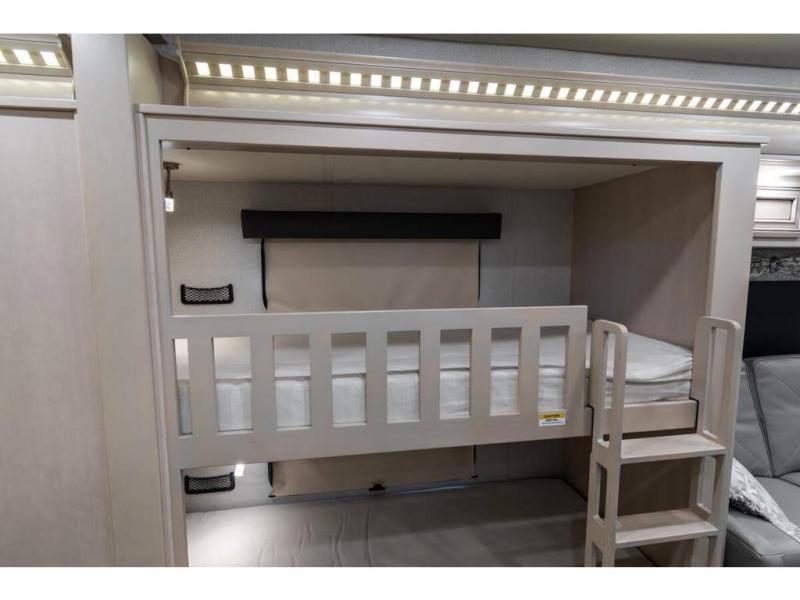 Your family vacation just got a whole lot sweeter in this motorhome that can sleep six to seven people each night. The bunk beds within the full-wall slide will be perfect for the kids and the slide out queen bed is great for mom and dad. Any additional guests can sleep on the comfort lounge or the booth dinette. Preparing meals is easy on the recessed three burner range or you can use the convenient stainless steel microwave. There is a dry bar with a Samsung LED TV for movie night, and you can grab the popcorn from the pantry. If you'd rather spend the evening outdoors, the power awning with LED lights will create an inviting outdoor living space. This model also includes a bath and a half so you don't have to worry about waiting in line any longer!