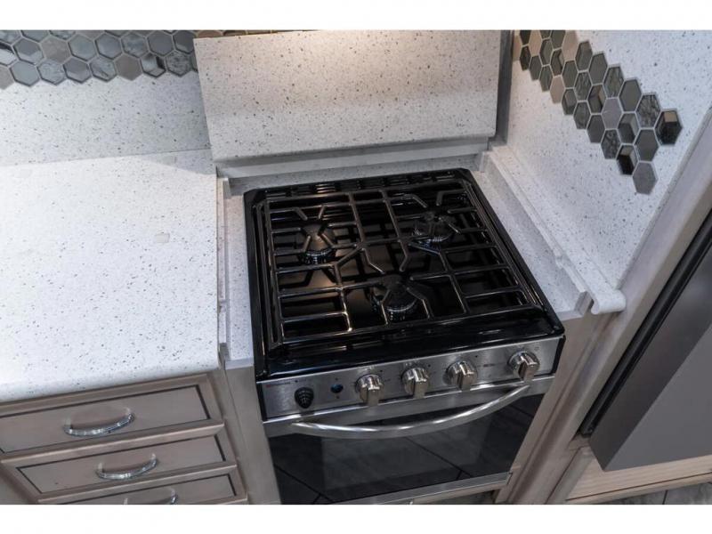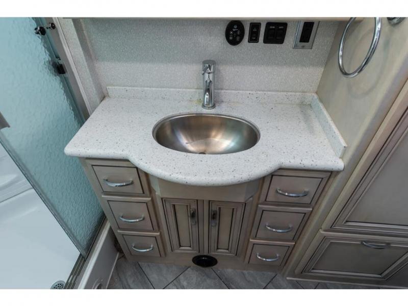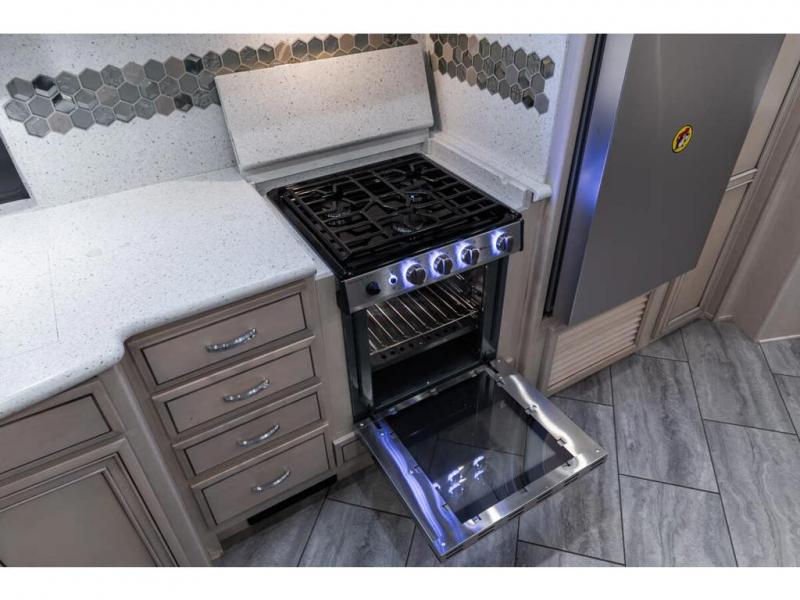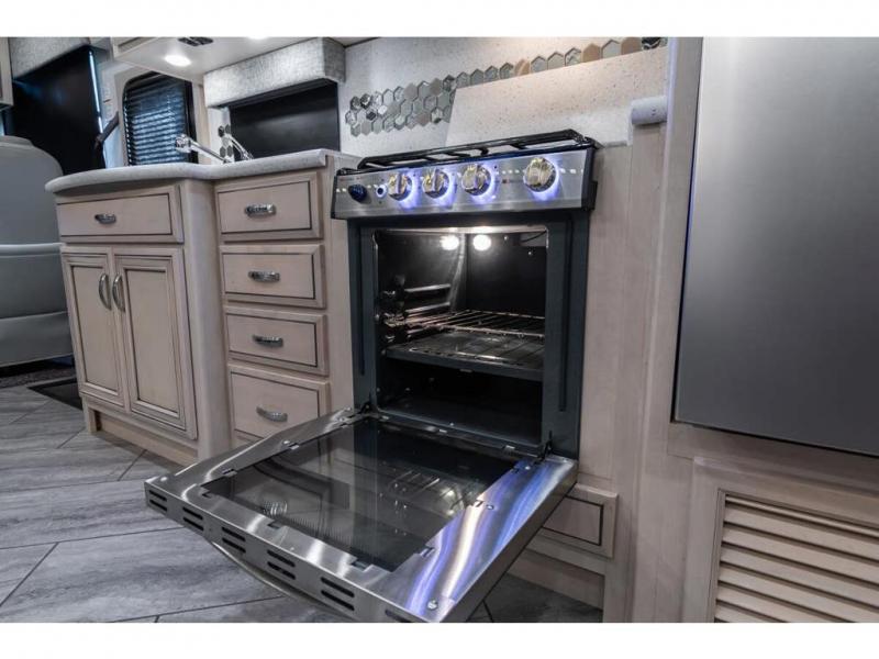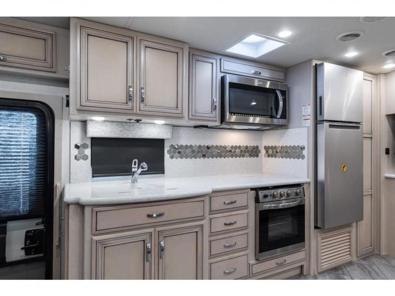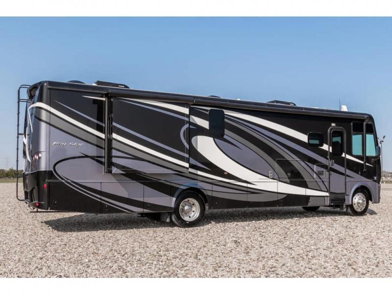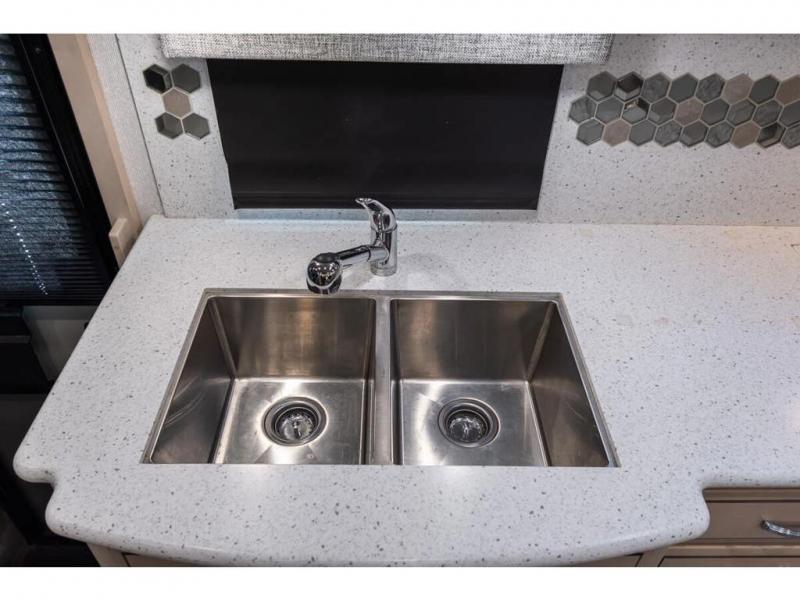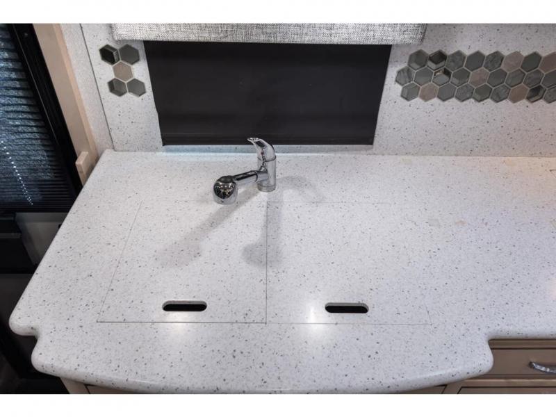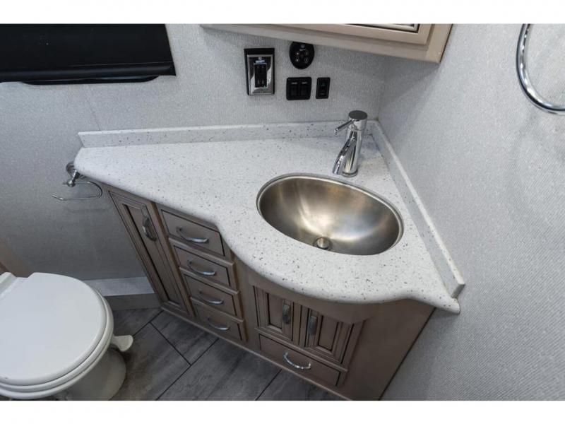 With any Bay Star Class A gas motorhome by Newmar you will be getting a quality motorhome that will make family time easier than ever. You will feel totally secure driving with the 7.3-liter V8 engine that sits on a Ford F-Series chassis, and features 350 HP to power your family vacations across the states. The electronic stability control will make the journey just as sweet as the destination, and the smart level hydraulic leveling jacks include a Bluetooth compatible touch pad to make set-up a breeze once you arrive. Each model is constructed with a BriteTEK roof with a walkable deck, aluminum-frame sidewalls and roof construction, plus Polar Pak R19 batten insulation in the roof so you can travel year around. The chef of the family will love the Bay Star kitchen with its handmade cabinetry, polished solid surface countertop with a stainless steel sink, plus vinyl flooring that is both eye-catching and easy to clean.