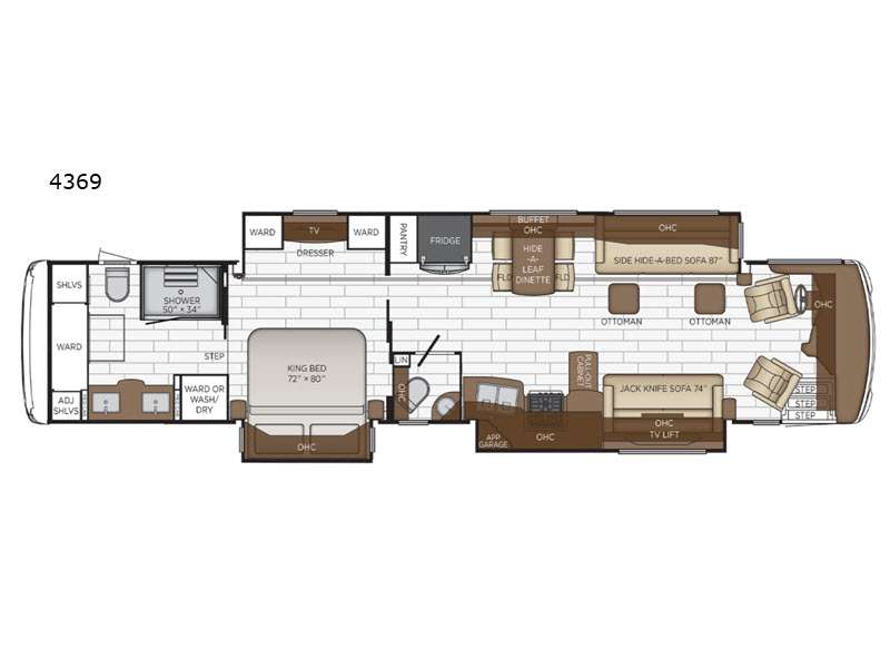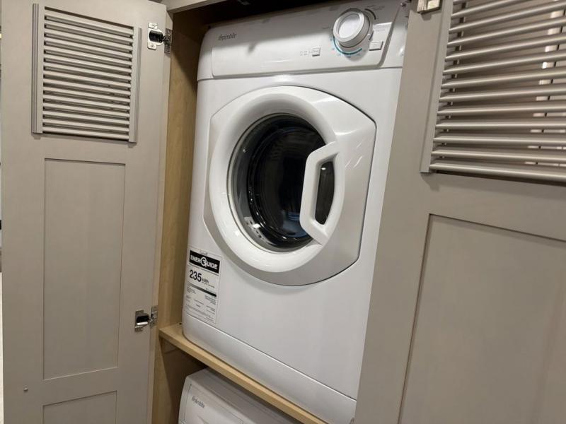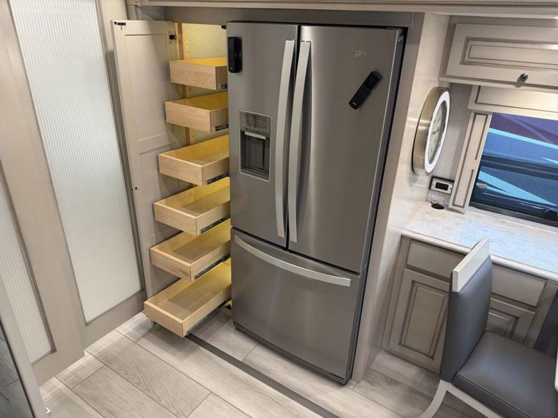 Luxury is waiting for you in this spacious motorhome that can comfortably sleep five each night. The full-wall slide plus two additional slides will open up the whole unit for a more at-home feel. Relax on the hide-a-bed sofa with two ottomans or read a book on the jack-knife sofa. The passenger workstation or hide-a-leaf dinette will be the perfect place to catch up on some work while you're away from home. Easily prepare breakfast, lunch, and dinner on the three burner recessed gas cooktop, or use the convenient stainless steel convection microwave. This model features a master bedroom with a slide out pillow top king bed, dual wardrobes and a dresser, plus a 4K LED TV. You will love the rear bath cathedral ceiling that will add additional height, plus there is plenty of storage space and two bath sinks so you and your spouse can freshen up at once!