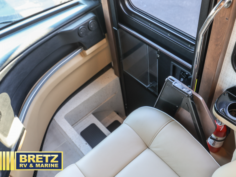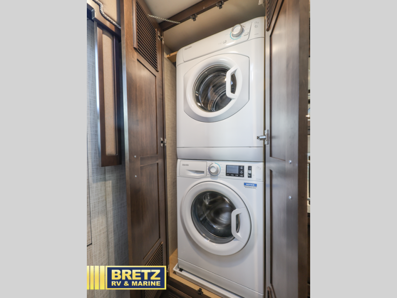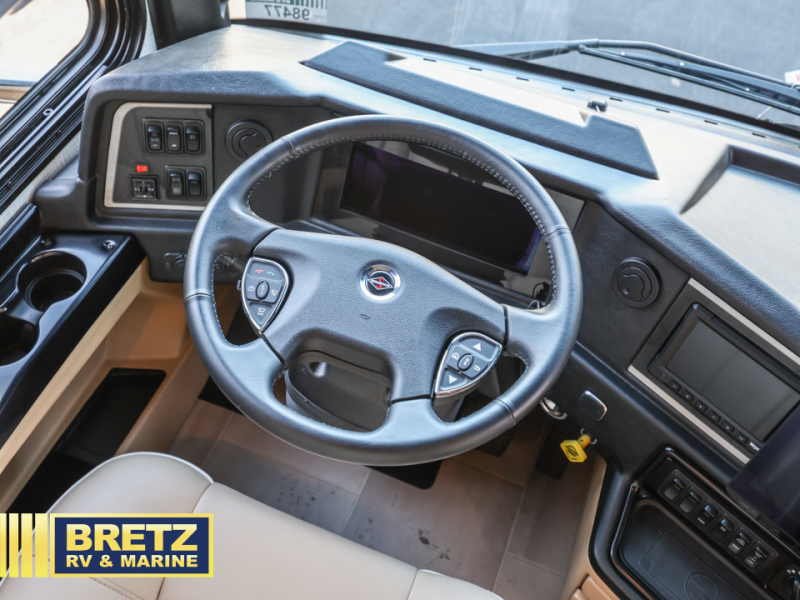 You won't believe all that comes standard in this Ventana Class A diesel motorhome! The full rear bathroom has a 35" radius shower, a wardrobe prepped for the optional washer and dryer to be added, and an additional wardrobe with a bi-fold door. As you walk through the private bedroom, you will find a pillowtop king-size bed, wardrobes on either side of the dresser, and a Samsung LED 4K TV for those sleepless nights. The pantry and Norcold 10-cu. ft. refrigerator are big enough to hold all of your favorite snacks and drinks, and you can enjoy game night at the booth dinette or simply relax in front of the fireplace on the 74" hide-a-bed sofa with ottomans. The front swivel captain's chairs, the Comfort Drive steering with adjustable control, and the glass dash instrumental panel ensure that you will have a comfortable and safe drive to your destination!