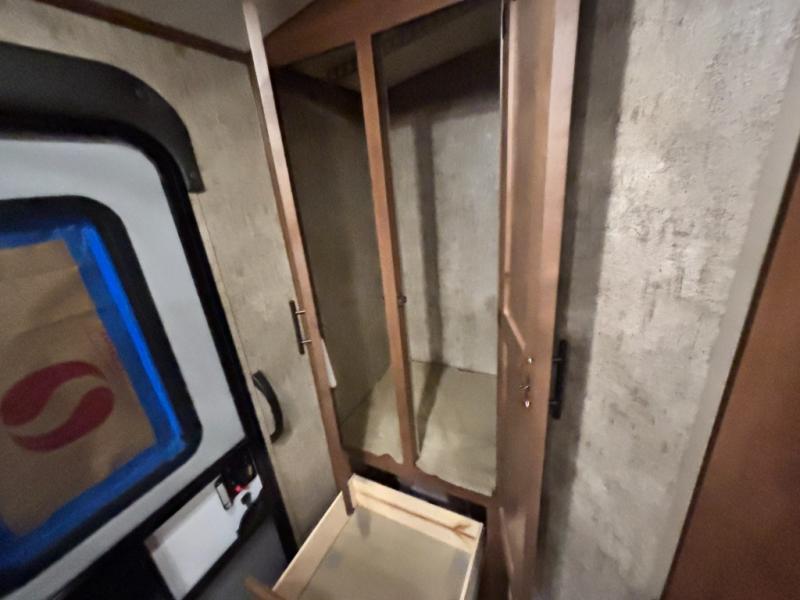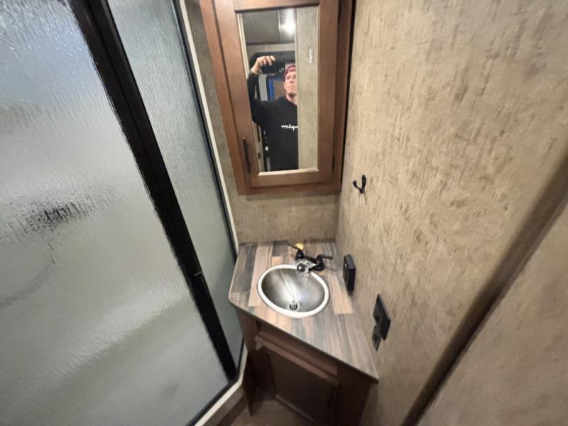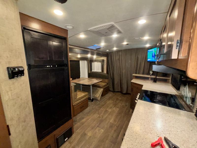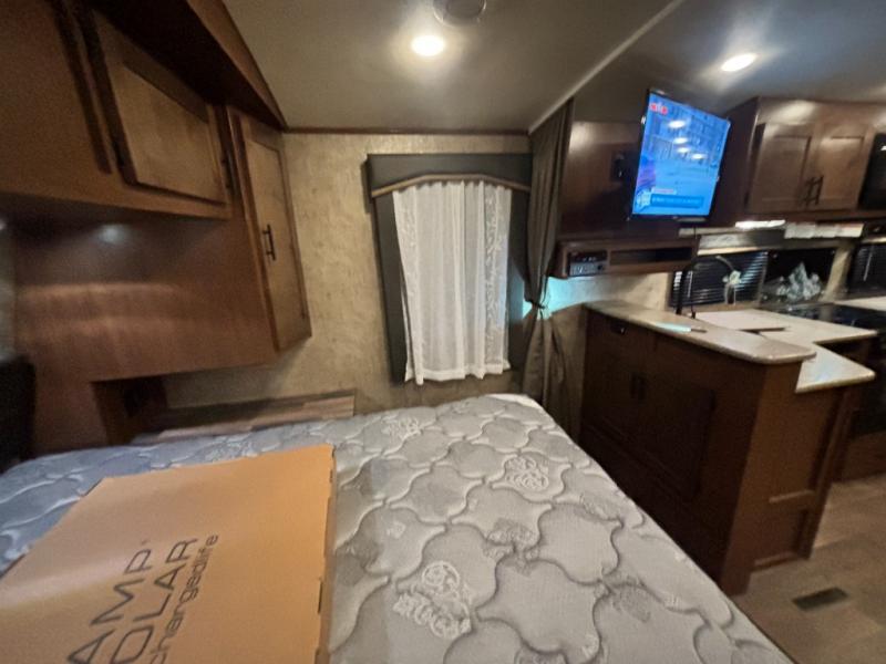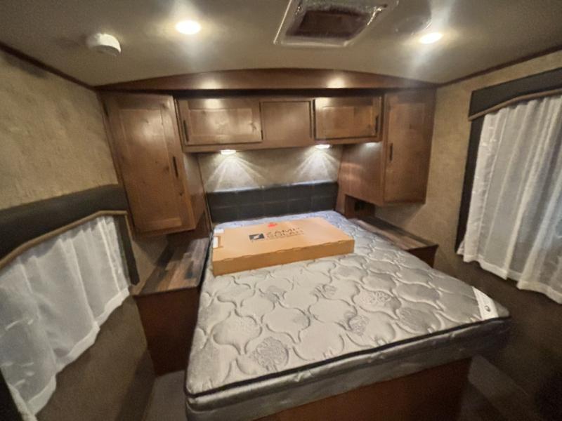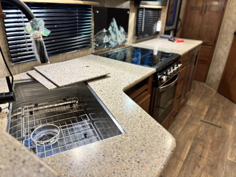 The perfect couples trailer for the adventurous duo! Once you have ventured to your destination, easily set up the single slide out Mountain dinette and adjustable electric awning, and head out to explore. Once you are ready to eat, you can make meals using the full amenities and enjoy the LG solid surface galley countertop to place your dishes on after washing them in the sink basin farm sink. You will surely love the knife rack and granite designed backsplash as well. The full bathroom is near a wardrobe by the entry making getting ready easy. And you can watch the 32" LED HDTV before bedtime, and sleep on your own queen-size bed with storage on both sides.