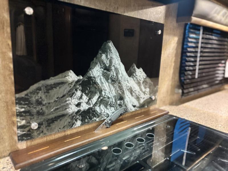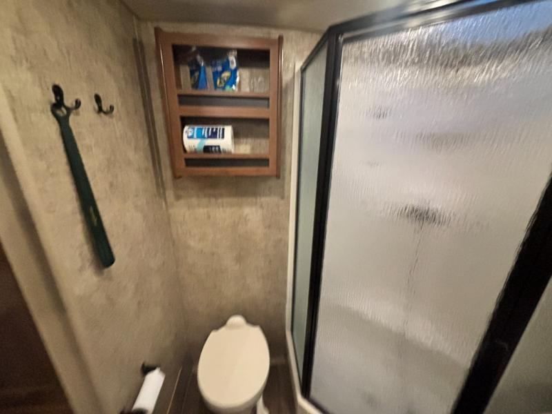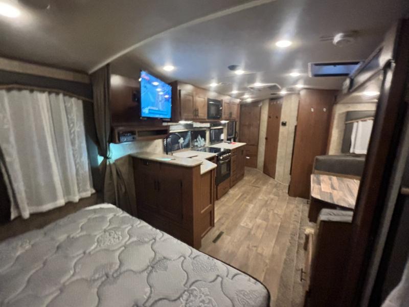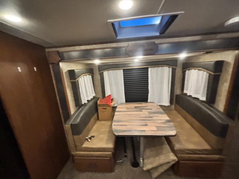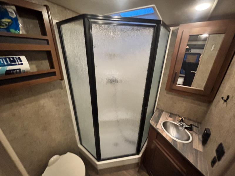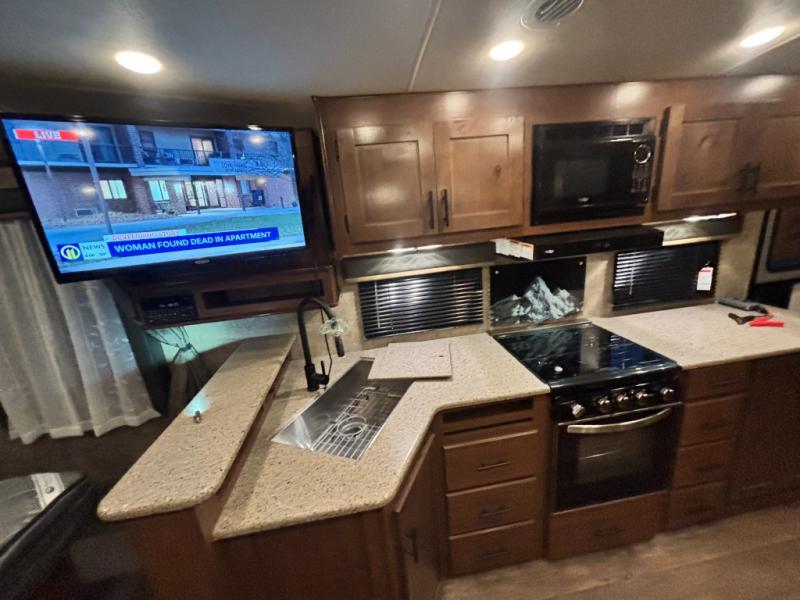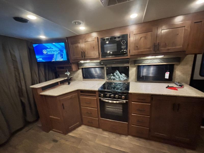 The perfect couples trailer for the adventurous duo! Once you have ventured to your destination, easily set up the single slide out Mountain dinette and adjustable electric awning, and head out to explore. Once you are ready to eat, you can make meals using the full amenities and enjoy the LG solid surface galley countertop to place your dishes on after washing them in the sink basin farm sink. You will surely love the knife rack and granite designed backsplash as well. The full bathroom is near a wardrobe by the entry making getting ready easy. And you can watch the 32" LED HDTV before bedtime, and sleep on your own queen-size bed with storage on both sides.