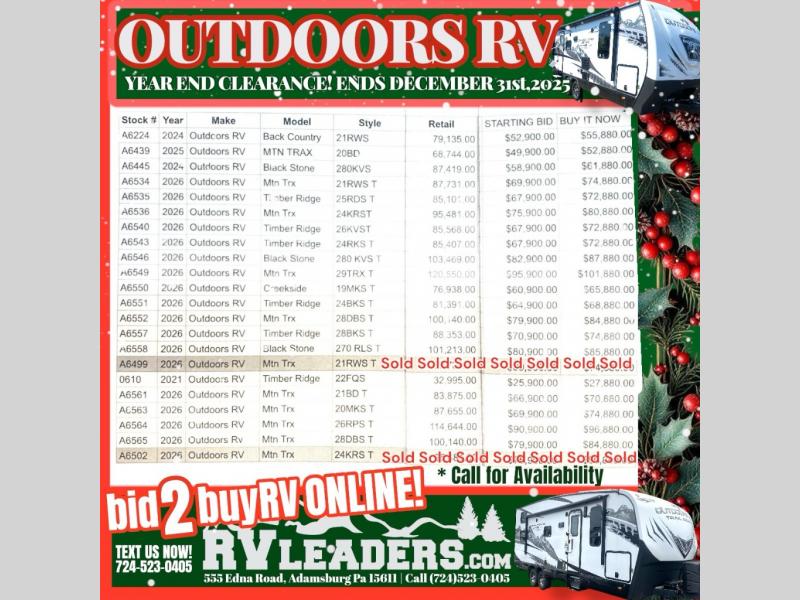 YEAR END "Bid2Buy" EVENT: STARTING BID $25,900Outdoors RV Timber Ridge Mountain Series travel trailer 22FQS highlights: