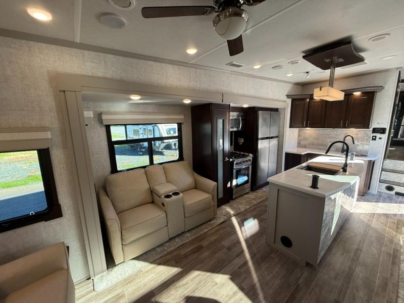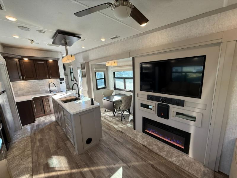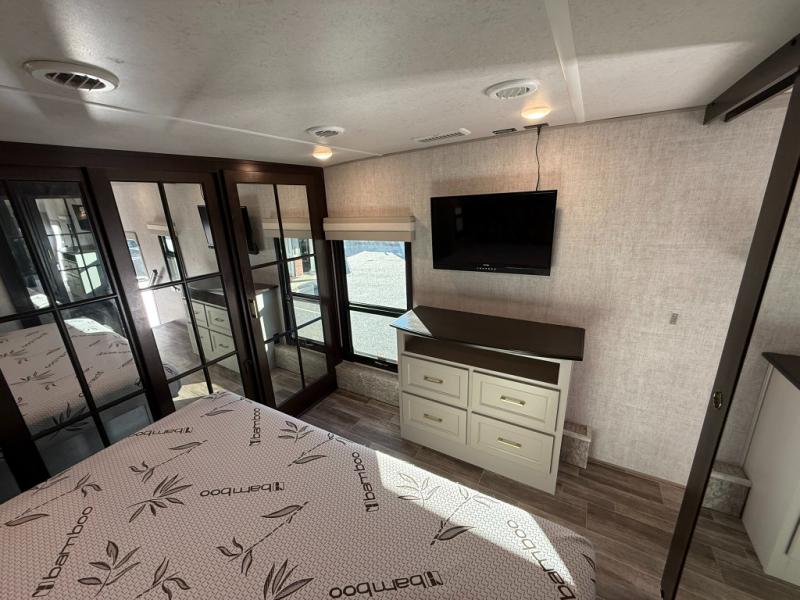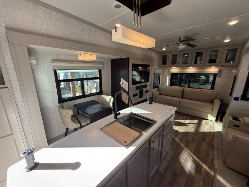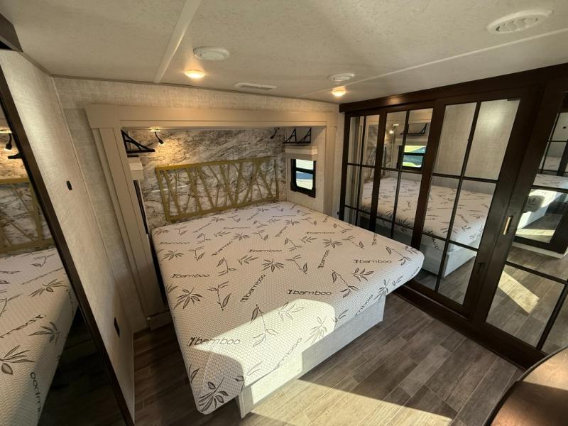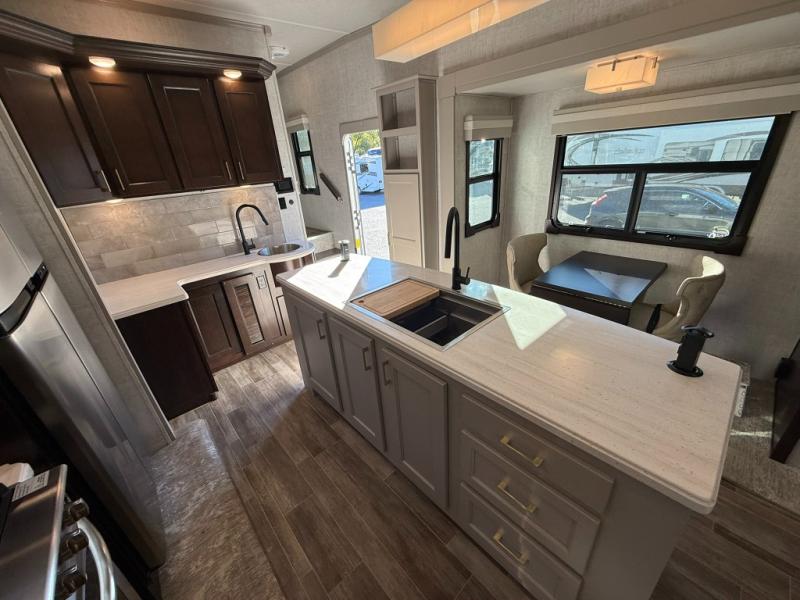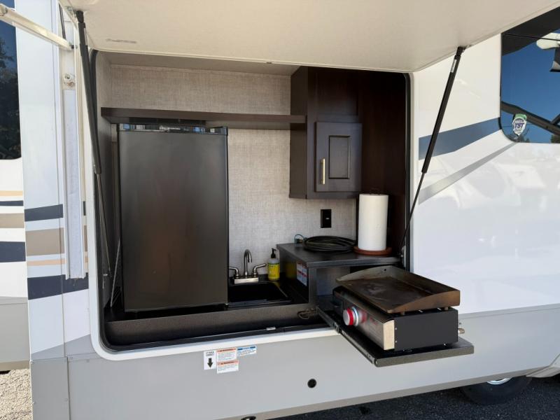 If you like to cook with the choice of being outside or inside, take a look at this Columbus 1492 fifth wheel. When it is time for breakfast, the kitchen offers plenty of floor space thanks to the opposing slides in this area, and there is extra counter space on the center island with a large stainless steel sink and an additional countertop with a prep sink. You might even like to cook the bacon at the outside kitchen. All the furniture, including the power theatre seats with USB charging, provides a place to relax and enjoy your drinks while looking outside at the beautiful view or watching the 50" TV. After shopping in the local town square or riding your bikes on the trails, the memory foam mattress in the master bedroom will be waiting for you.