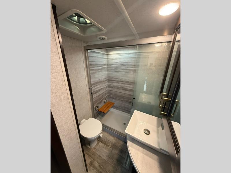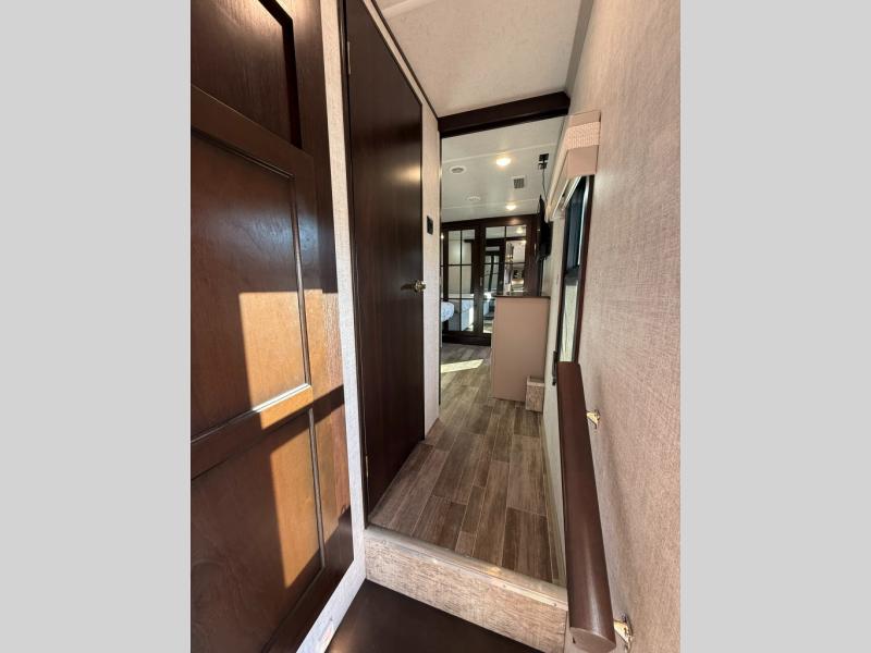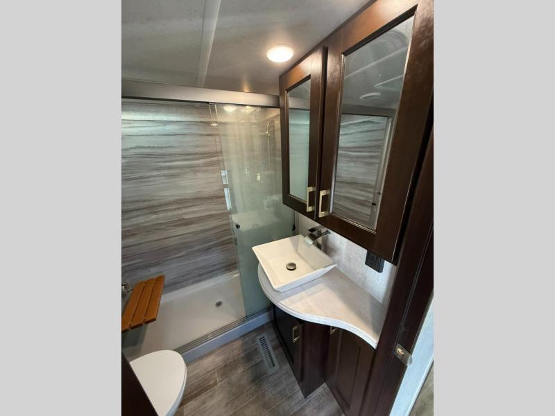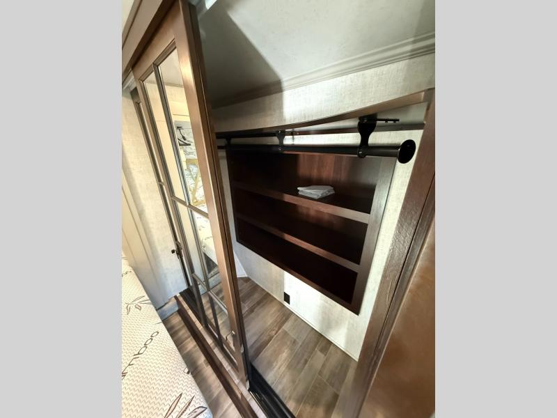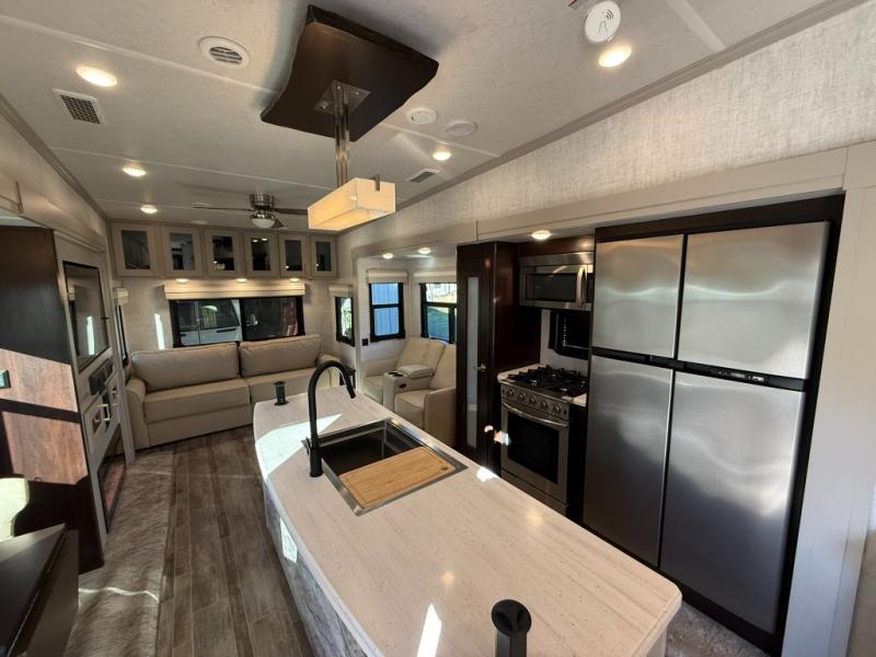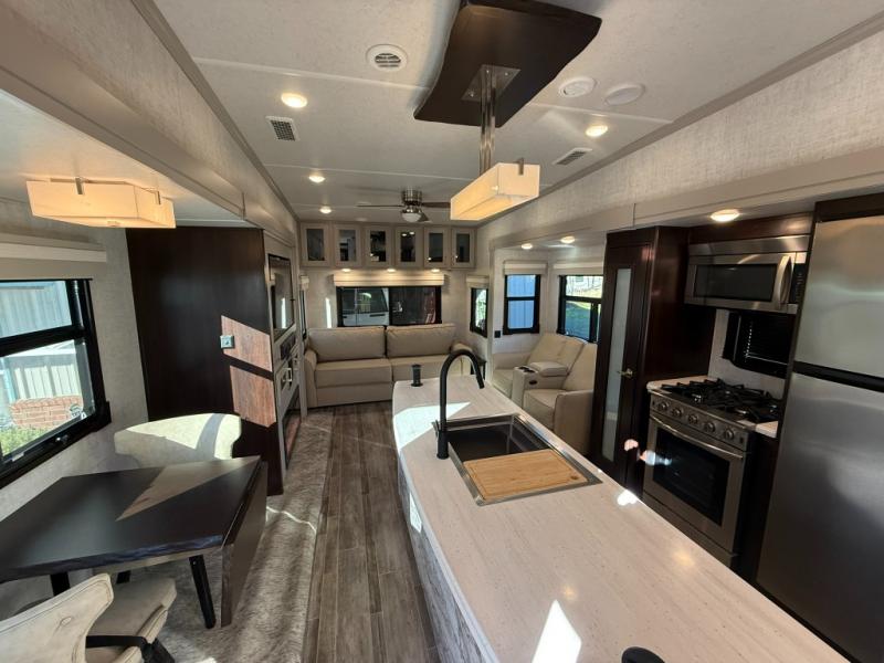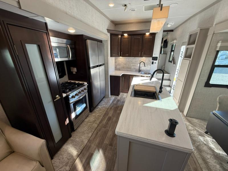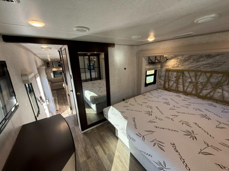 If you like to cook with the choice of being outside or inside, take a look at this Columbus 1492 fifth wheel. When it is time for breakfast, the kitchen offers plenty of floor space thanks to the opposing slides in this area, and there is extra counter space on the center island with a large stainless steel sink and an additional countertop with a prep sink. You might even like to cook the bacon at the outside kitchen. All the furniture, including the power theatre seats with USB charging, provides a place to relax and enjoy your drinks while looking outside at the beautiful view or watching the 50" TV. After shopping in the local town square or riding your bikes on the trails, the memory foam mattress in the master bedroom will be waiting for you.
