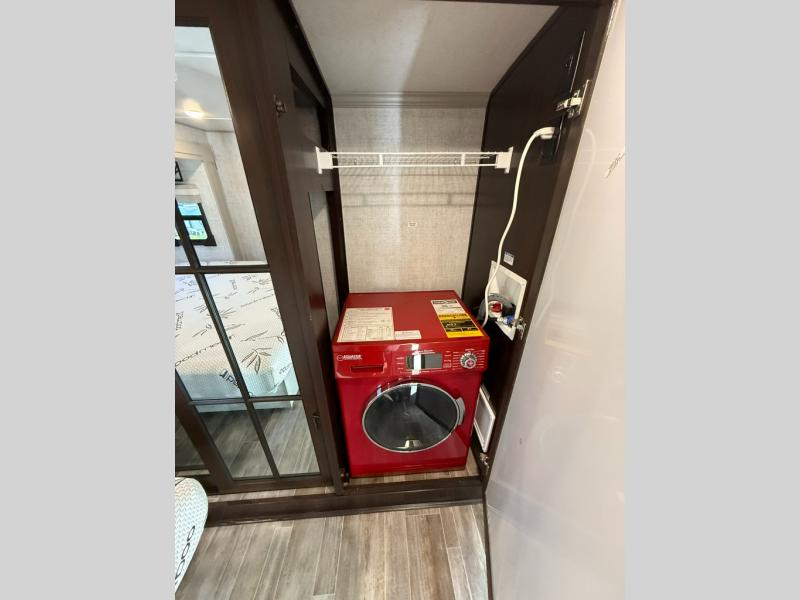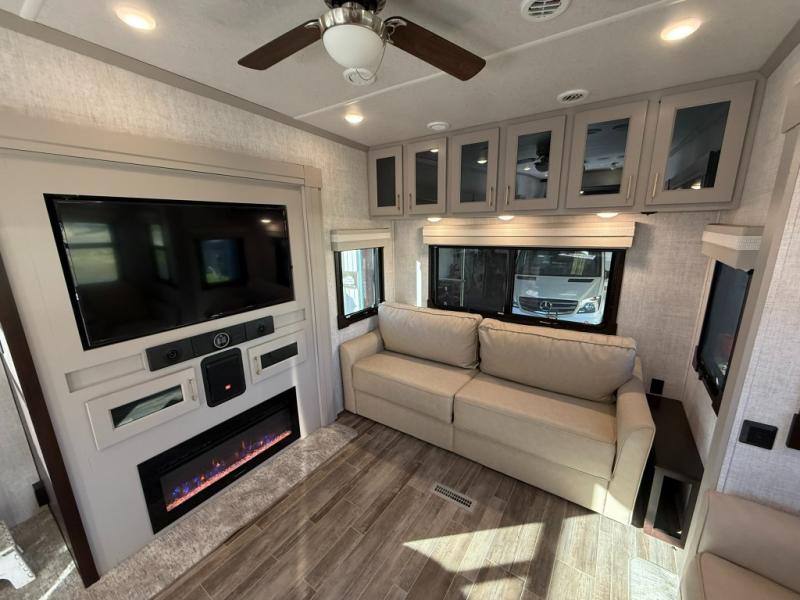Do you enjoy vacations that are full of comfort, convenience, and class? The Palomino Columbus 1492 fifth wheel delivers a residential escape that can be used for any new adventure you have planned. The all-welded aluminum-frame superstructure has a snap-in ceiling molding, 12V heat pads on all holding tanks, 16" wheels with nitro-fill tires, large frameless tinted windows, residential crown molding, and crack/mold/mildew-resistant flooring. On the exterior, you'll find a heated utility convenience center, an outside shower, an outside AM/FM/Bluetooth receiver with USB port, and a full-view entry door with window and screen door. Plus, there are some modern features that will really seal the deal, like the Wi-Fi Booster with 4G LTE capability, the JBL sound system, the preparations for a washer/dryer, the electric fireplace, and the preparations for Go Power Solar.
