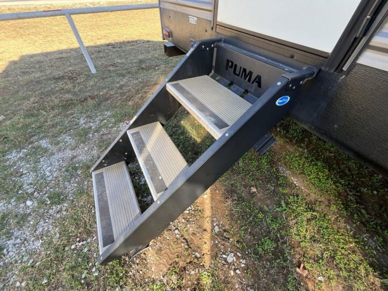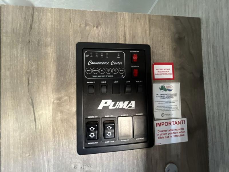 You know it's a great day when it starts with a Palomino Puma travel trailer, fifth wheel, or toy hauler because nothing else is better suited for adventure! There is a Puma for every lifestyle, and there are plenty of features that will enhance each of those lifestyles too. The Puma's construction is better built for lasting performance. The Puma has an AlphaPly roofing membrane, a King HD TV antenna, a smooth, aerodynamic radius front metal with bold exterior graphics, residential-grade carpet with pad on slide outs, and a 5/8" Araucoply plywood floor decking. The Puma also comes packed with value since it gives you the features you need while traveling, like an electric awning with LED lights, preparations for WiFi, a Bluetooth stereo, an enclosed underbelly, an outside shower, and exterior speakers. Plus, the roller shades will help you keep the interior dark and private when you need it to be.