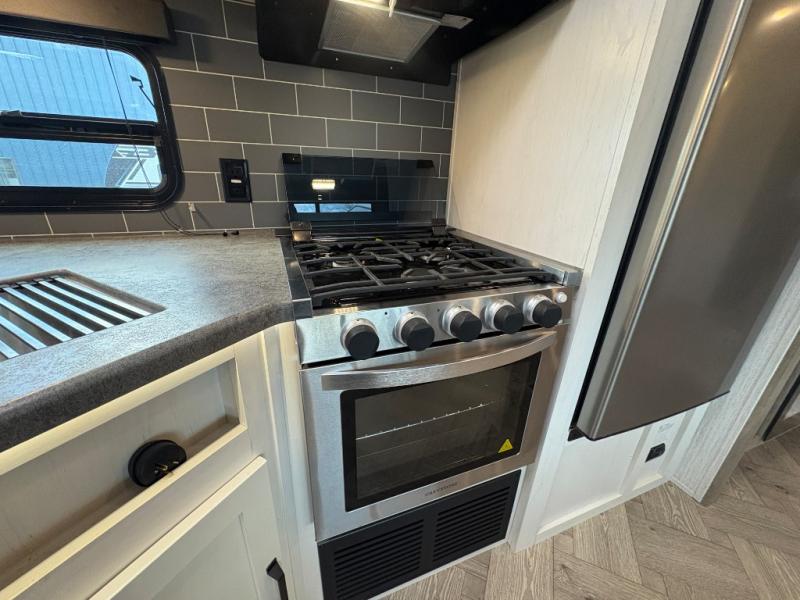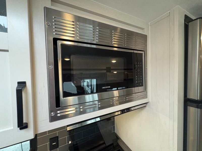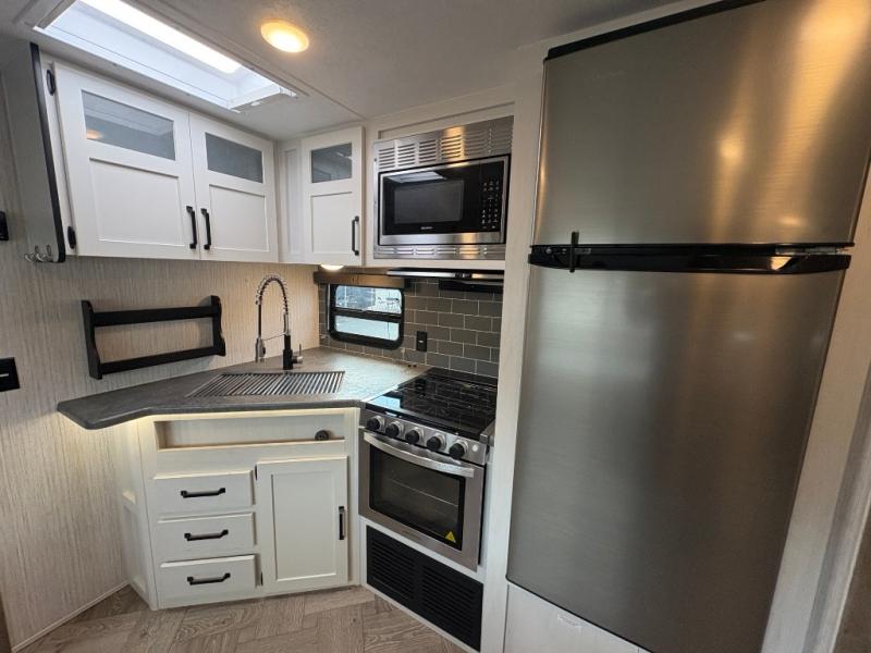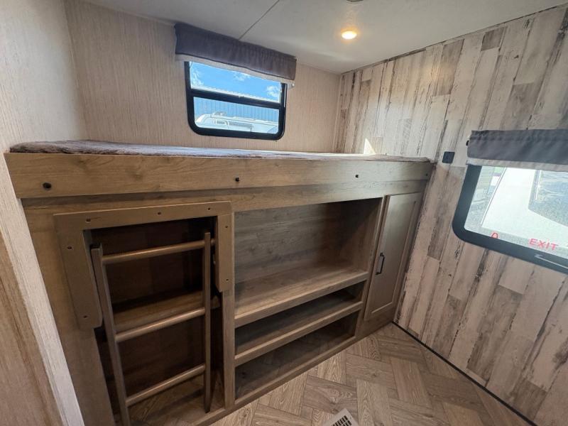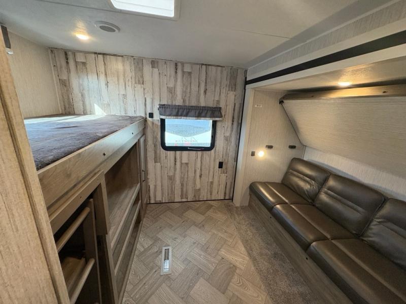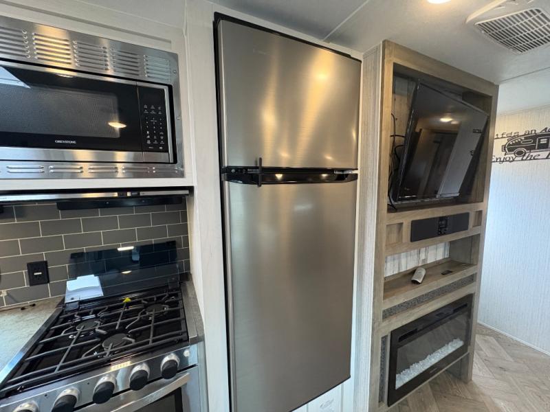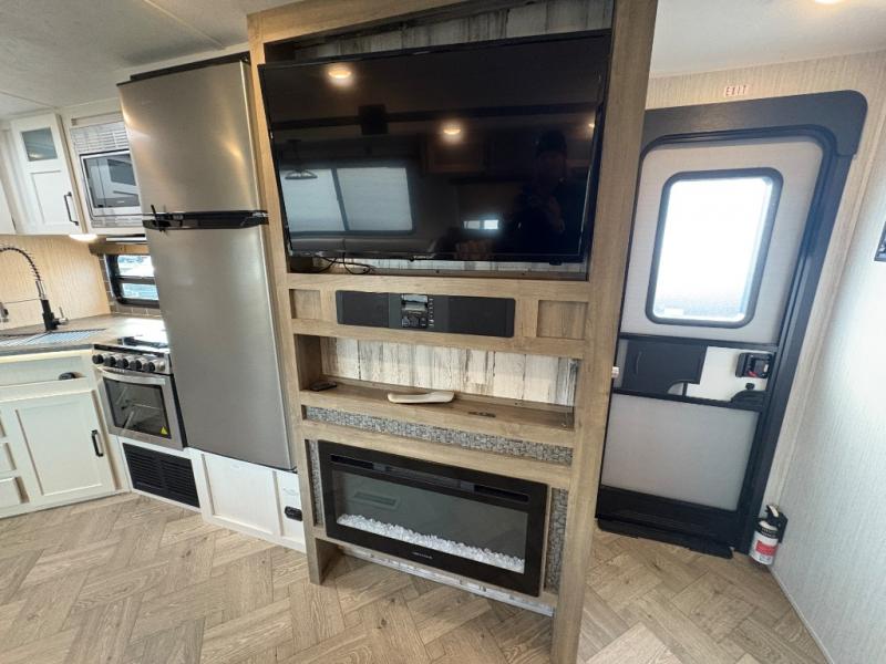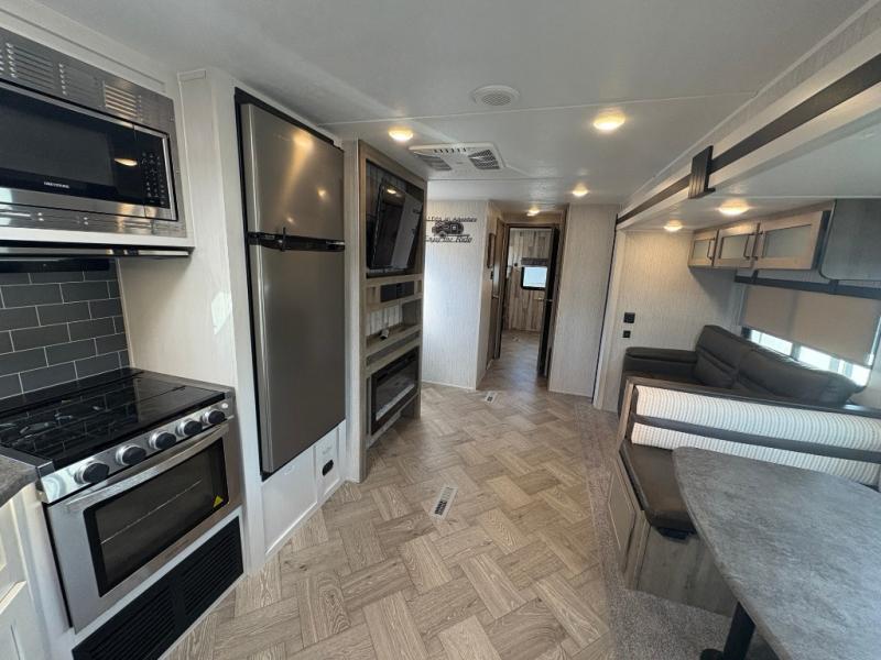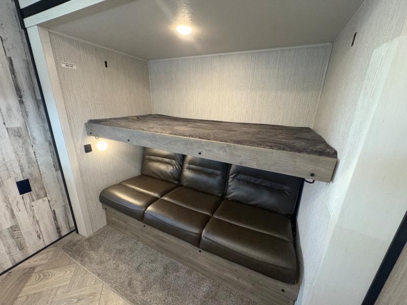 Don't miss out on this decked-out Puma travel trailer! It features two entry doors to promote a smooth flow of traffic in and out of the unit, plus a rear bunkhouse that your kiddos are sure to love. Inside the private bunkhouse there is a sofa for the kids to relax on, two bunk beds, and their very own entertainment center. Making meals will be a breeze in this kitchen with all the appliances, including the stainless steel residential refrigerator for storing your perishables and the pantry for your dry goods. You also have a full bathroom with a 34" x 34" radius shower so that you can get cleaned up after every adventure.